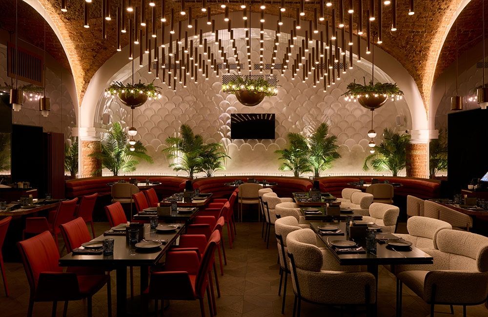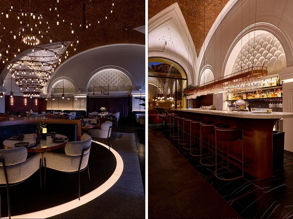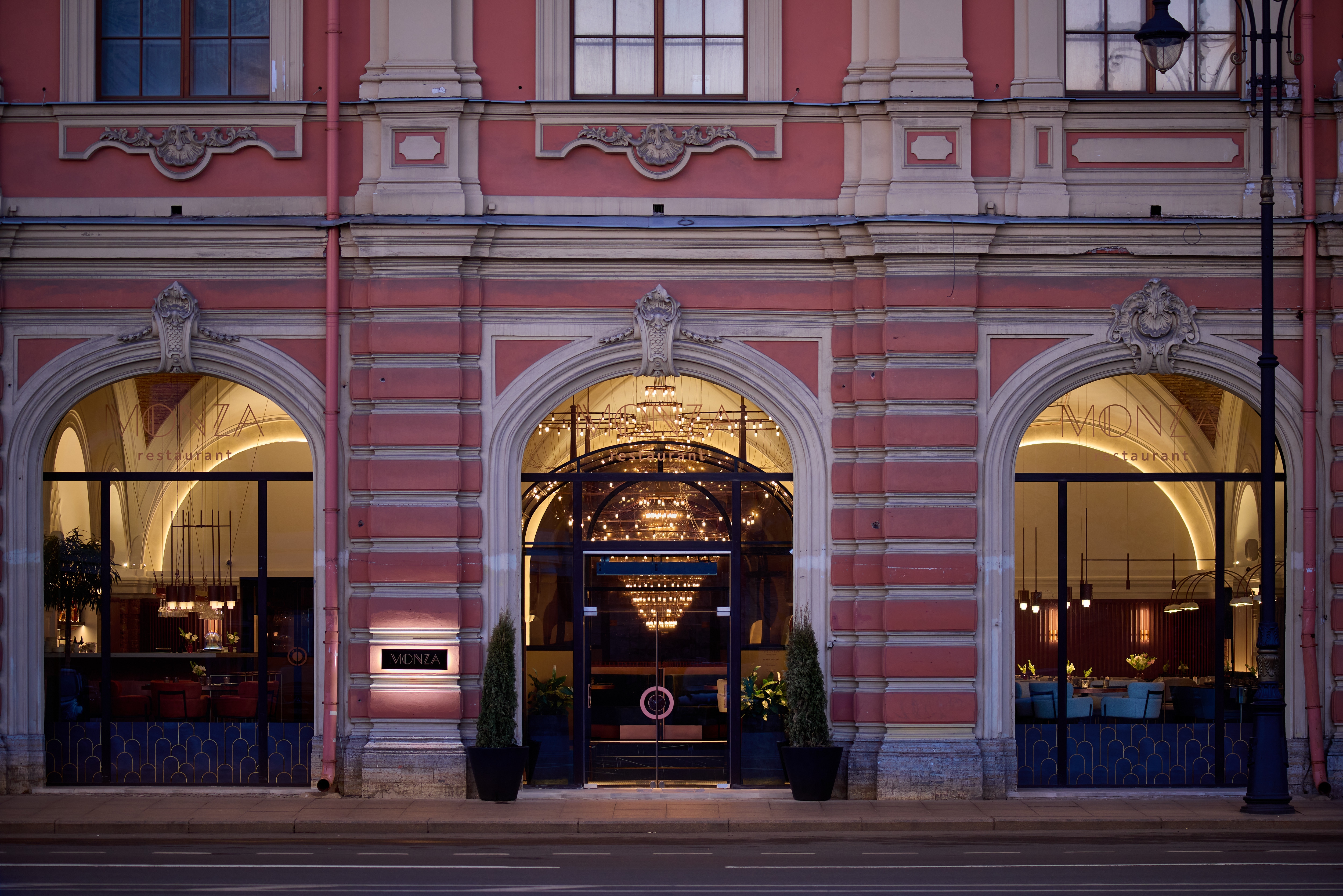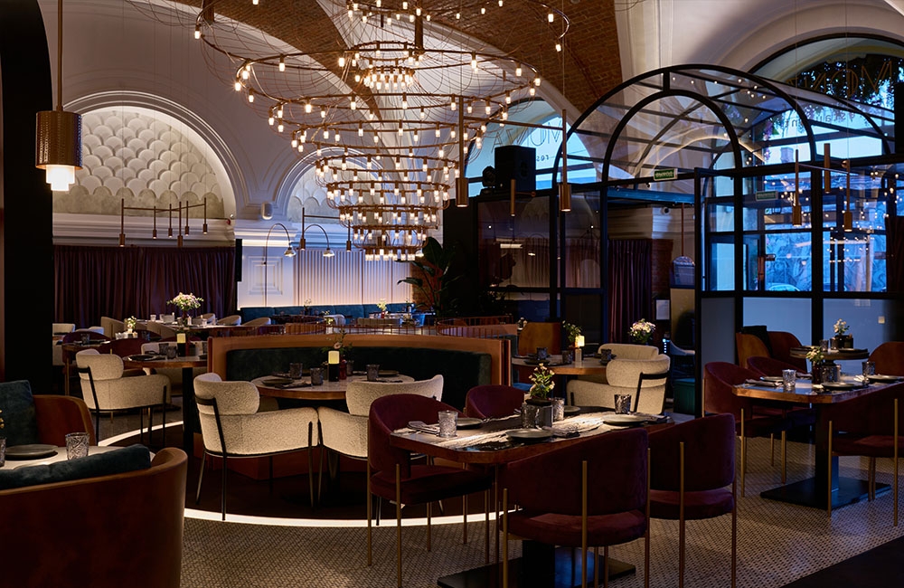 Monza restaurant is located in Saint Petersburg in a former royal carriage museum. The building retains its authentic features, such as arched panoramic windows and vaulted ceilings.