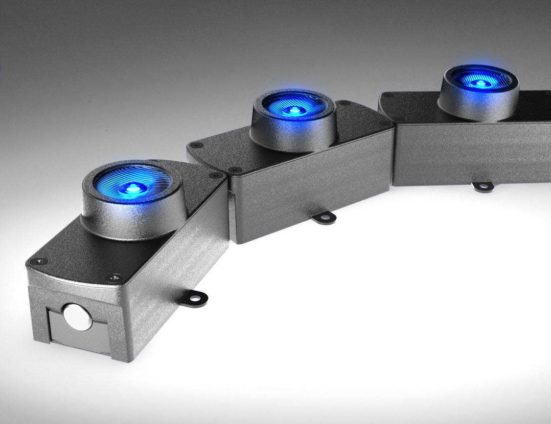 The 3D LED Flex 40 System with mini colour-blending optics is a high-power, modular, 3D Flexible LED linear lighting system, developed for use in a wide variety of architectural lighting projects requiring cove lighting, wall grazing and wall wash lighting where the building surfaces are non-linear with curved profiles and facades. The patented articulated ball-joint system joining the heat sinks allows the system to bend and twist in 3 dimensions. IP20, IP66, and IP68 versions are available.