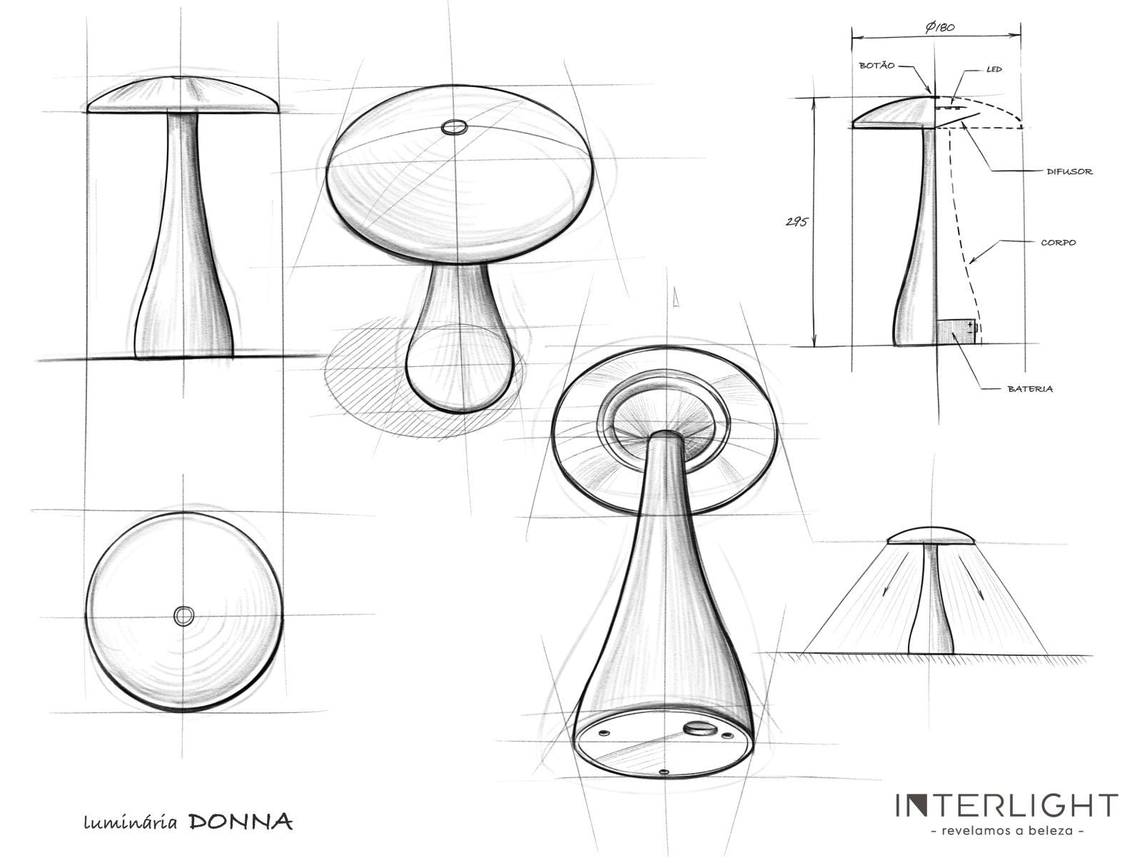 donna, woman in Italian, is a mobile lamp designed in homage to feminine elegance and freedom. characterized as a table lamp, free of positioning with battery integration offering cable-free of use, without dependence on electrical supply at the place of use. It uses sustainable materials in a composition, such as aluminum that is recycled, as well as the use of recyclable plastic materials, in addition to durable and recyclable electronic components.