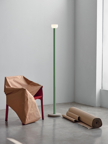 2021 saw the Bellhop narrative extend, with the addition of the Bellhop Floor. This latest iteration adapts the key elements of the existing collection - including the top, which it inverts - to create a more sculptural form and a different quality of light. The character of the new design also derives from its use of striking combinations of contrasting materials and strong colour - concrete, aluminium, glass and a choice of lacquered finishes.
