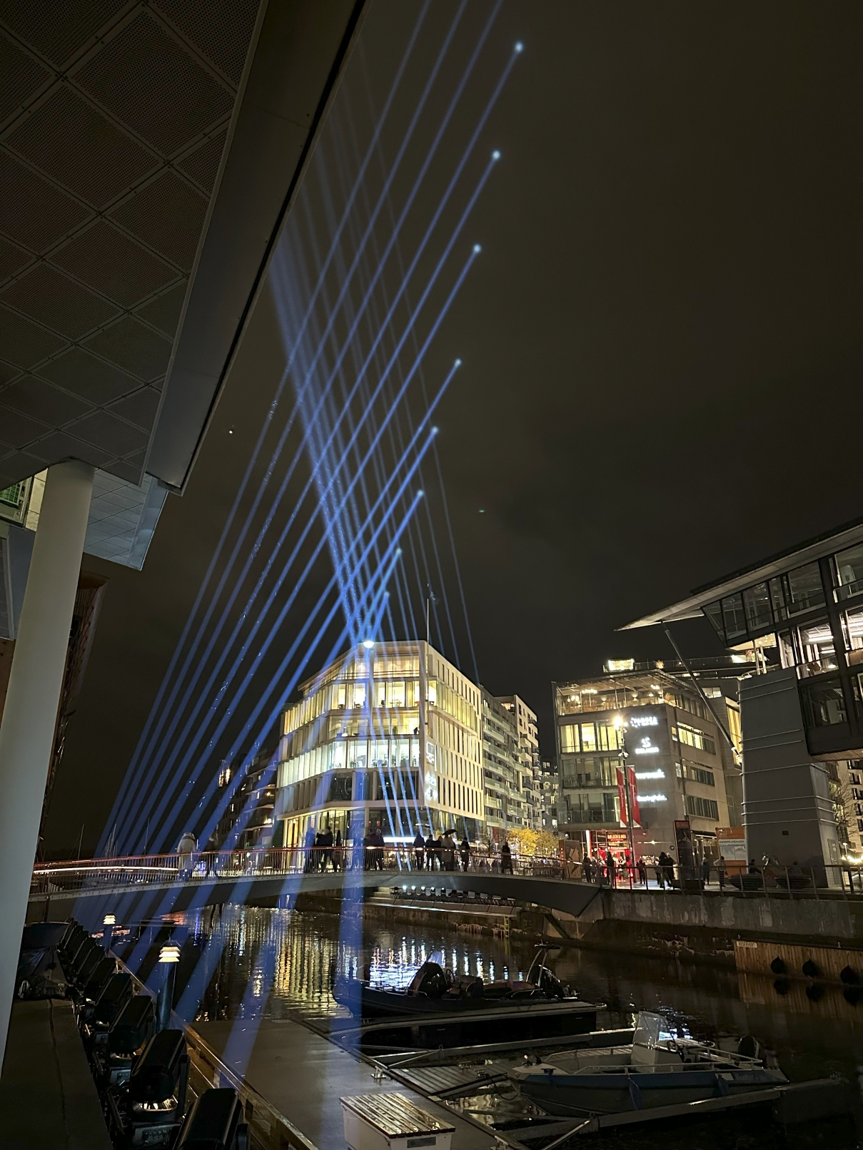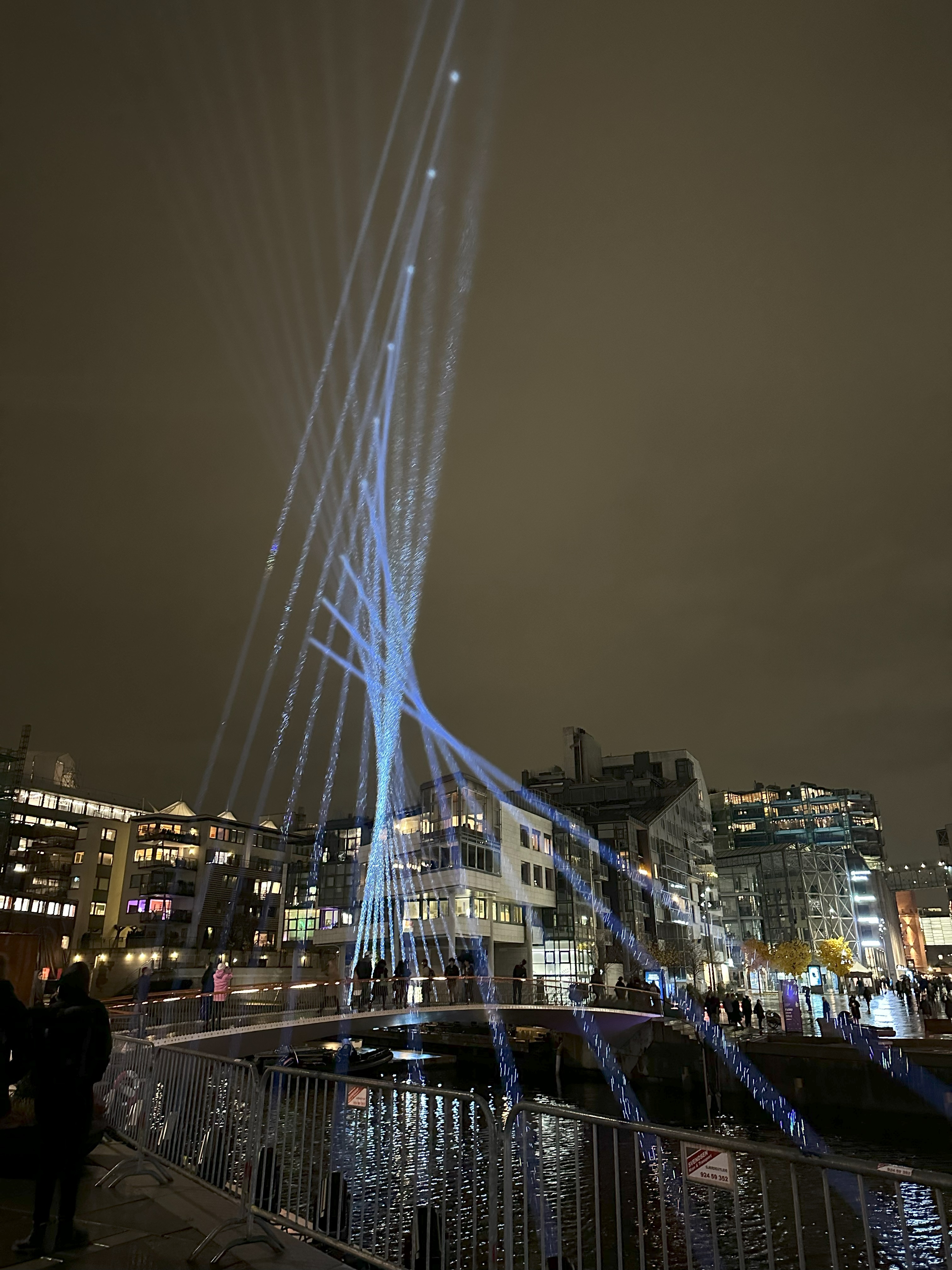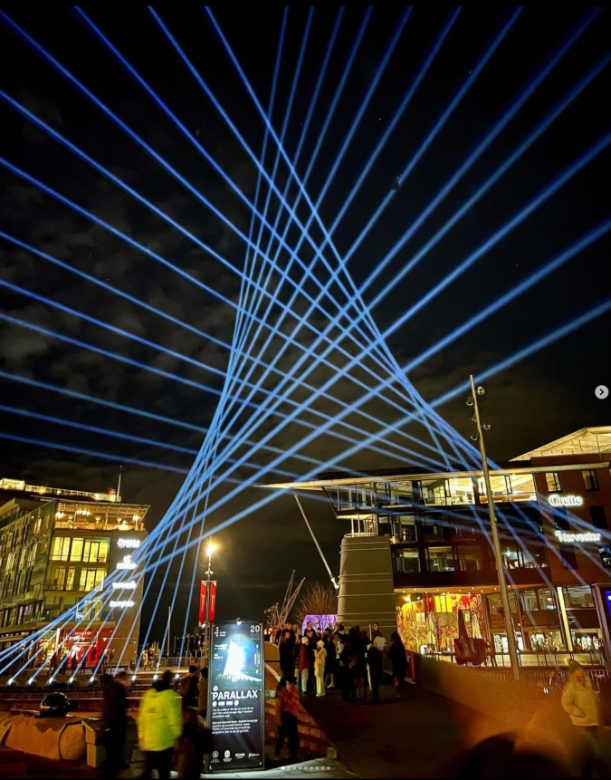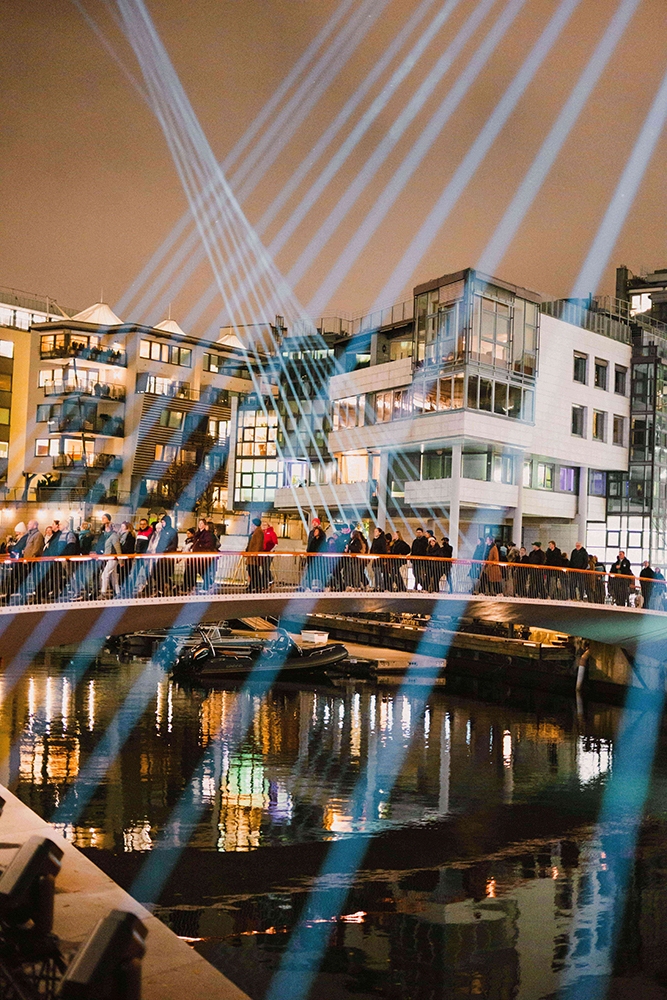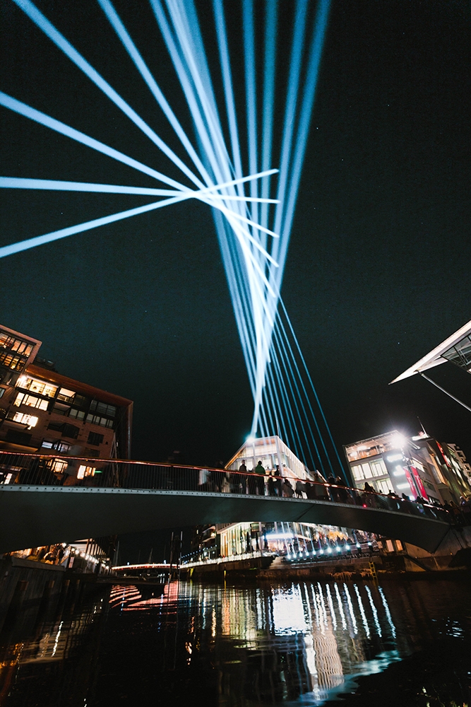 Parallax is the apparent displacement or distortion of an observed object due to the change in position of the observer. The kilometer long light beams create a dynamic spatial presence over the bridge which can be experienced differently from different positions around Tjuvholmen Fjord and Aker Brygge, encouraging the idea to seek new perspectives.