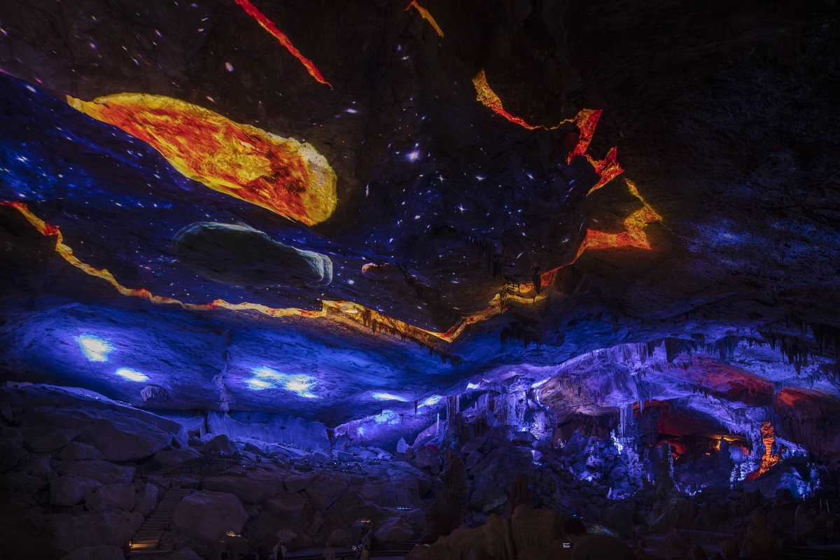 Hall 3 is flat with a large expansive dome yet a few stalactites, so the hall is decorated with iridescent colors and gradients of low-saturated colors, creating a fantastic effect. To enhance the cultural tourism experience, the hall incorporates a naked-eye 3D lighting art showing the forming process of karst landform, helping to popularize science.