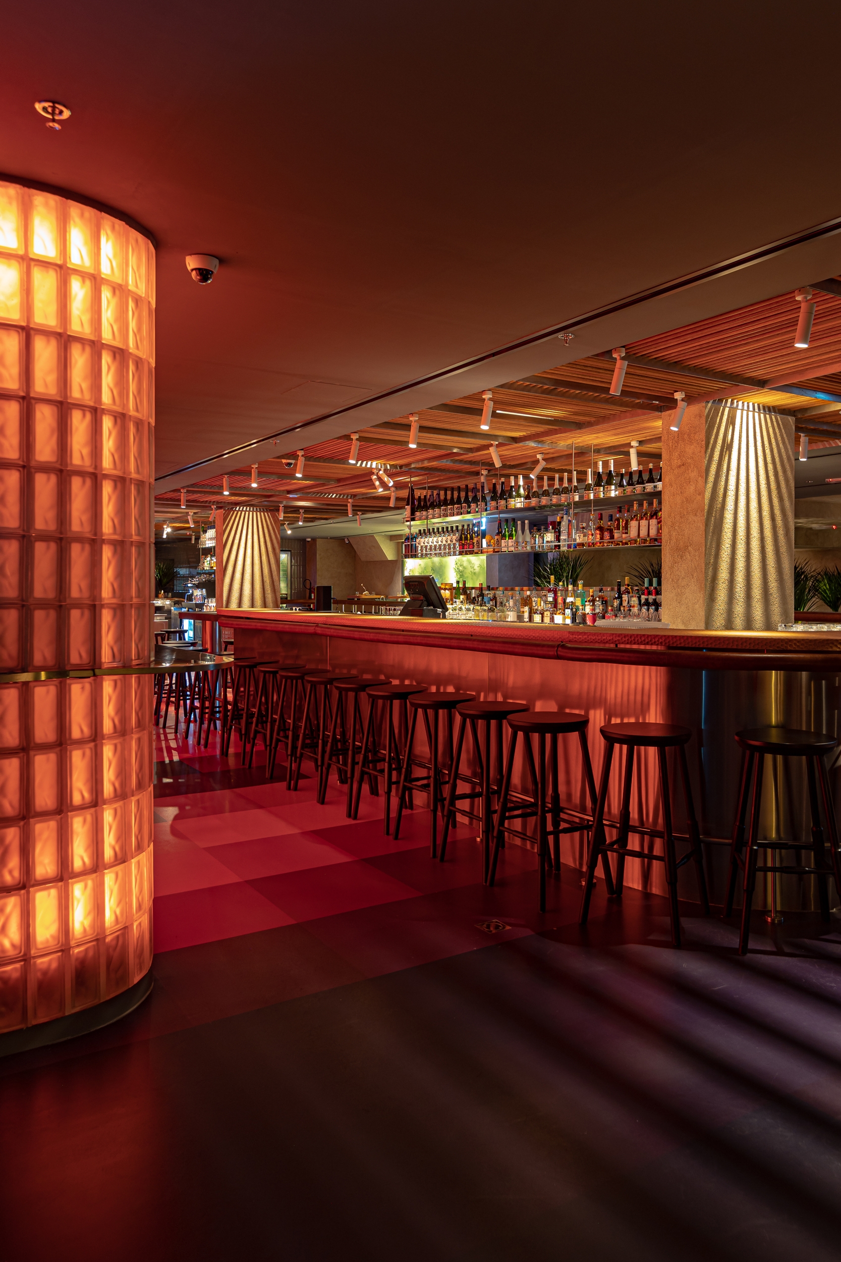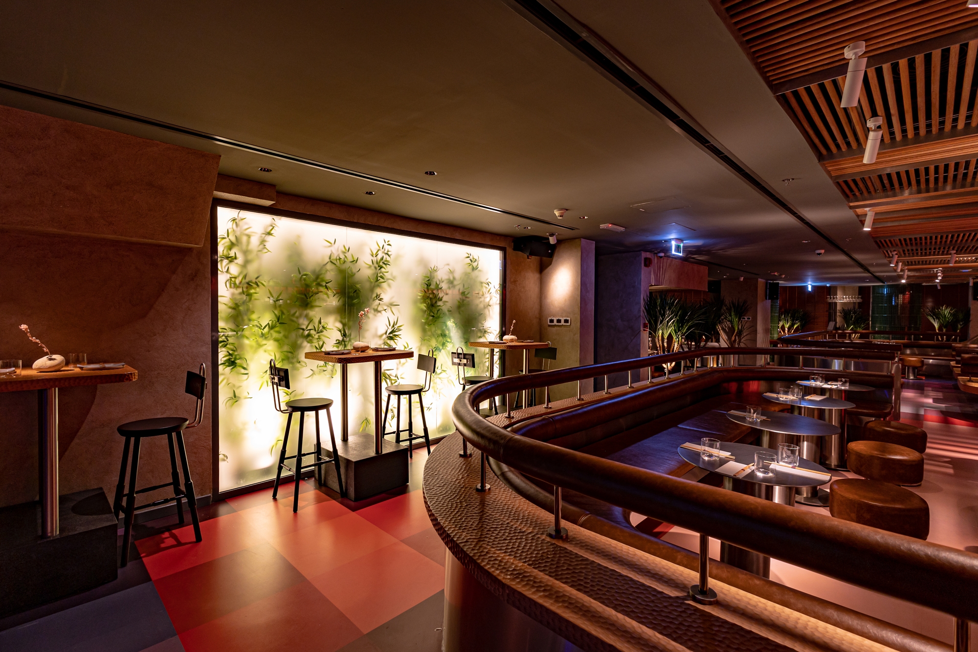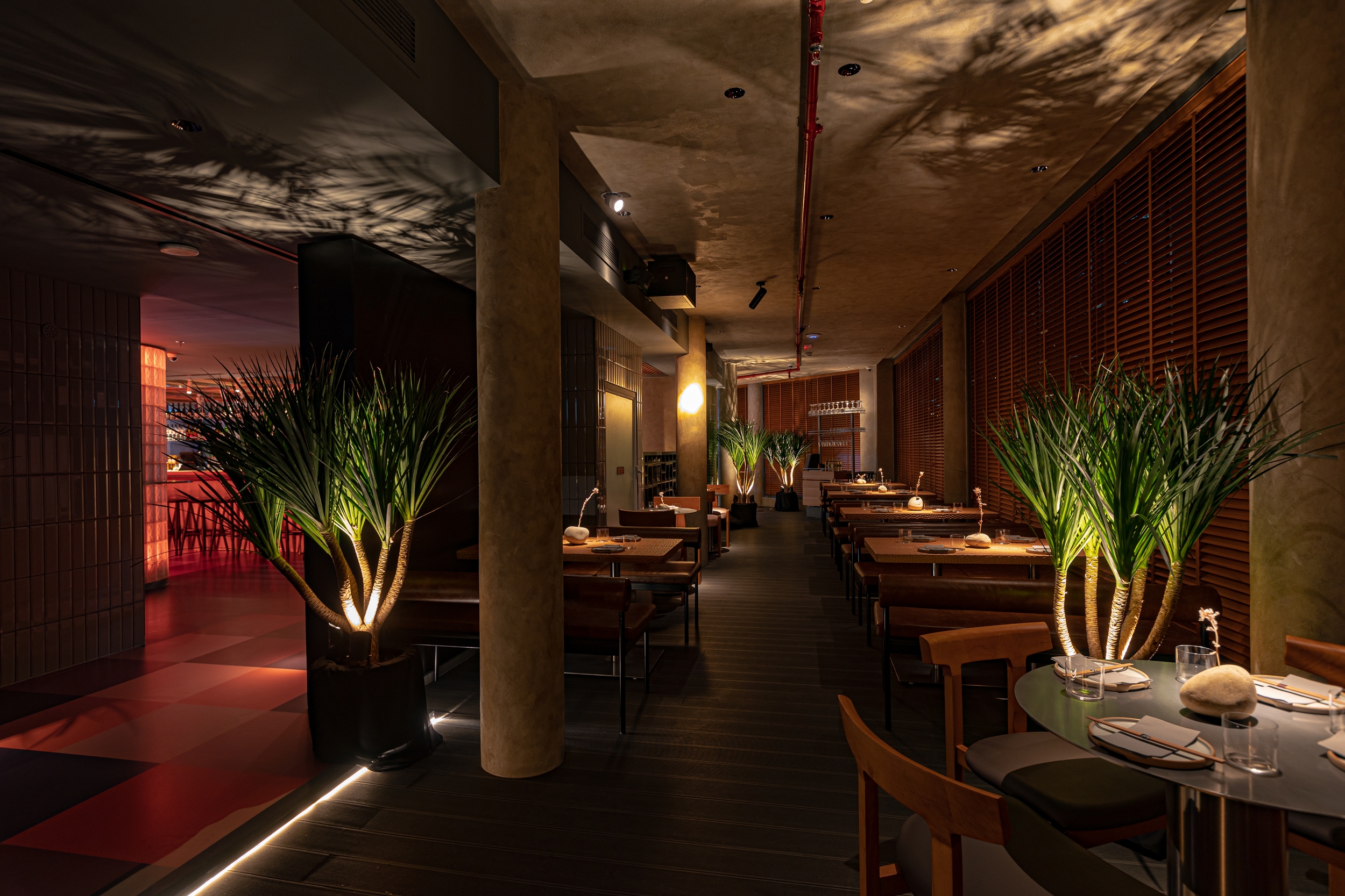 Soon is a restaurant in Dubai inspired by Japanese 1980s aesthetics. We emphasized the atmospheric details of the restaurant with light and geometric shadows, color shades, and halo-caustics, for which we developed a lamp of our production.