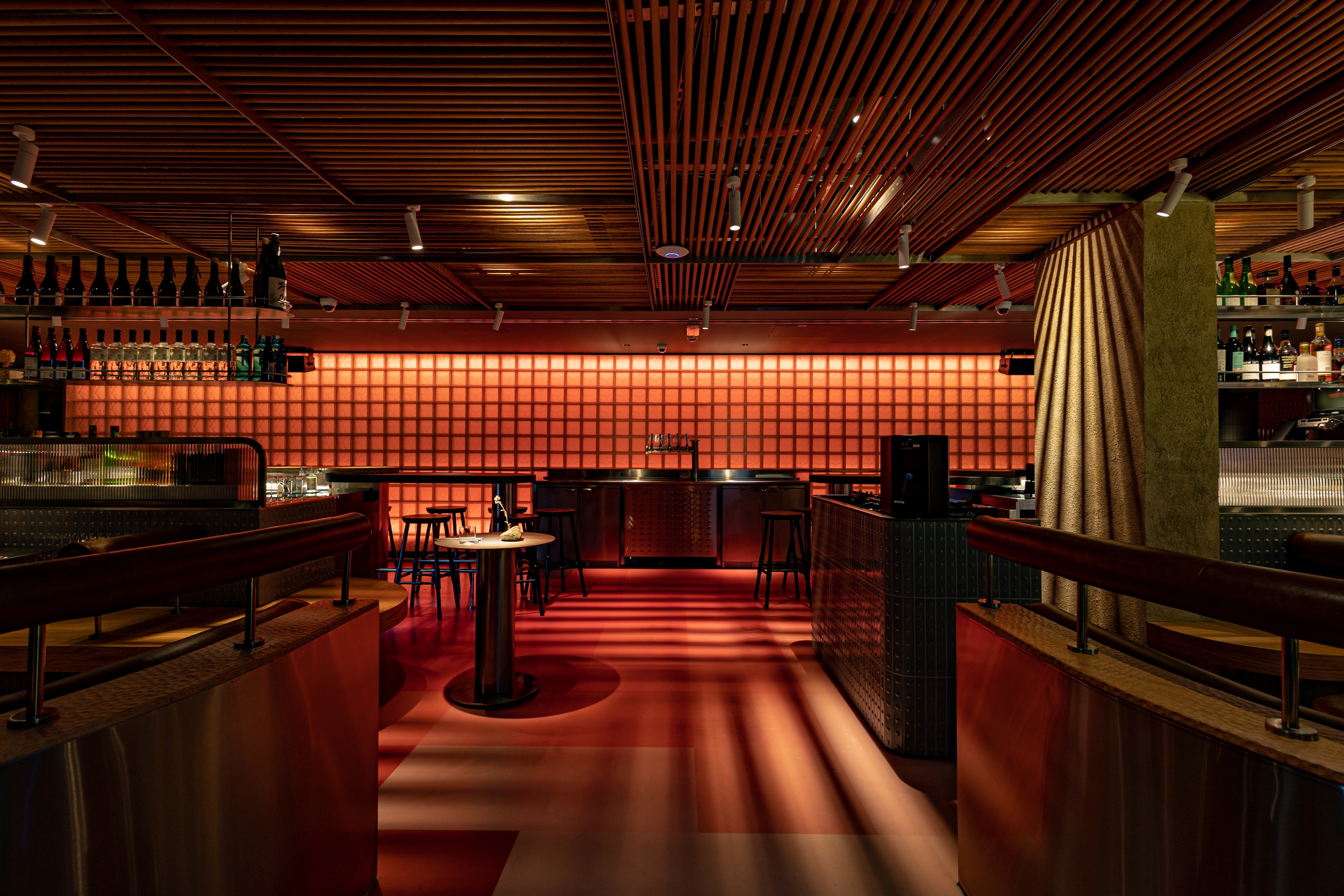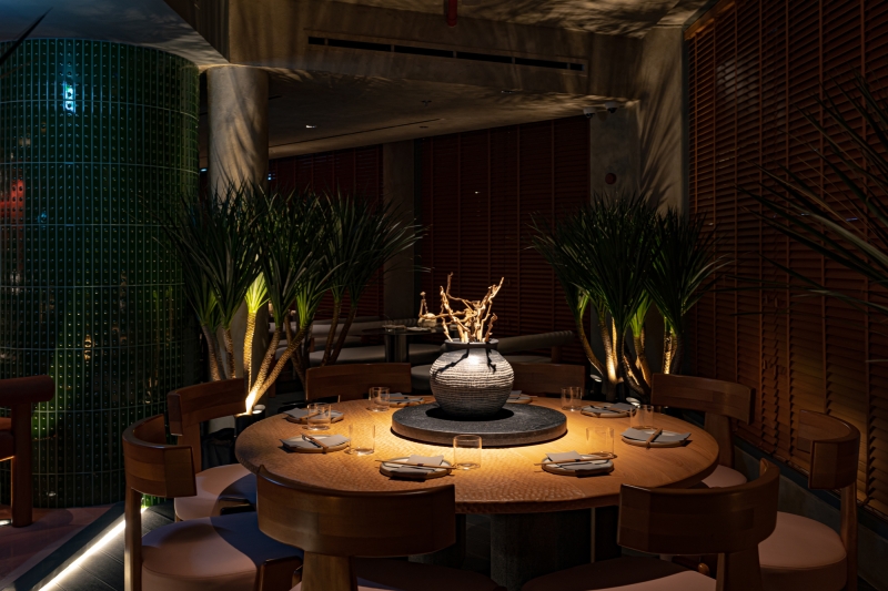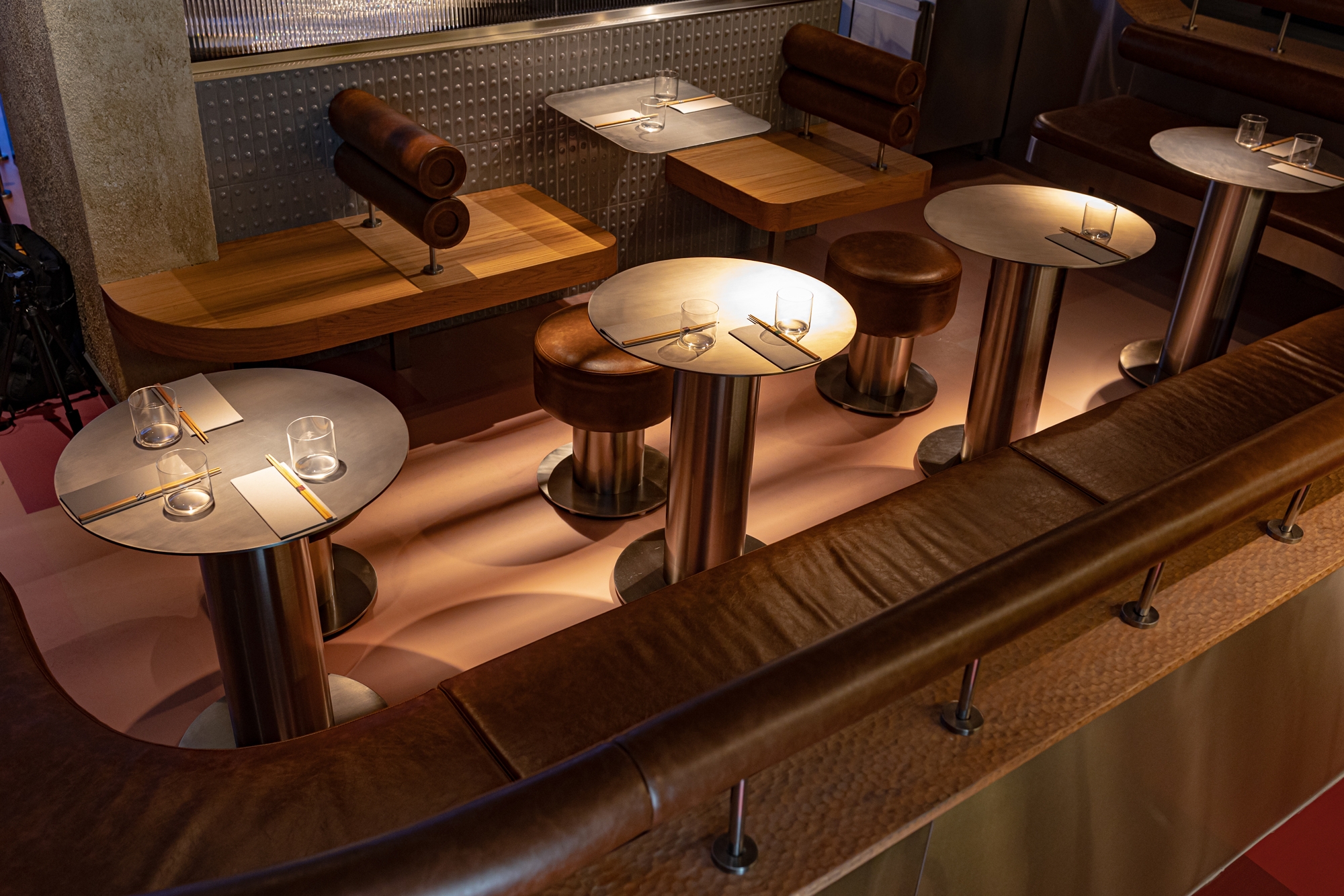 Soon is a restaurant in Dubai inspired by Japanese 1980s aesthetics. We emphasized the atmospheric details of the restaurant with light and geometric shadows, color shades, and halo-caustics, for which we developed a lamp of our production.