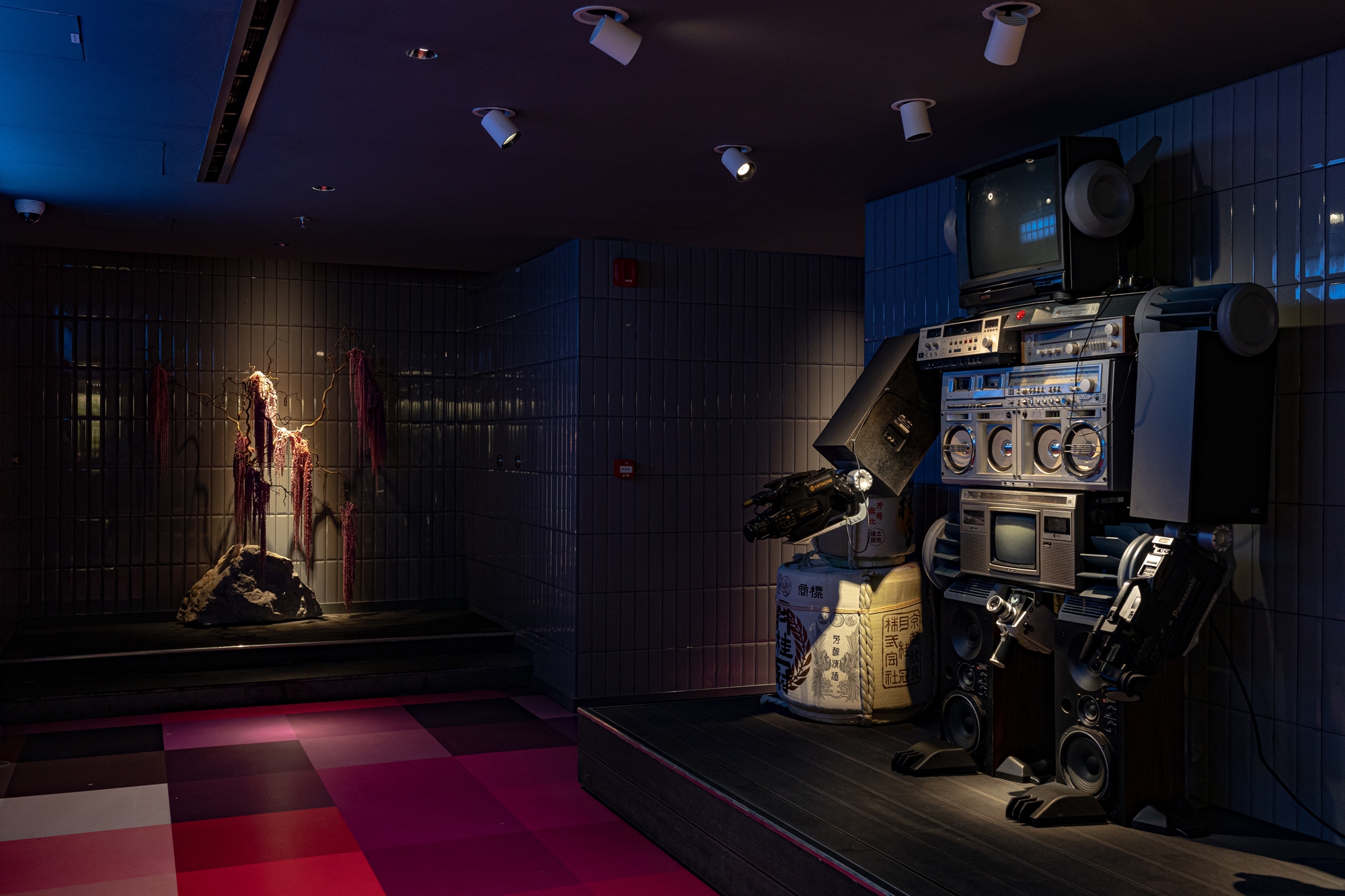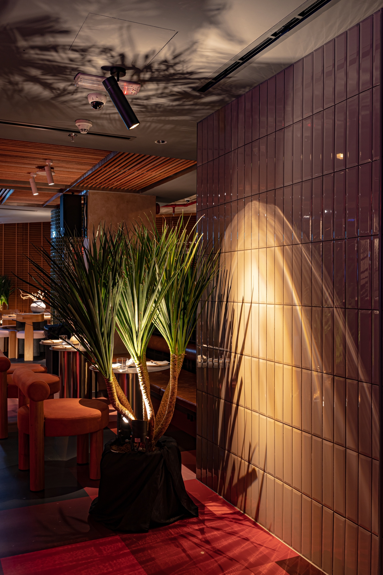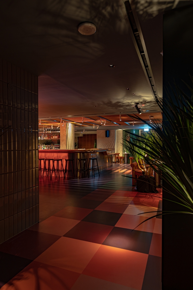 SOON transforms throughout the day with the help of light. We created a complex space with different light accents: Plant shadows, a Caustic halo lamp, a Light box with plants, Shadows from a wooden lattice, and Multi-colored RGB lighting on the glass wall.