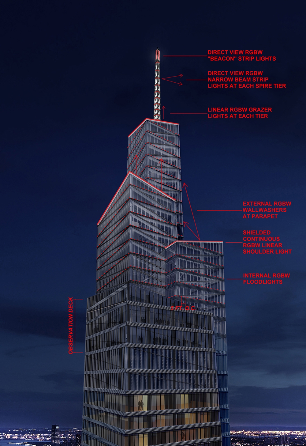 The 3 crown volumes glow internally with RGBW LED floodlights mounted at each level to wash the mullions and structural components. Texture is created with high powered, narrow beam floodlights mounted at roof setbacks to highlight the exterior façade mullions of the uppermost “snorkel” volume. A continuous parapet mounted strip light outlines the top of each crown volume to emphasize their sloping, non-directional forms. The 4-sided pyramidal white metal spire is grazed with light to showcase the subtle diagonal structure. An array of direct view striplights ring the top of the spire to form a beacon of light visible from all directions in and around the city.