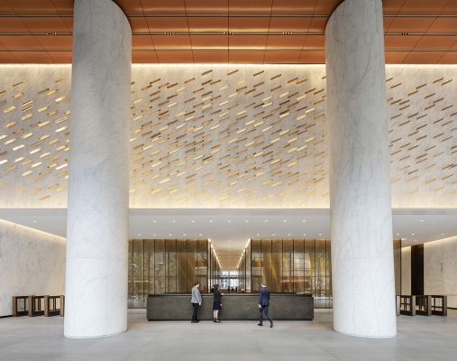 Uplighting of the terracotta soffits blurs the line between exterior and interior. The lobby ceiling and art wall are strategically lit from the top of the entry portal. Discreet downlights live within a narrow reveal in the terracotta panels. Grazers wash the wall to float the suspended bronze flecks while linear lights in front create shimmer on the panel material. The overall piece is front lit with projectors. Elevator lobbies glow from luminous light coves and accentlights.