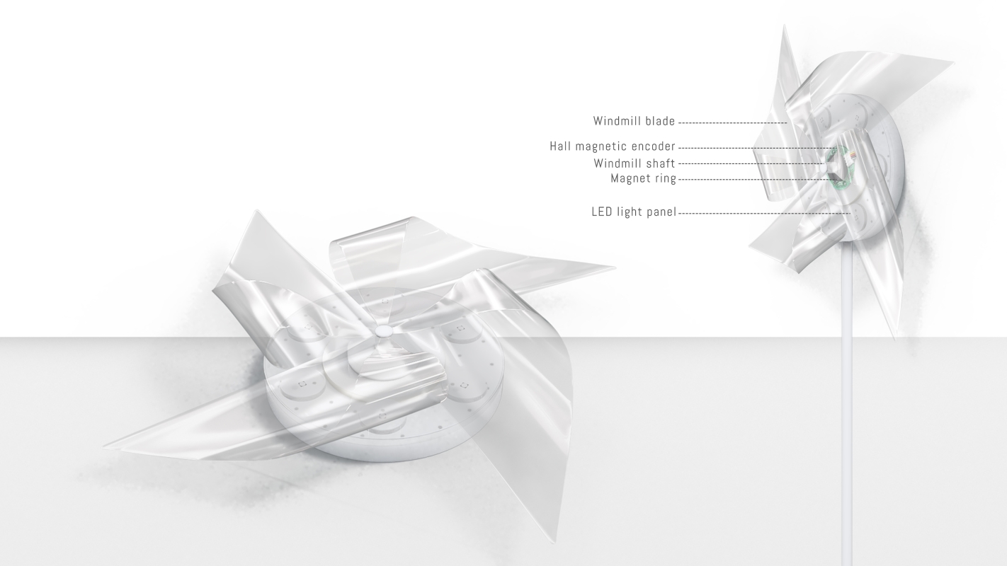 Entry DescriptionWindmill lamp is an outdoor landscape lamp composed of a windmill, a rotating Hall magnetic encoder, and circular LED lights. When night falls, the windmill will emit colorful lights, creating a rich visual enjoyment for the park landscape. When the wind comes, the windmill generates different rotational speeds according to the size of the wind, and the light emitted by the lights also dances with the rotation of the windmill. The speed is recognized by the decoder and transmitted to the light, generating various color changes from orange to purple. The faster the speed, the colder the color.
