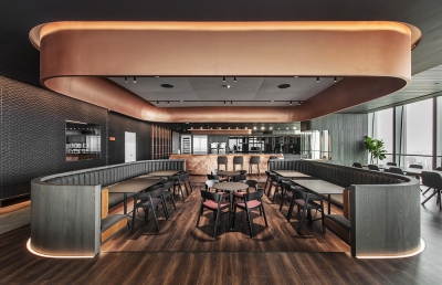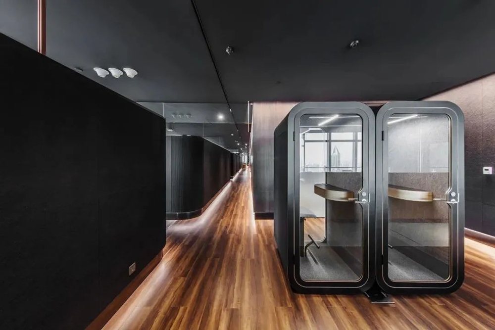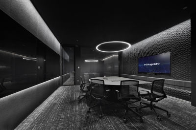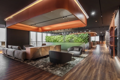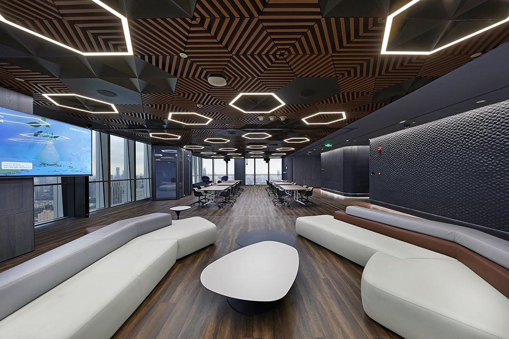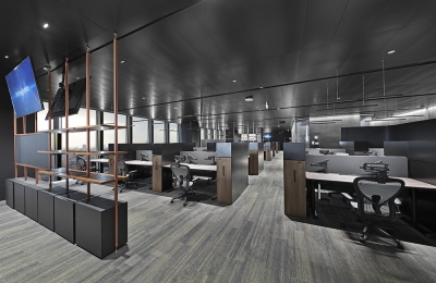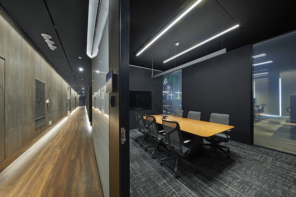 The general lighting is kept at a low level. LED strips are concealed within skirtings to illuminate circulation paths. Despite an overall subdued environment, the lighting level at workstations is over 500 lux to ensure work productivity. Lighting is soft for best visual comfort. Glare is minimized through the use of shielded suspended fixtures incorporated with sound-absorbent panels for acoustic control.