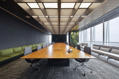 In meeting spaces, dual-lighting scenes are incorporated. One for face-to-face meetings where lighting is limited at desks for a calm and controlled lighting environment. The latter is set for video conferencing (VC), where soft light illuminates the entire room, thus minimizing lighting contrast for the best VC performance.