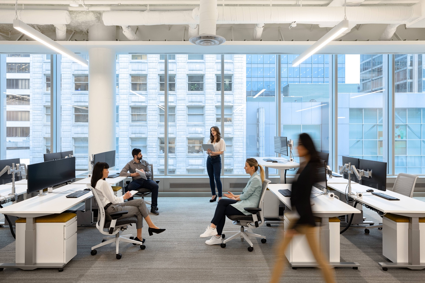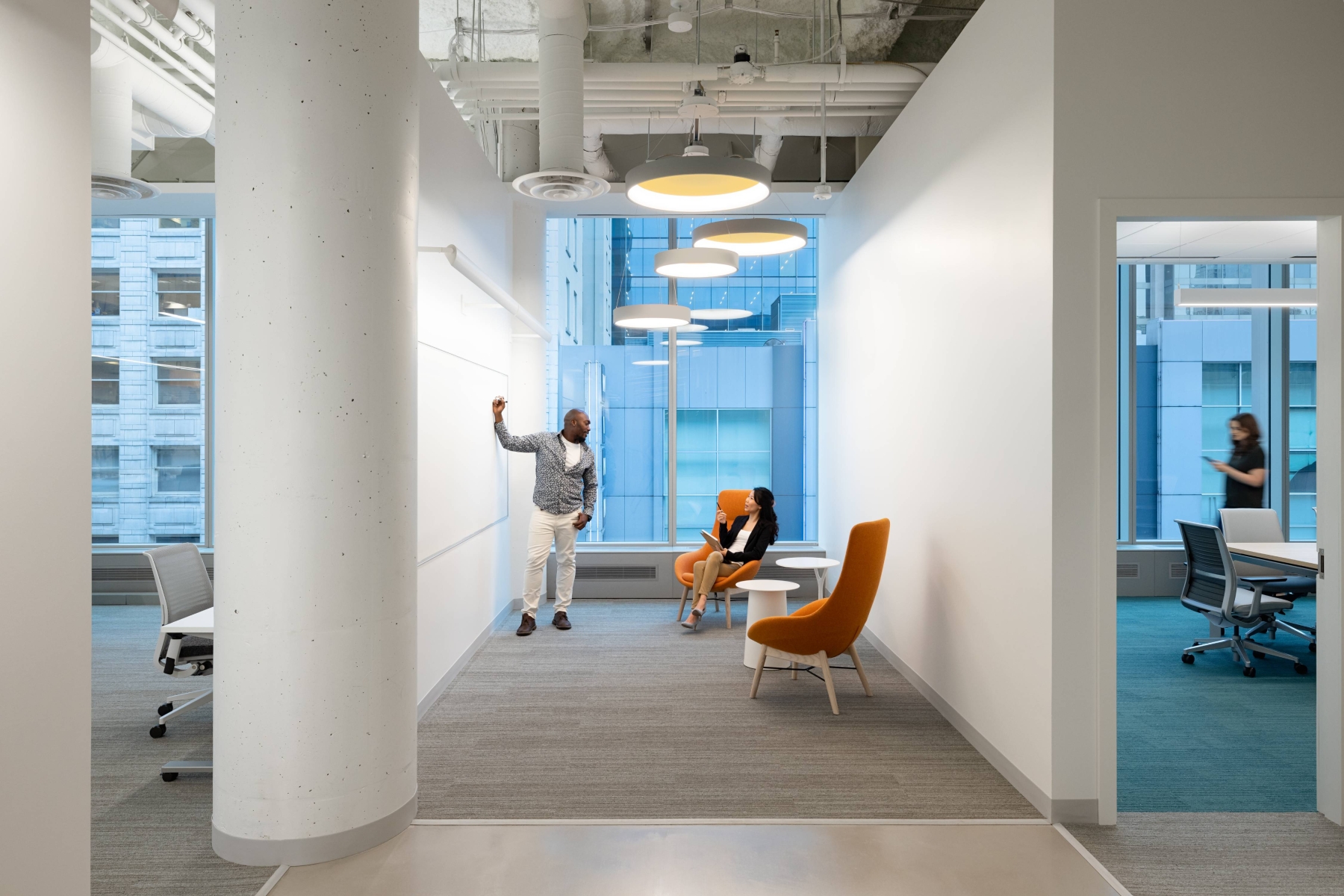 Our layout ingeniously utilized the upward glow of these luminaires, creating a softly illuminated backdrop that added depth and volume to the ceiling. Positioning luminaires directly over work surfaces reduced their count and managed glare. Varying wattage and beam spreads in densely arranged desk areas surpassed energy codes while ensuring effective lighting. This innovative strategy enabled additional illumination elements, such as scrum areas, to be optimally lit for team meetings.