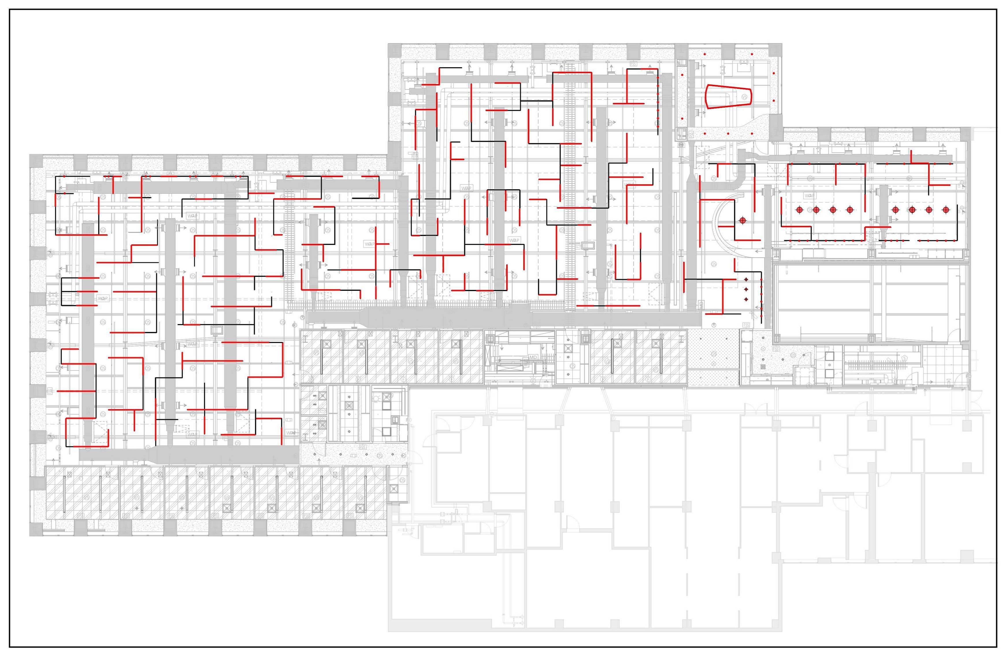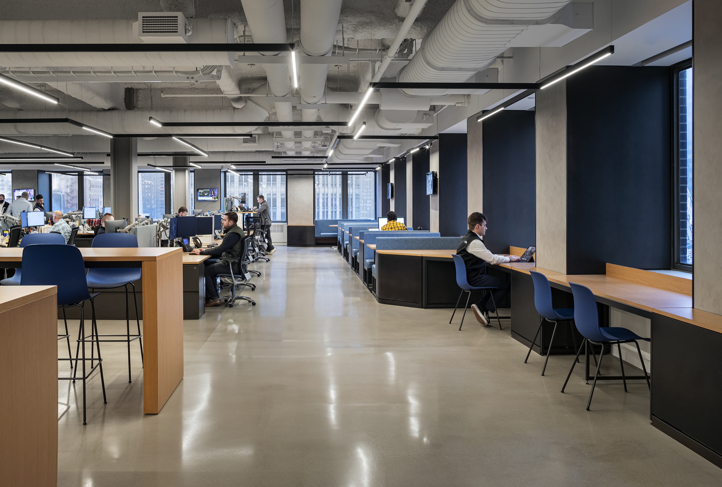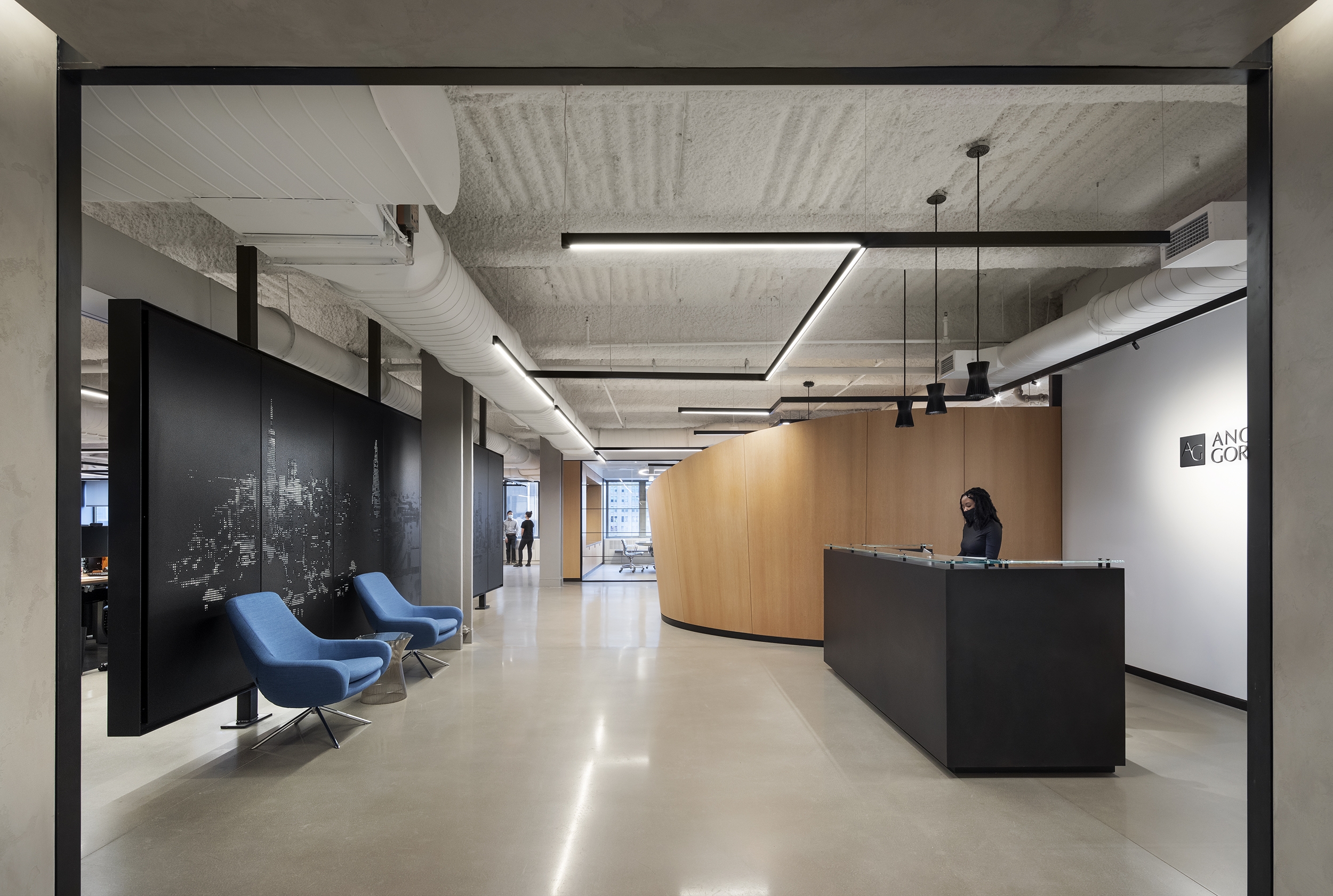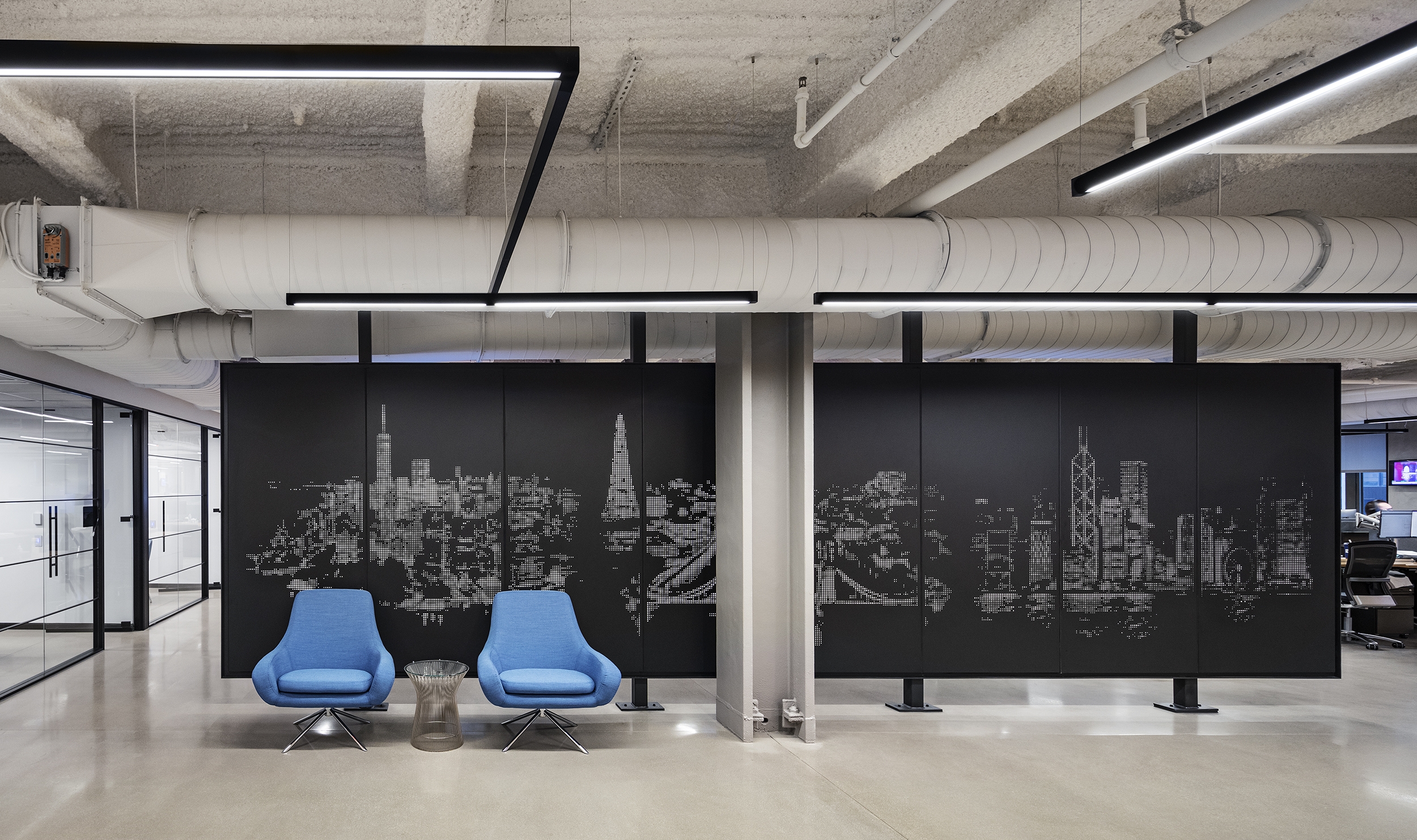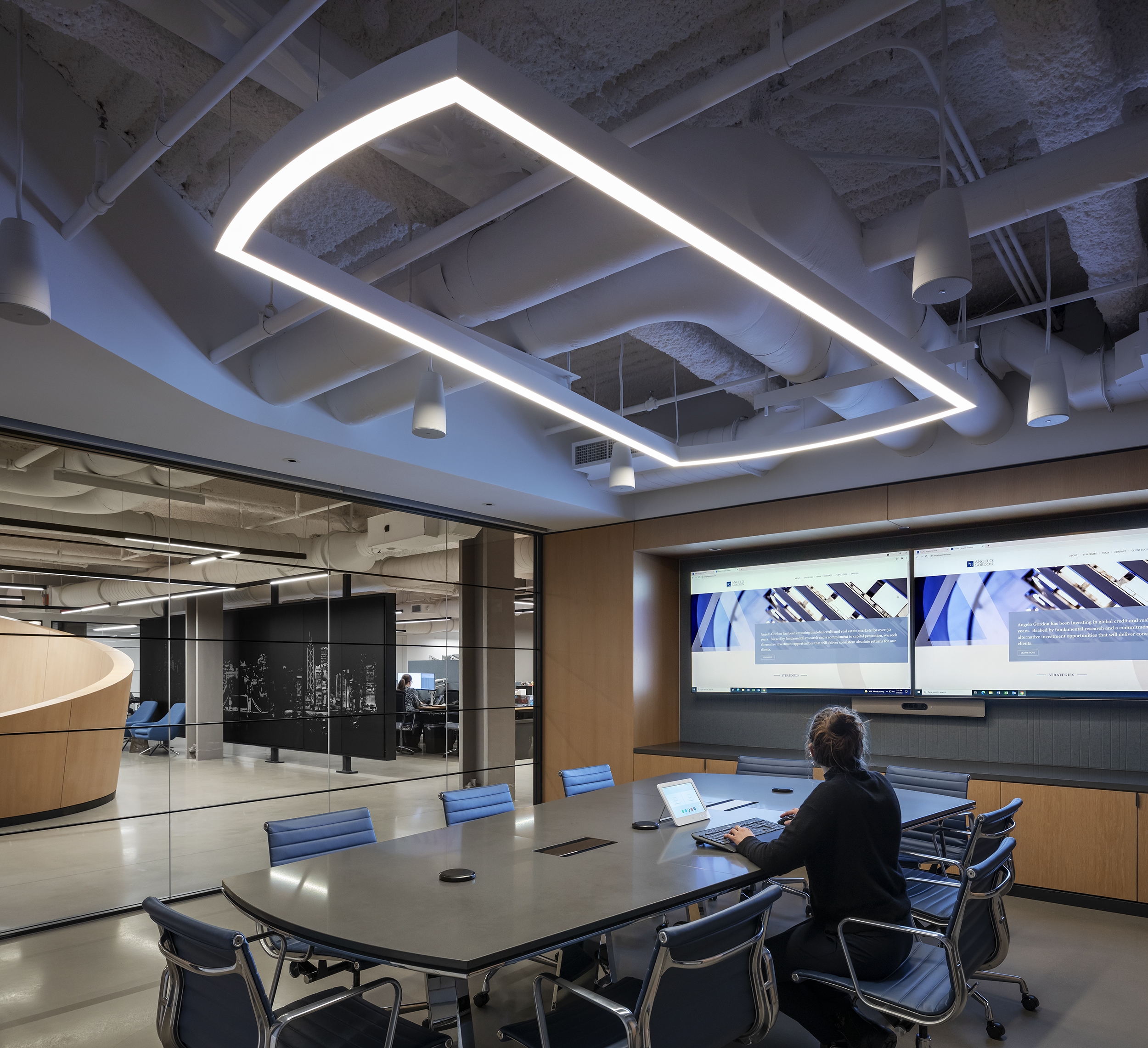 An open ceiling, chosen to maximize the room height, uses an LED pendant system as the primary lighting. Customizable branching arms allowed the creation of dynamic ceiling layouts while providing uniform illumination. The system requires few support points and seems to float in the space. Small accent lights, integrated into the system, provide highlights.