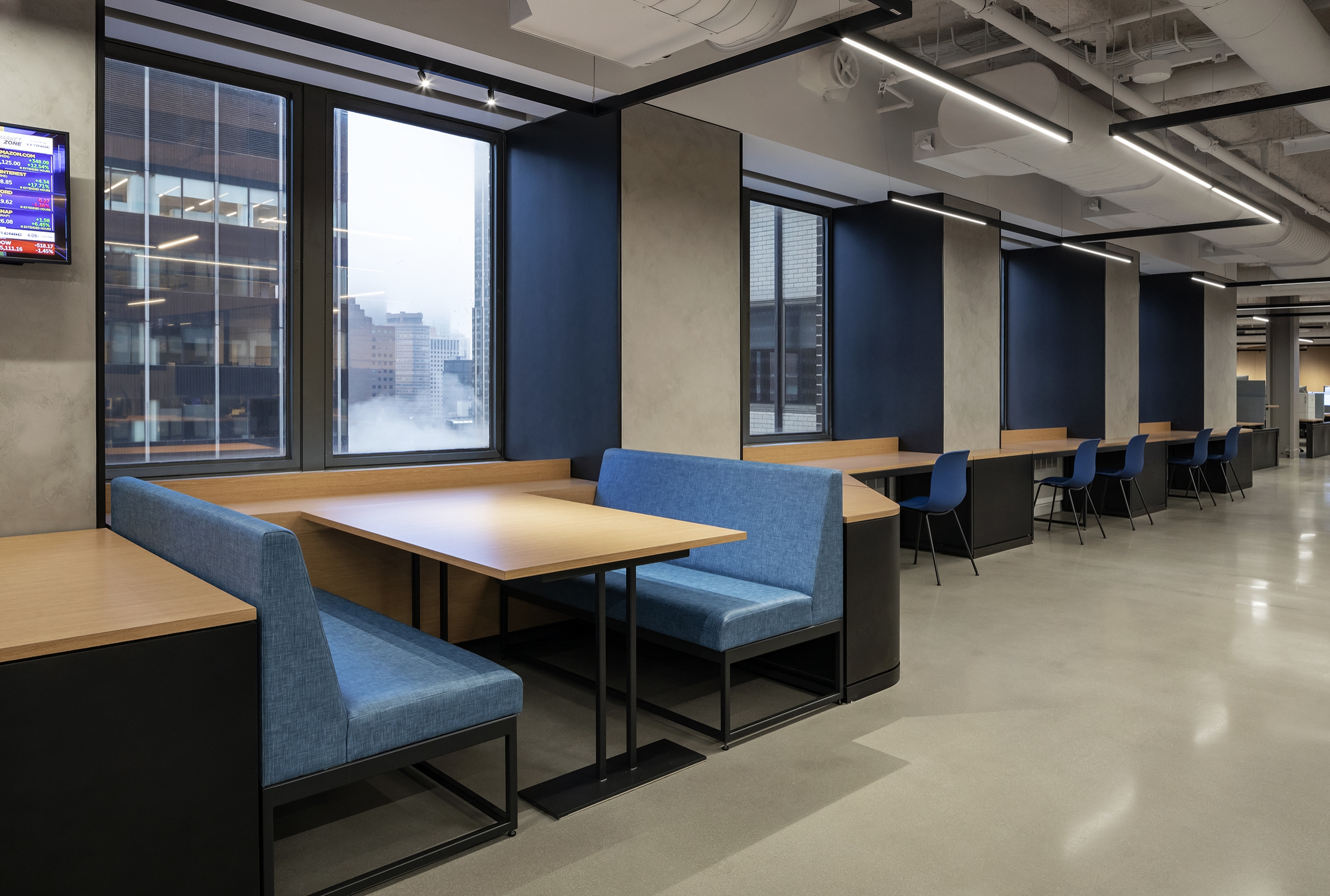 Additional lighting elements provide visual interest. Two rows of high-power LED tape light with grazing optics backlight the black screen wall that greets visitors. A custom LED pendant mirrors the table shape in the main conference room to create a unique gathering space. Decorative wire-form pendants mark counters and tables, contrasting with the branching pendants weaving through the space.