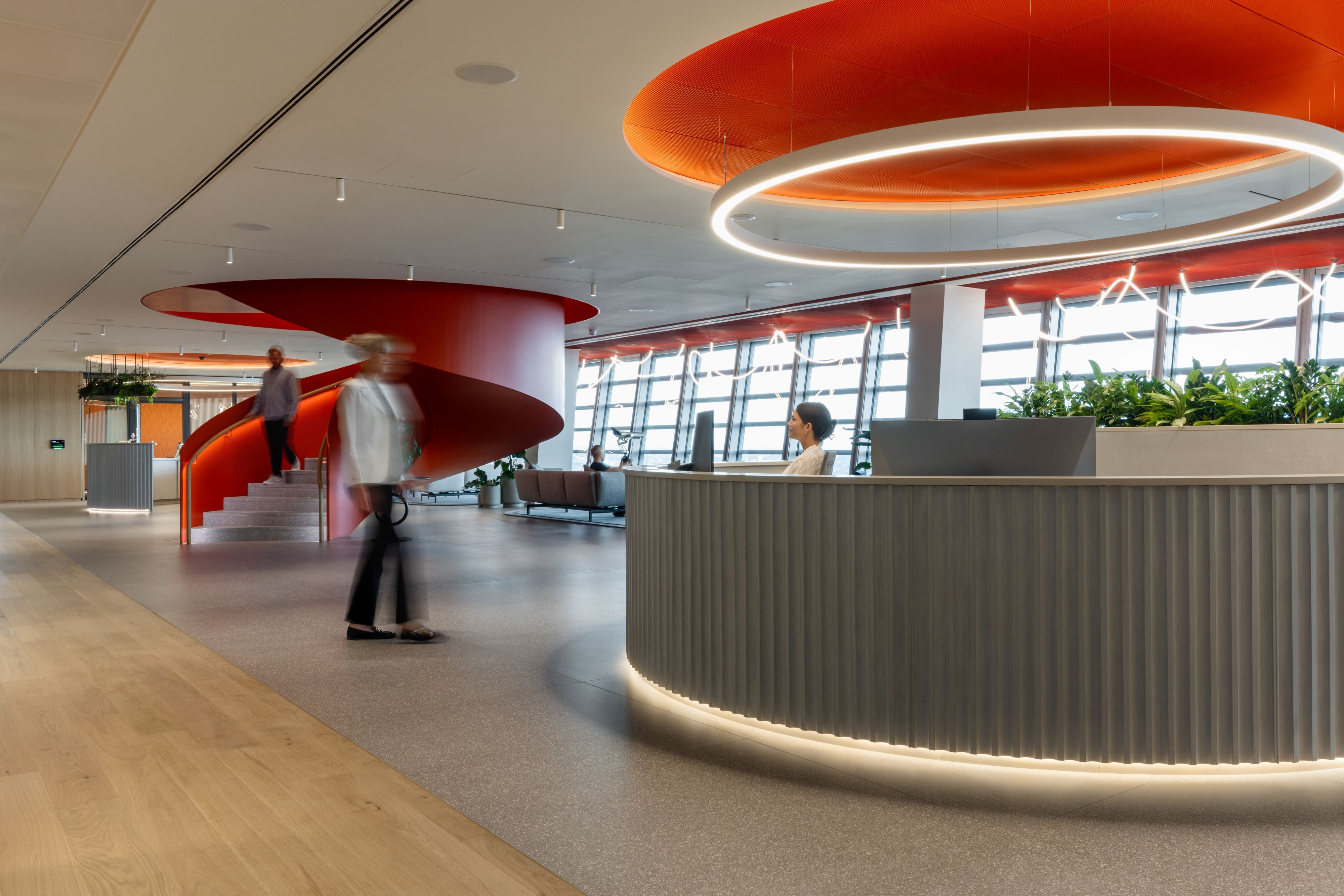 Complementing the ribbon staircase, the main light feature is designed to give the appearance of handwritten scribble that wraps around the perimeter of the space without obstructing the view of the City below. Wrapping the light around the perimeter, together with the central, suspended halo above the reception desk, creates not only a focal point within the space, but also, when viewed from outside the building, an eye-catching feature that avoids external light spill.