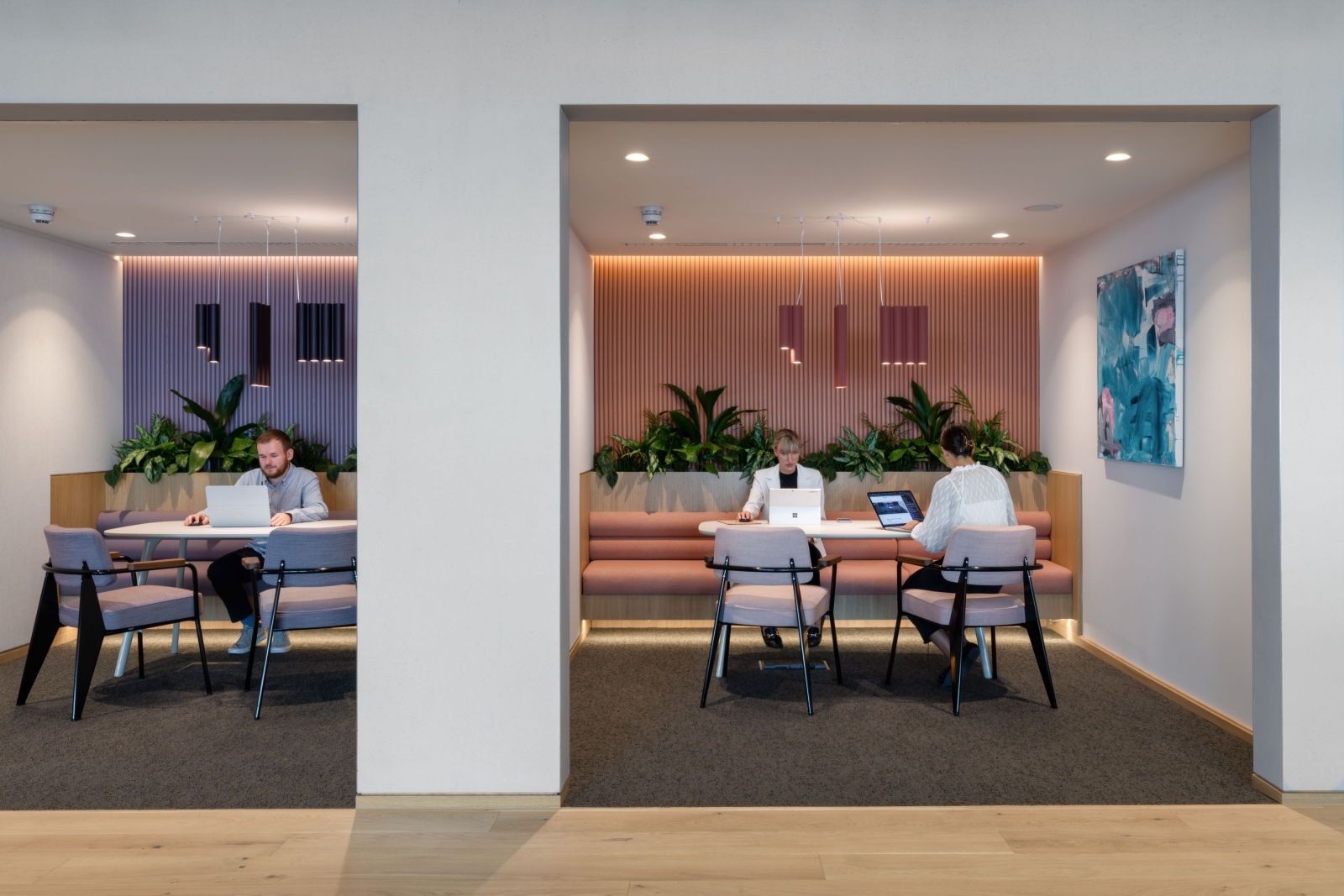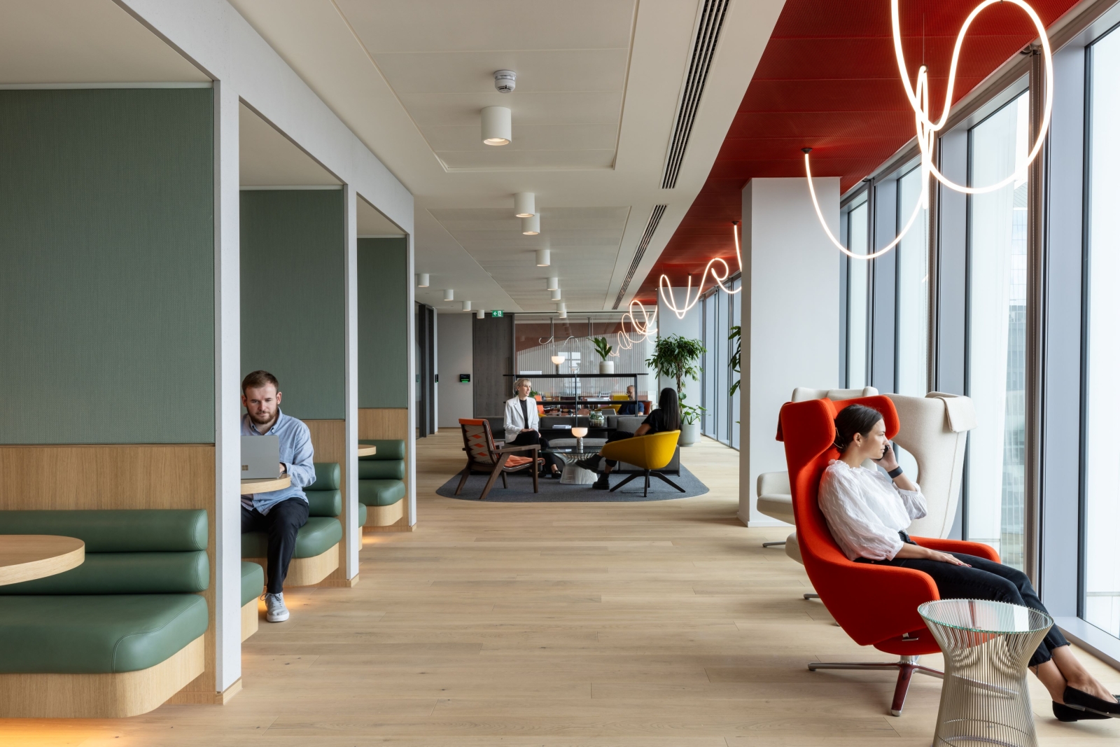 Overall, the aim of the lighting plan was to complement the design concept of providing engaging, adaptable spaces. A rhythm of light along the circulation spaces leads to the informal booth meeting spaces, where a welcoming, focused light is achieved by adding a low-level glow in the booth seating, and washing the wall behind with indirect lighting to bring light levels down to a human scale. Multi-functional trackdownlighting in the main social reception space allows for flexible lighting configurations that enable the client to utilise the space for different purposes.