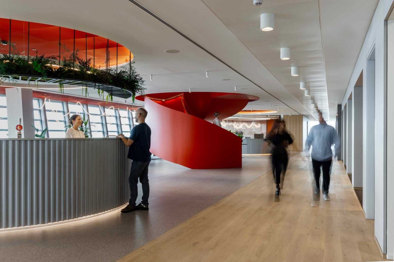 The space is punctuated by a sculptural staircase connecting the two levels. An integrated handrail light that creates warm, evenly-lit stair treads, emphasises the ribbon-like form of the staircase twisting through the space.