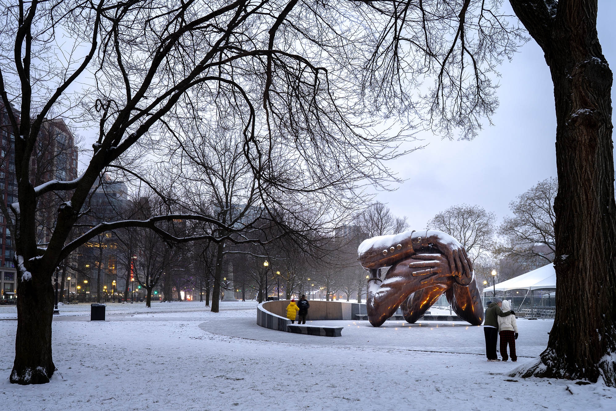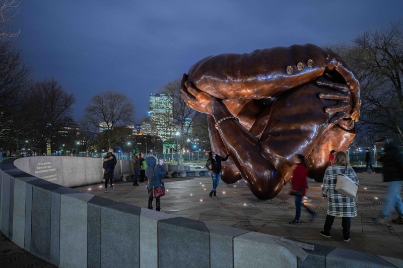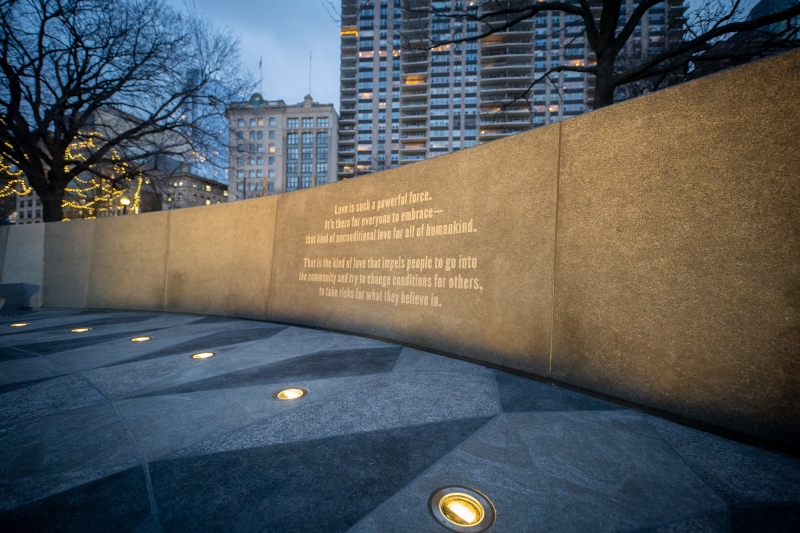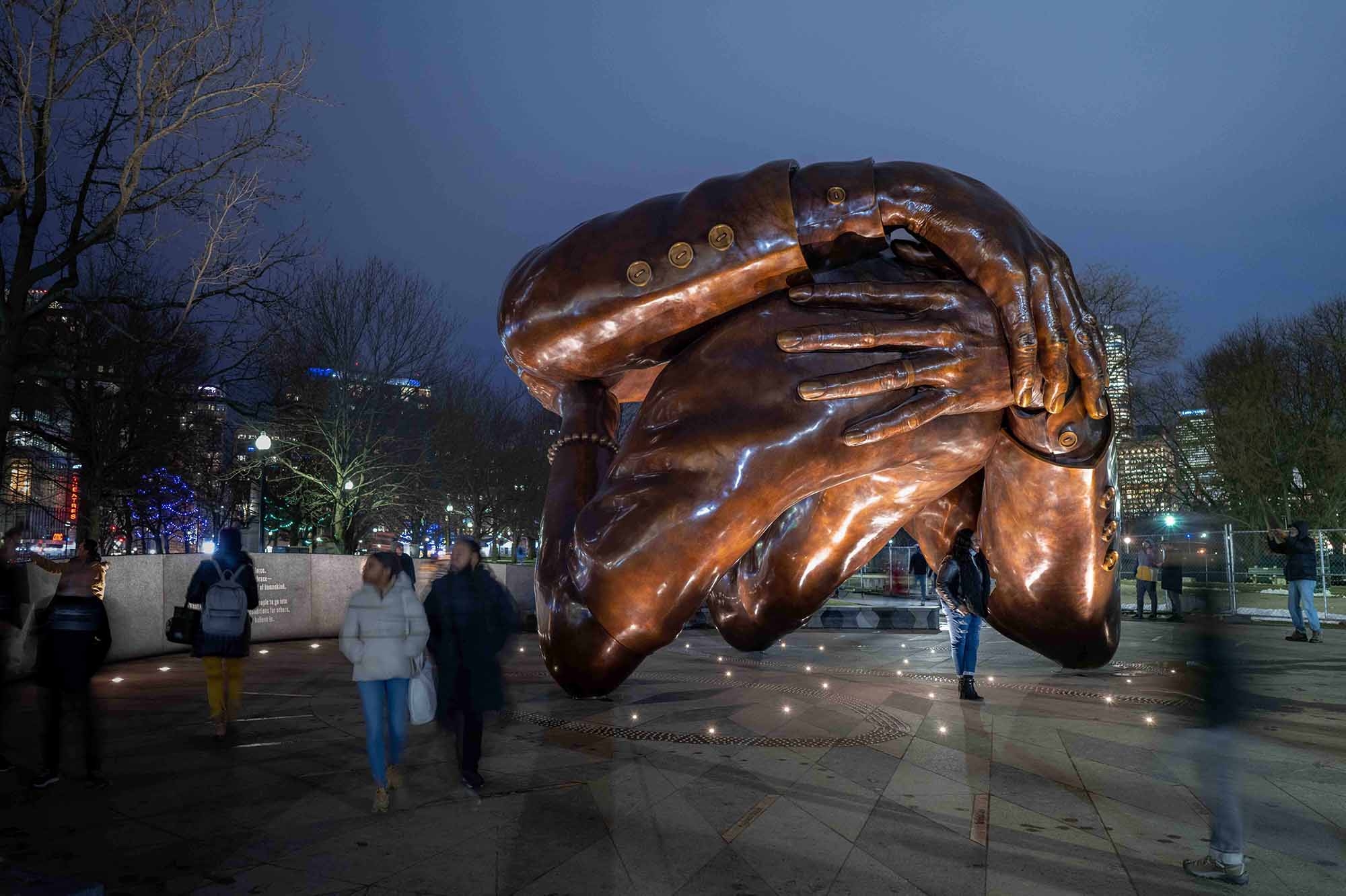 Entry DescriptionSo many monuments and memorials recall heroes, episodes, battles, or victories. The first sculpture built in the Boston Common in nearly a century serves as a permanent monument to the legacy of love. Embrace Boston, a non-profit organization established by the Boston Foundation in 2017, issued a call for a permanent monument to be located in the Boston Common. This monument was to represent Dr. Martin Luther King, Jr. and Coretta Scott King’s presence in the city. The bronze sculpture itself is a 20-foot-tall by 32-foot-diameter figural abstraction of a photograph snapped of the couple at the time of the 1964 Nobel Peace Prize announcement. The 6,000-square-foot Freedom Plaza grounds the sculpture with custom shaped granite pavers, which flow from the sculpture and curve up to form benches, walls, and curbs, while the pattern of the granite evokes an African American quilt. Thirty small, ground- recessed narrow beam pin spots located below and around the sculpture uplight it at night. Each one is strategically placed to specifically accent a particular feature of the sculpture (the suit jacket buttons, the bracelet, the fingers), but all combine to bring a wellspring of warm illumination to the form at night. All combine to create the feel of a welcoming, warm hearth for the Boston Common at night.