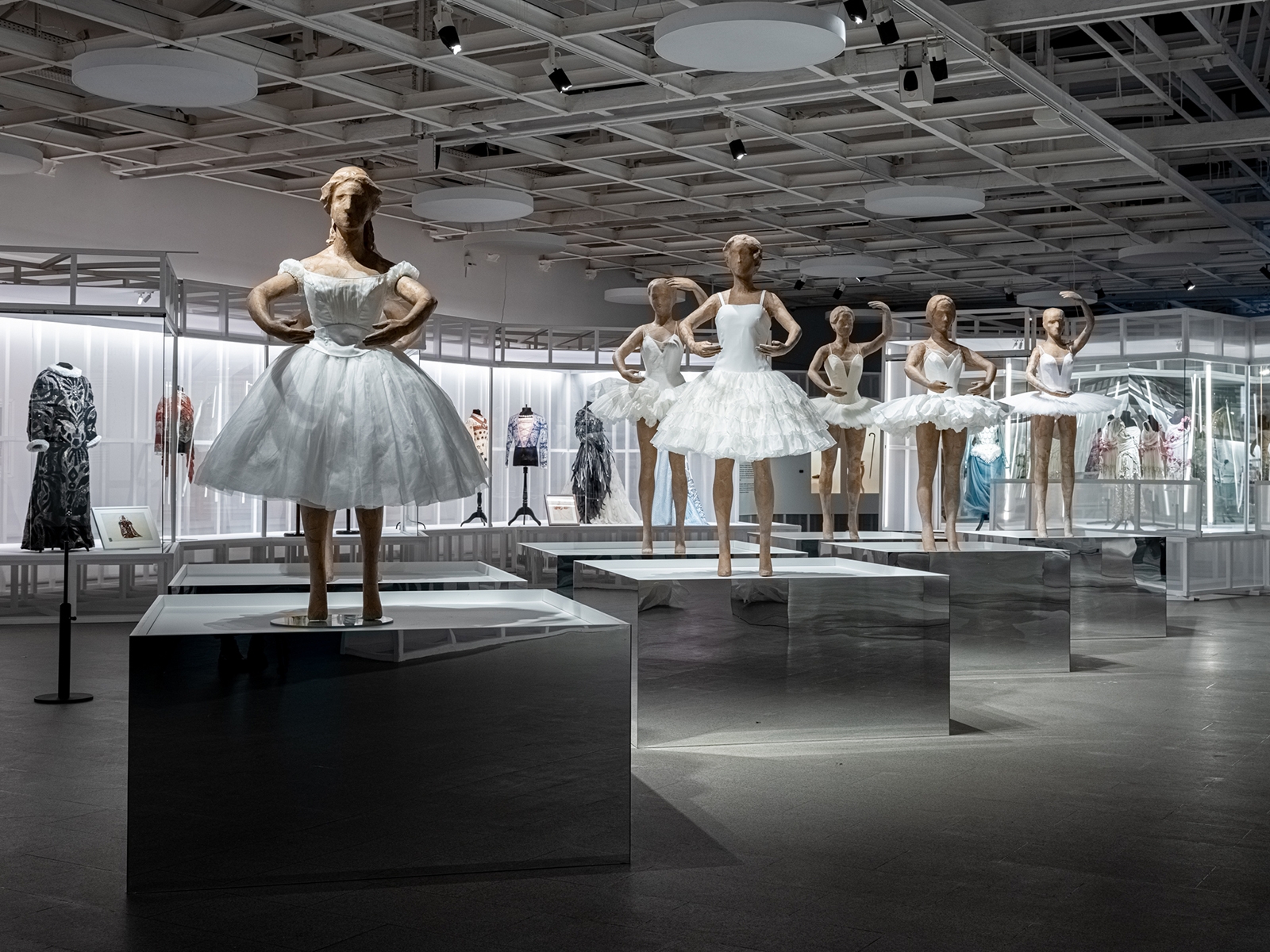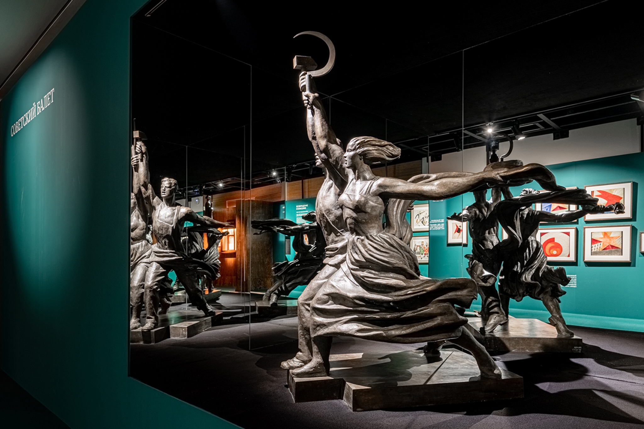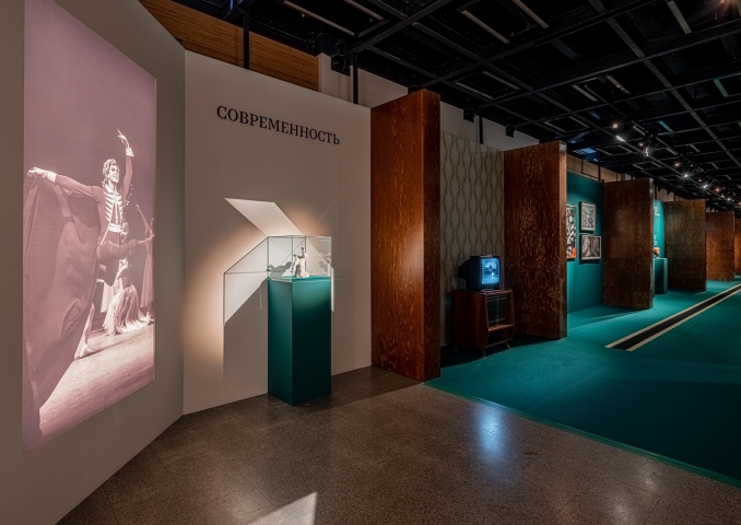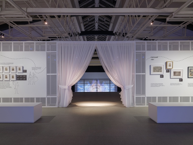 Mirrored islands with historical costumes became the centre of the hall of Diaghilev's enterprise. The combination of optics of linear luminaires provided the standard of illumination, taking into account the small size of the showcases. The reflections of Roerich`s scenery appeared in the gradient-toned mirrors of the islands, due to the light walls. To prevent glare, all spotlights are covered with cinefoil.