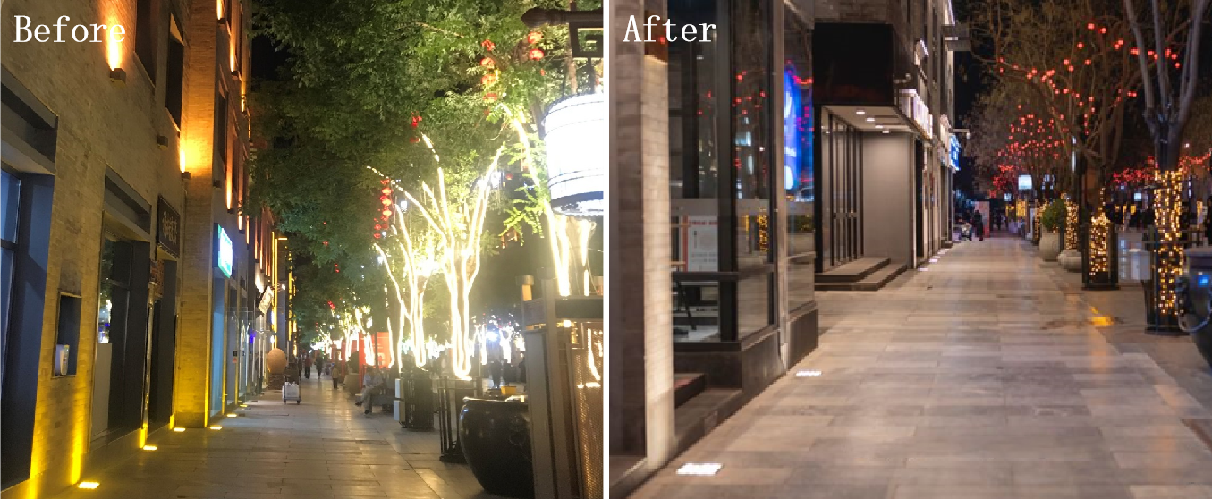 The lighting design highlights the layering of the axis. Brightness of buildings along the central axis: landmark positive gate>buildings on both sides>landscape. The brightness of the building: roof>bottom shops>middle, forming a double U-shaped layout.