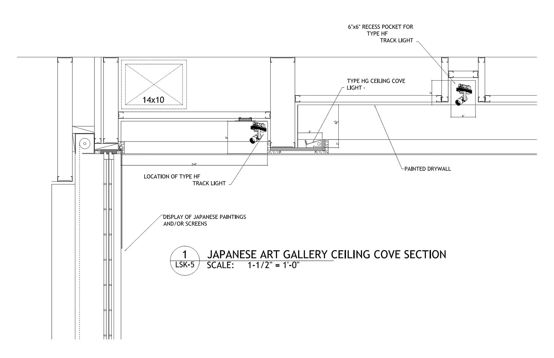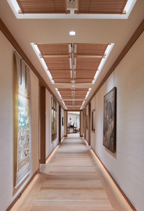 Layers of light, controlled locally and wirelessly, create a constantly changing environment for constantly changing art. The distinctive gallery ceiling, reminiscent of traditional shoji screens, required exacting integration of back-lighting and diffusion with minimalist track heads highlighting wall mounted art. Galleries required careful selection, placement and control of museum grade LED luminaires to illuminate, while preserving, mixed media collections of hand-painted silk scrolls, gilded wood panels, antique Buddha sculptures, Japanese ceramics and artifacts in the owner’s frequently rotated collection.