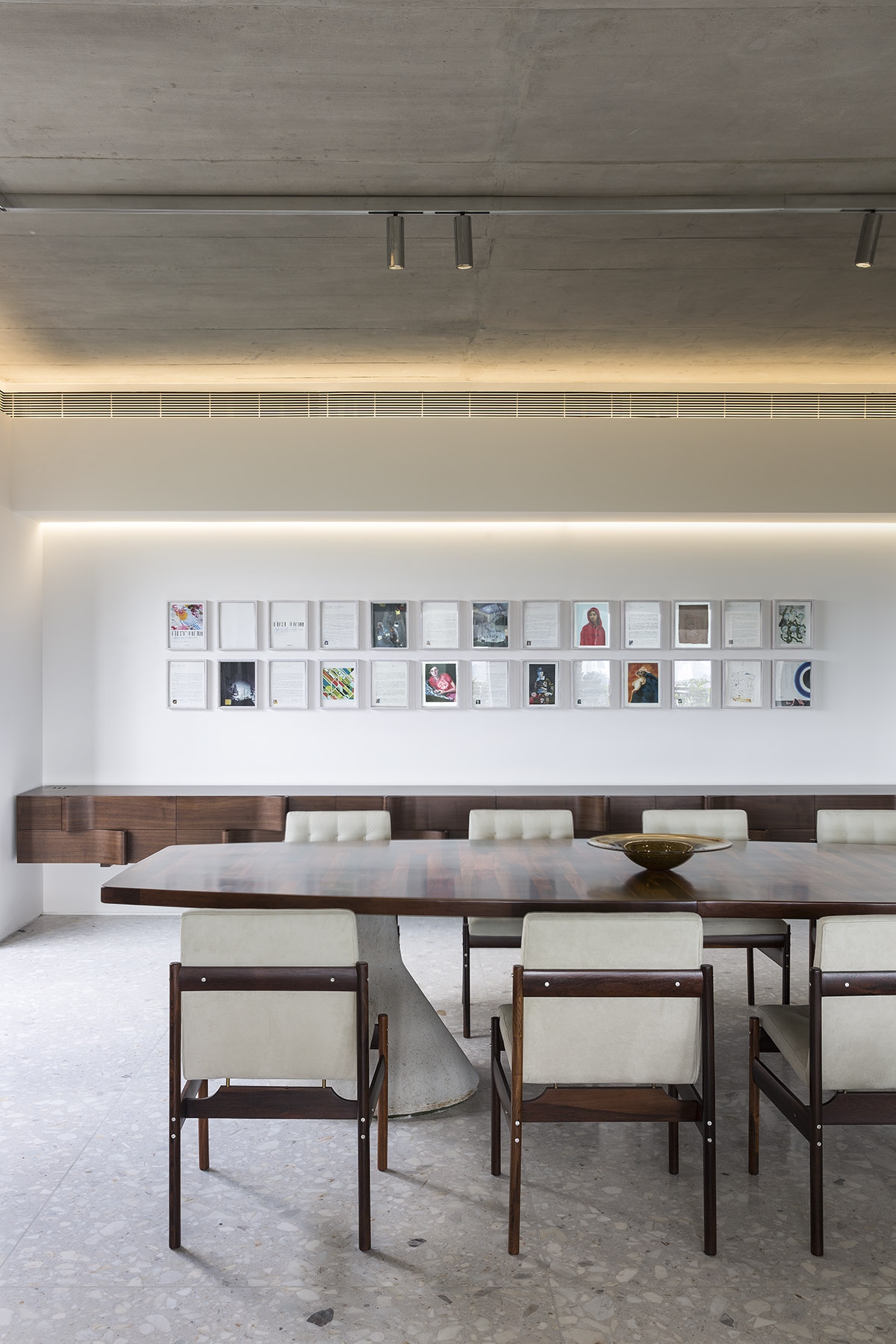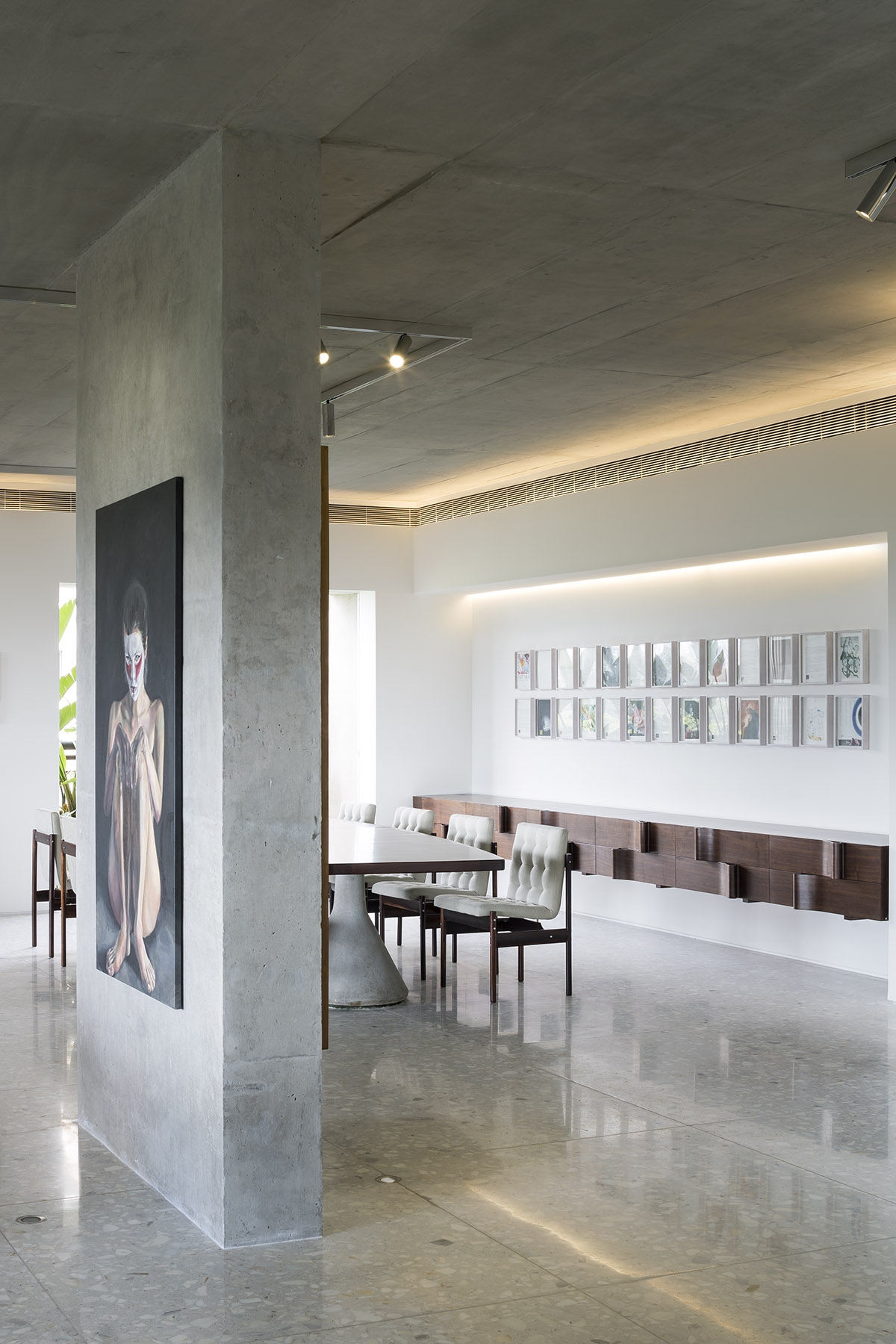A flexible spotlight and track system accentuates art on the walls, creating focal points. The fixtures' polished aluminum finish mirrors the concrete ceiling, aiding in a unified visual aesthetic.