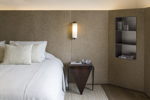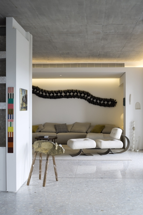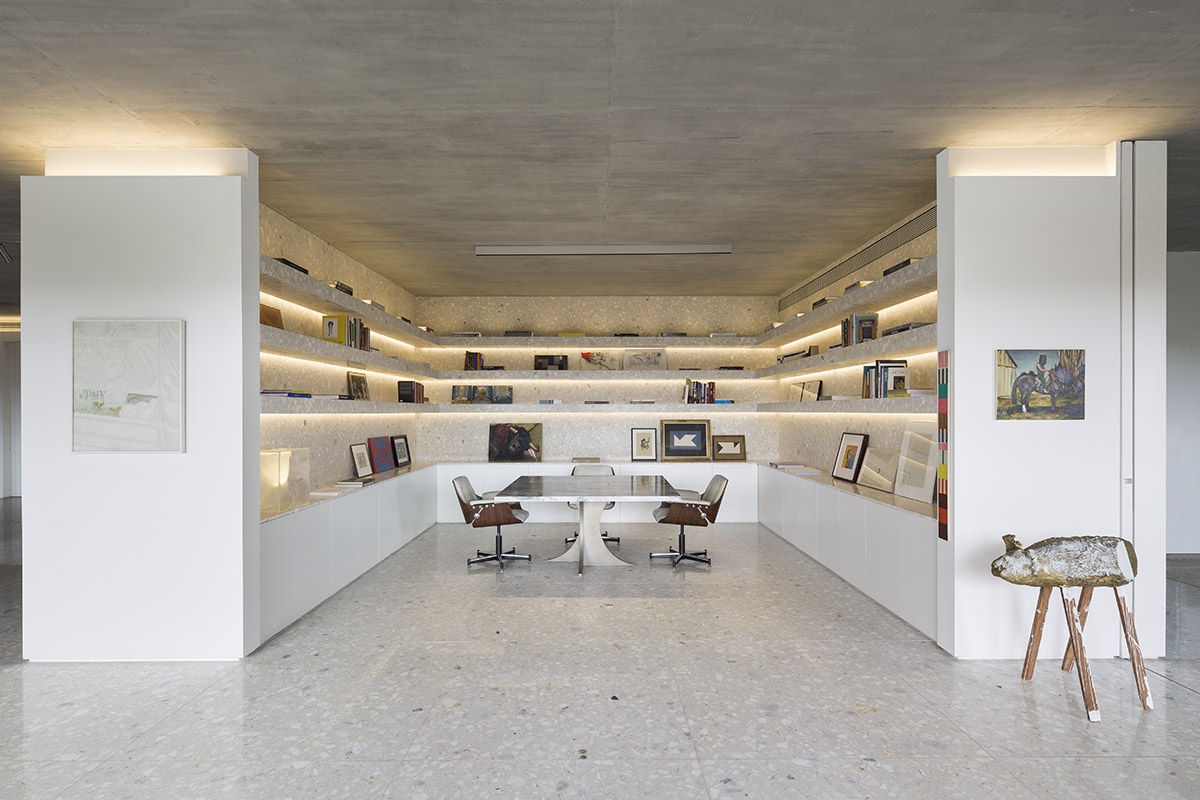 In the living areas, the concrete ceiling is lit by concealed wall lighting, generating a warm glow.