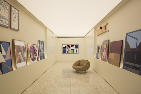 In the private gallery area devoid of natural light, a large backlit ceiling provides uniform, shadowless lighting over the art exhibit, ensuring clear viewing. This lighting solution compensates for the lack of natural light, offering optimal illumination for art appreciation.
