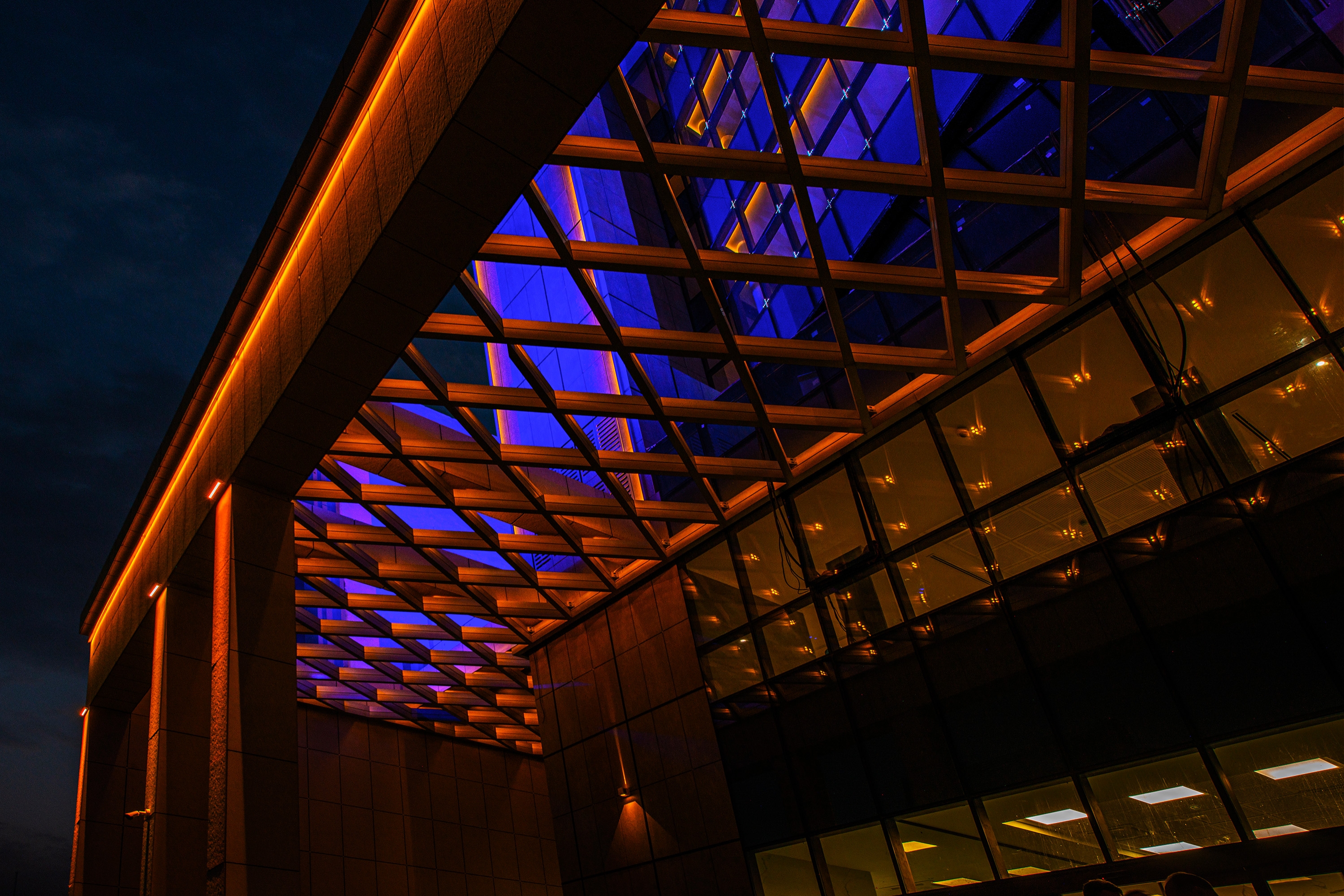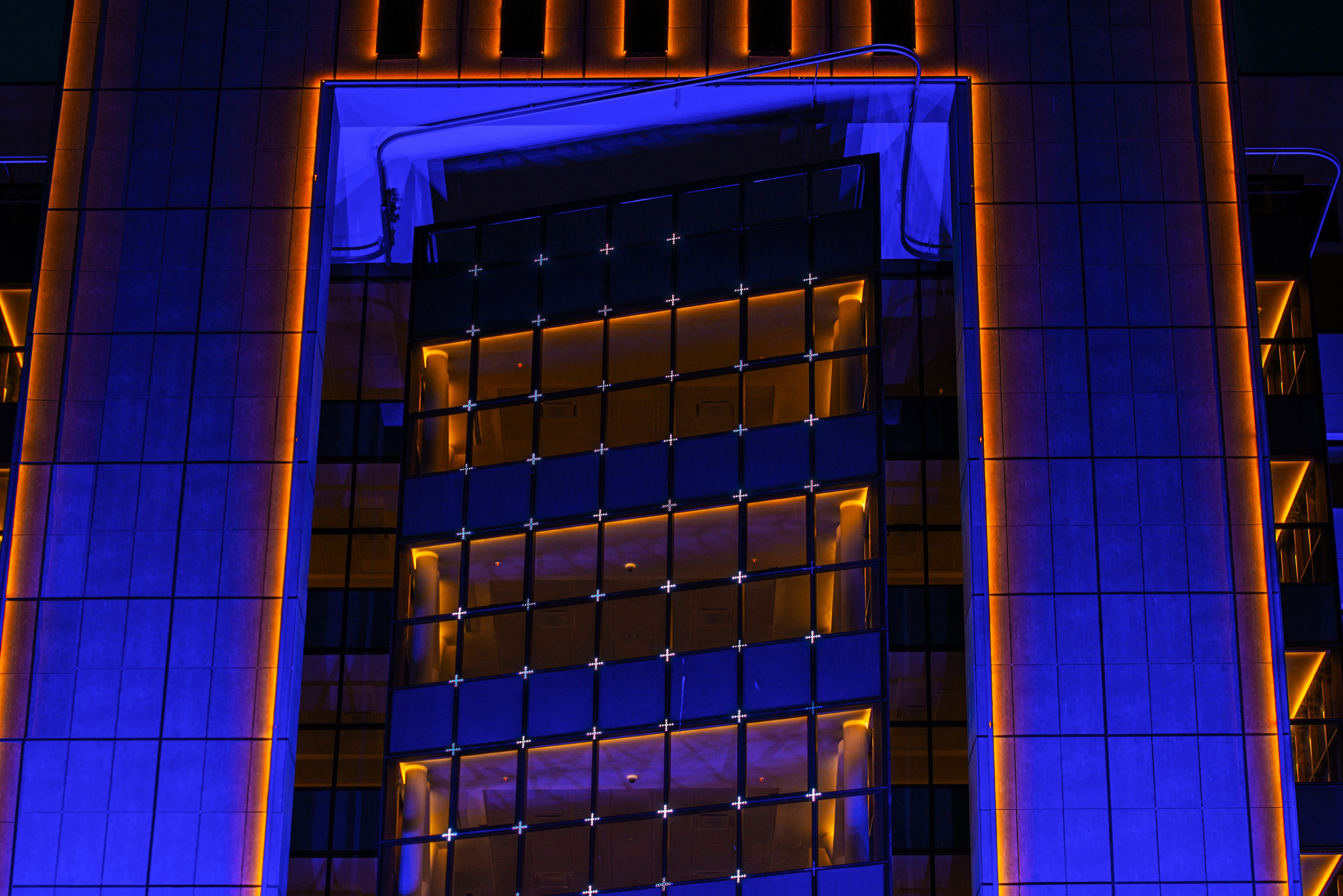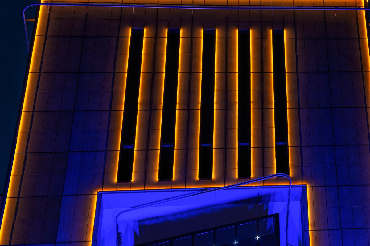1. Blue light with a wavelength of 450 nm for overall coverage of the upper levels of the building as undertone. This cool tone is an ideal substrate for displaying architectural details with a warm light tone. The blue background evokes the viewer: you can rely on me.