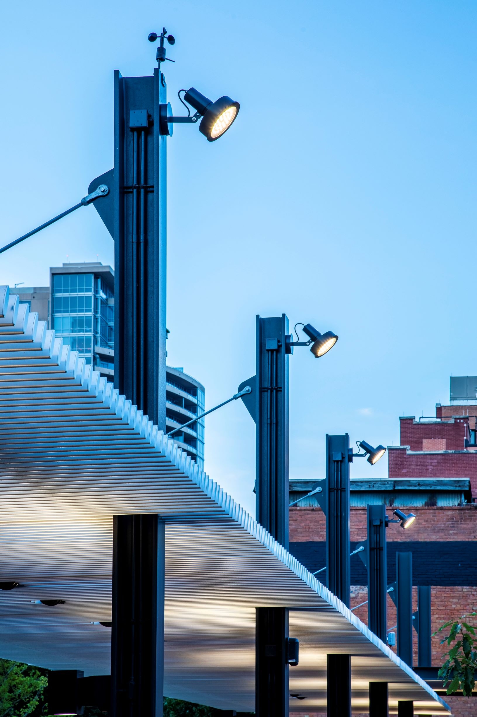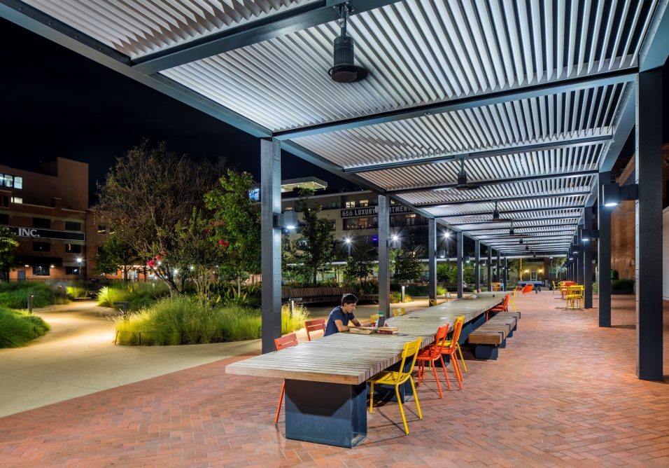 The trellis, enveloping the park, provided a welcoming frame of light and accommodated IoT elements while maintaining a clean aesthetic. Cool white adjustable area lights atop columns illuminated the garden and created captivating shadows, while warm white bollards within the garden assisted wayfinding.