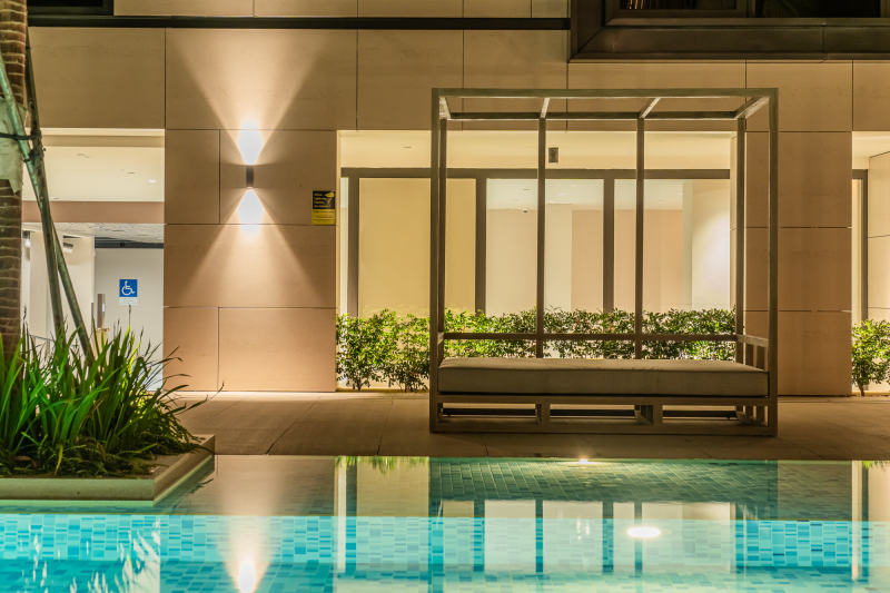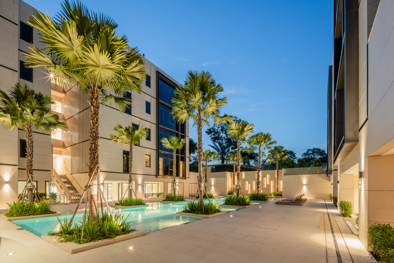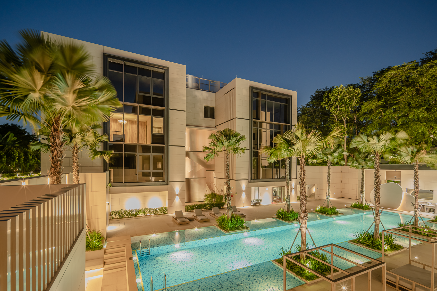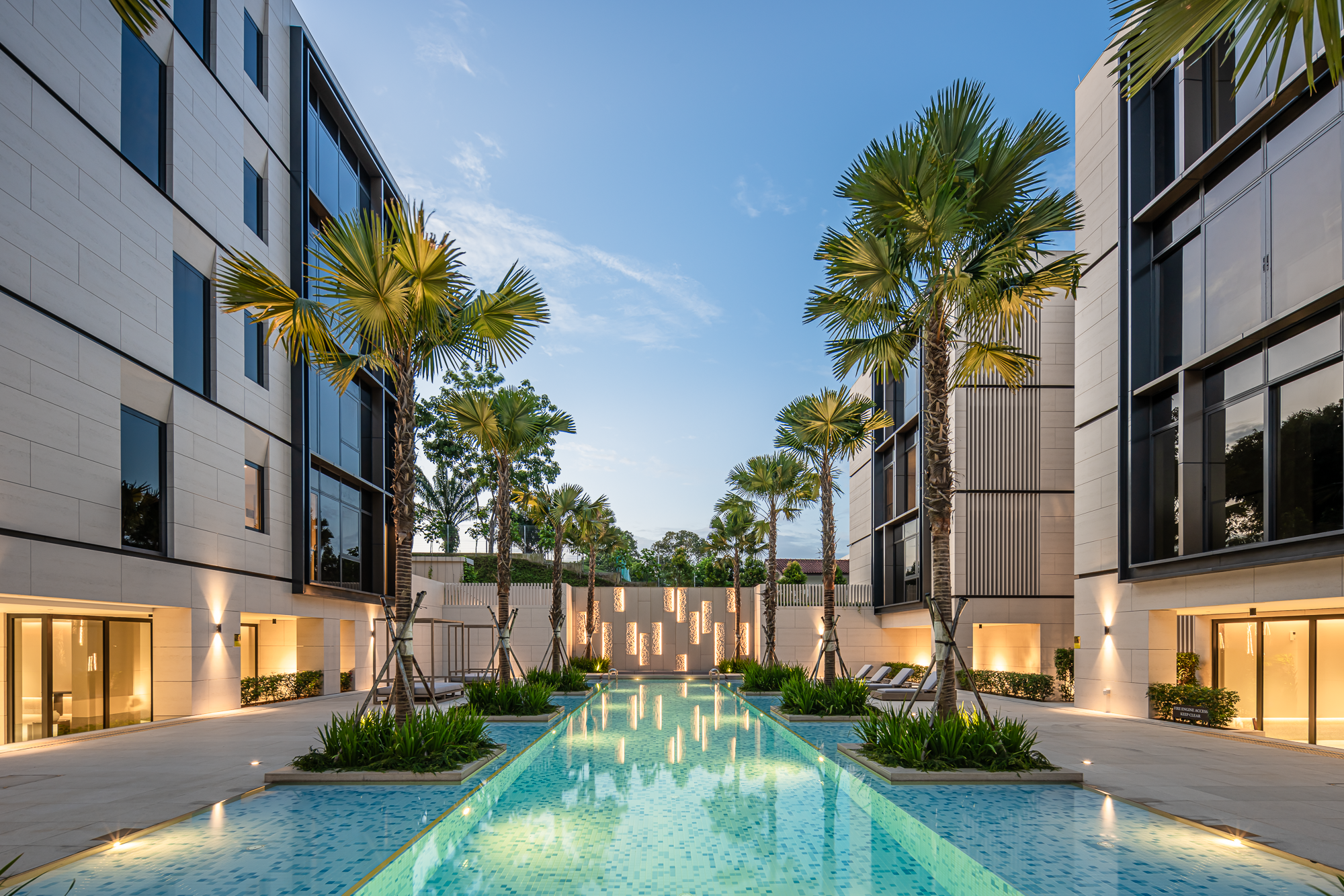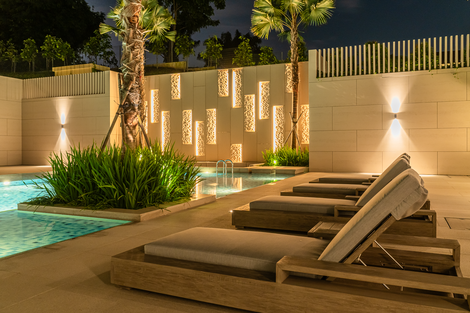 Entry DescriptionAgainst the hectic lifestyle in Singapore, our lighting design evokes the peace and tranquillity in a person as they enter the concierge. The lighting aims to reflect the modern minimalist luxury architecture and build materials applied. A key feature binding the space together is the swimming pool. By anchoring the design at the pool, the lighting application uses minimal lighting on the sides and gradually building up the illumination on the unique textured façade wall at the far end of the pool.