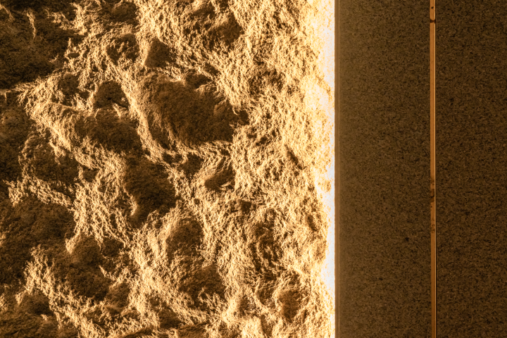 A mirage lighting reflection was created on the slow-moving water surface. It mimics a calm breathing action of the nature. This seeks to relax the mind as one looks ahead into an artistic feature wall.