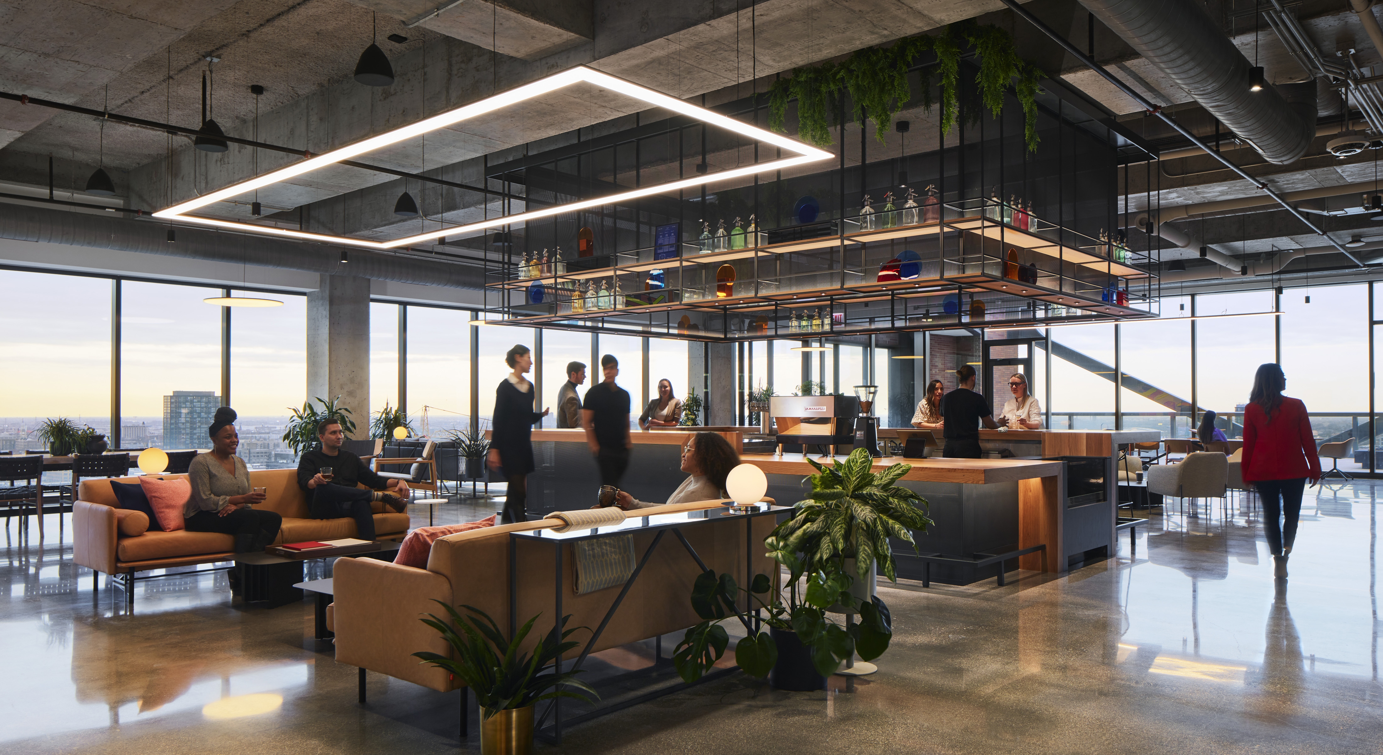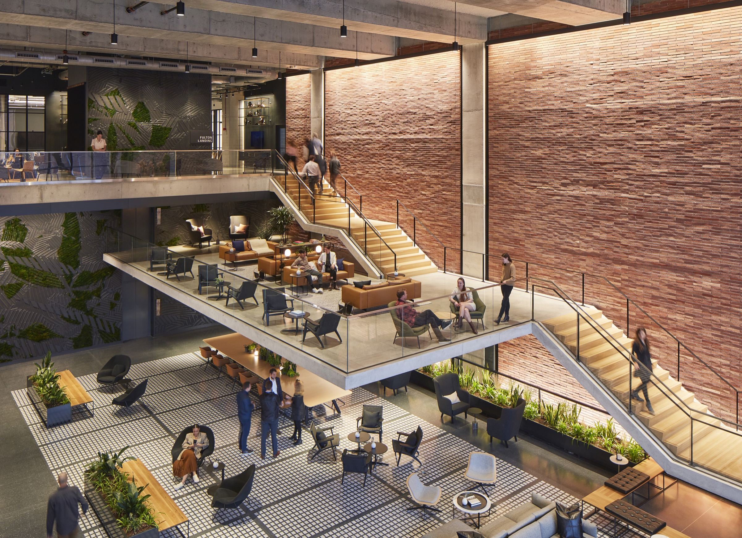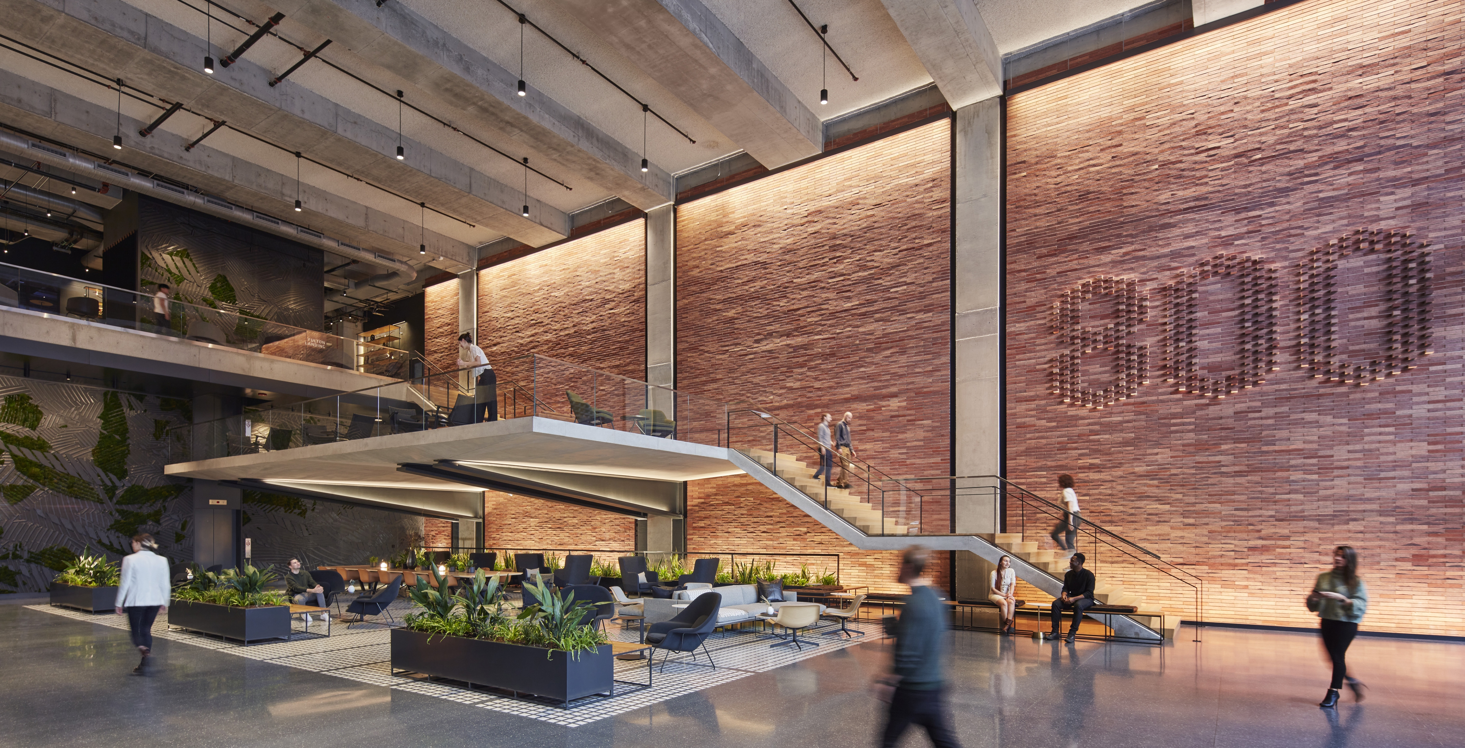 The 40 ft. Lobby features a cantilevered mezzanine and staircase. Brick, steel, and concrete embody the neighborhood’s industrial history, while lighting reveals the warmth, texture, and architectural form.