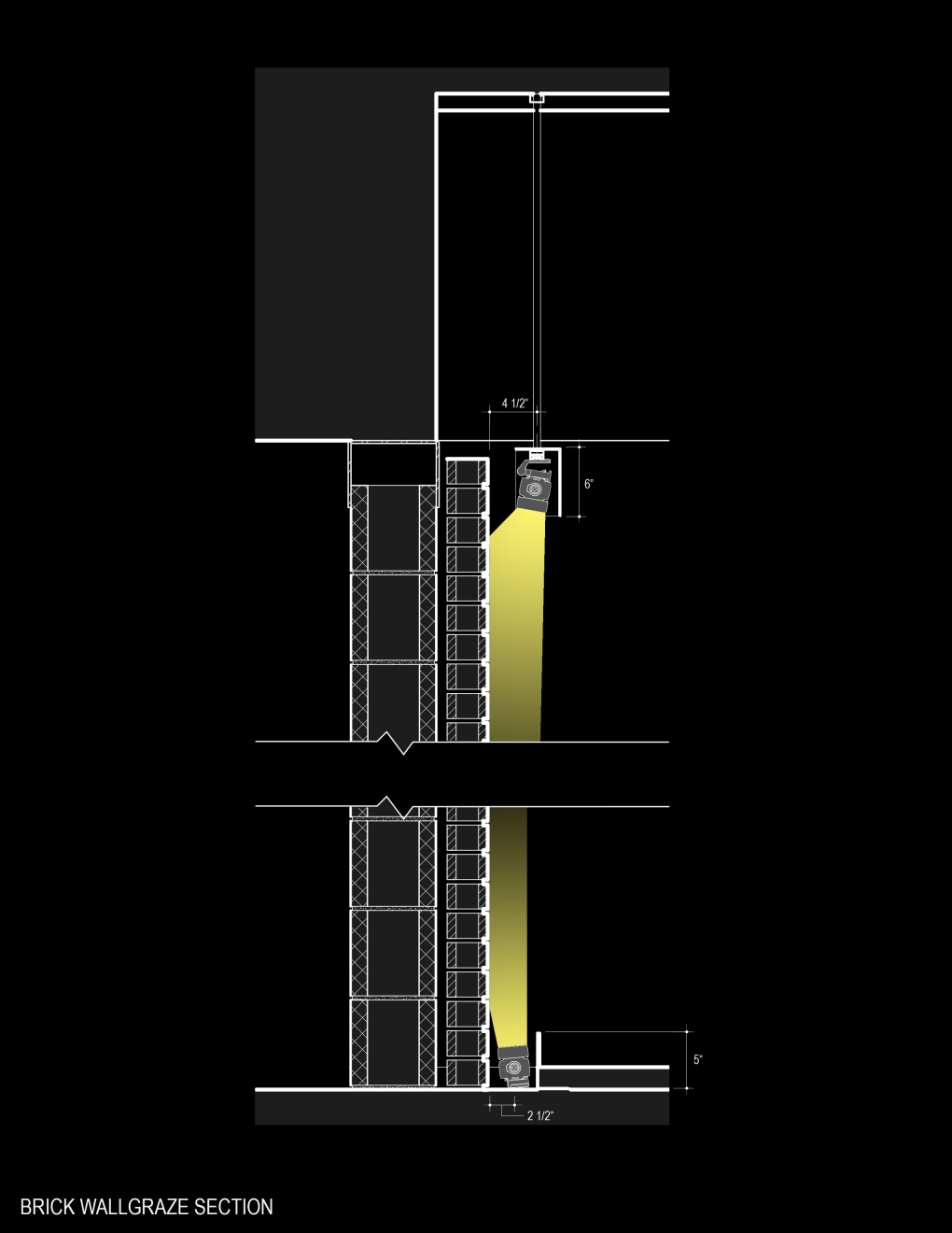 10x60-degree linear fixtures “graze” brick walls from the top and bottom, creating a warm, inviting gradient and highlighting of the “800” address. The mezzanine and stair appear to float as light skims through a 9” wide gap at the wall. Lighting accentuates the ceiling height yet adds intimacy. Fascias conceal fixtures and cylinder downlights provide general illumination.