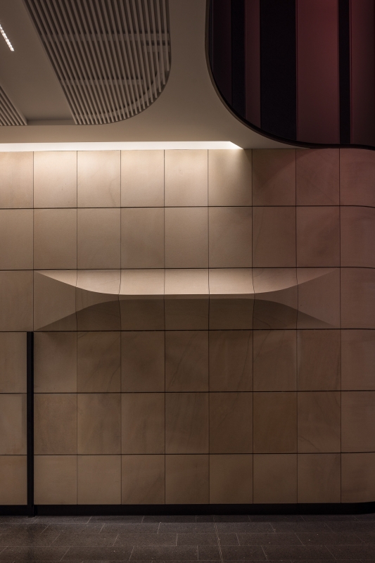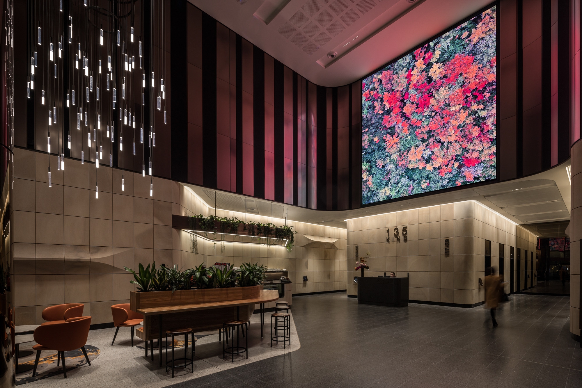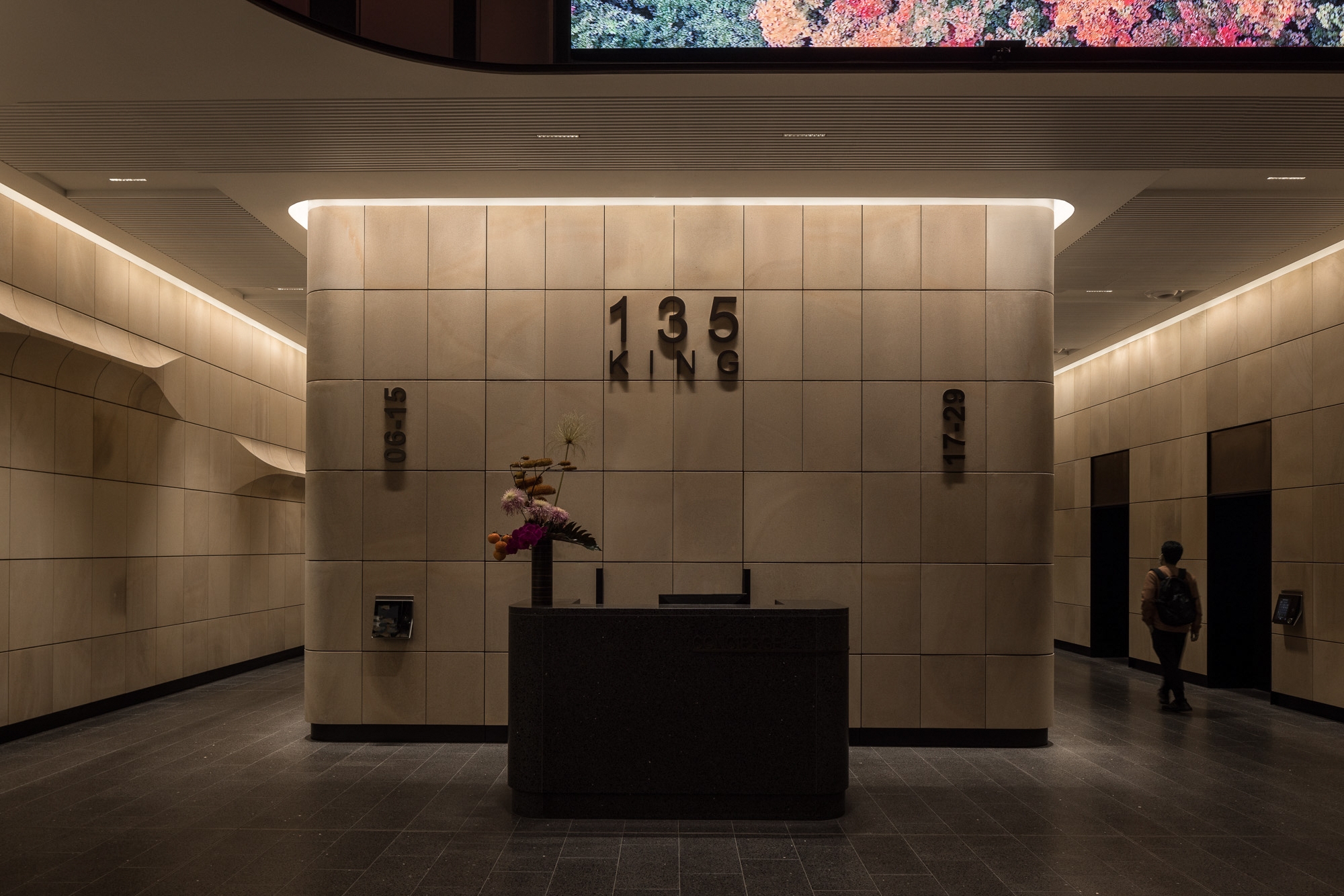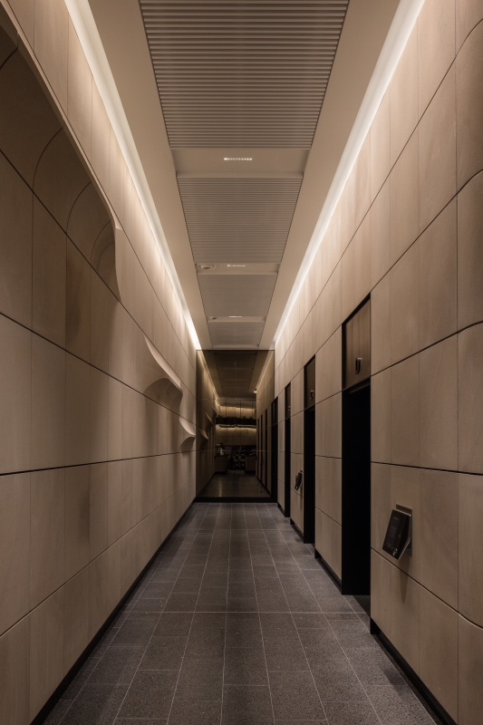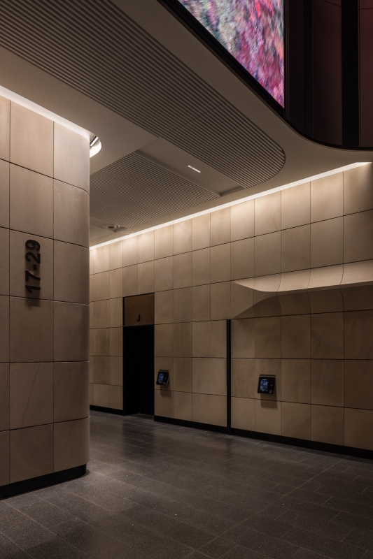 Among others, three hero elements contributed to the impact of 135 King Street, highlighting the internal sandstone through wall grazing lighting of the lift core and adjacent lift lobby sandstone. These elements serve as a focusing point within the building.