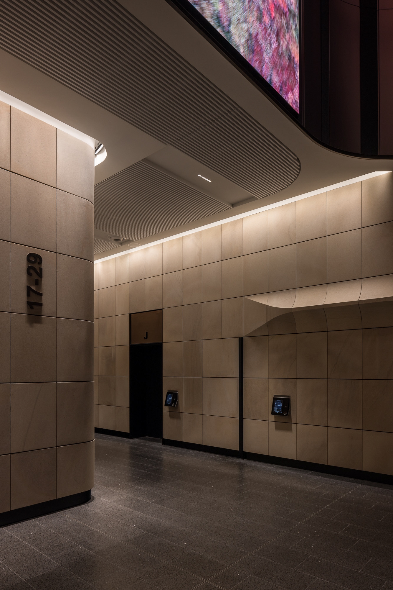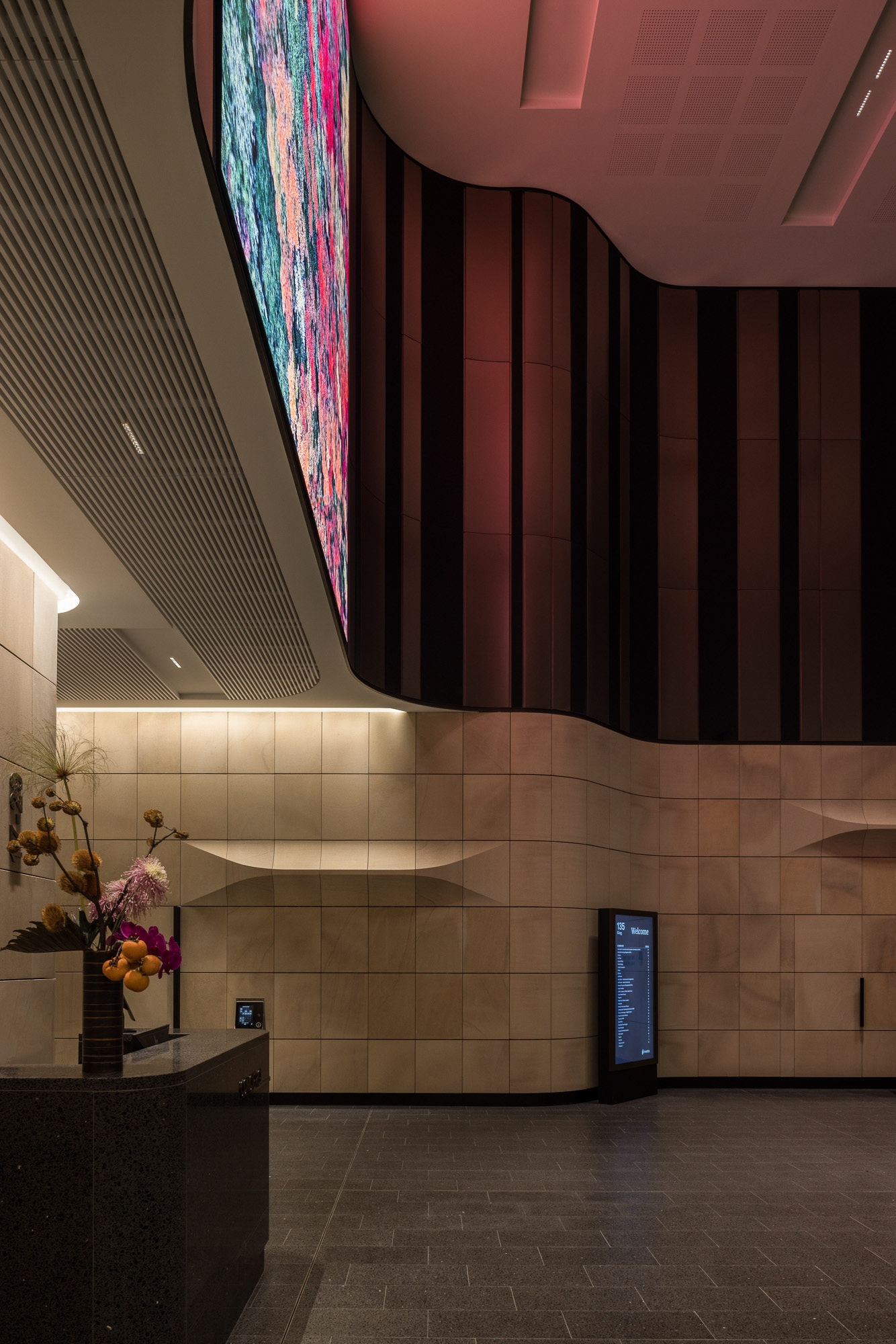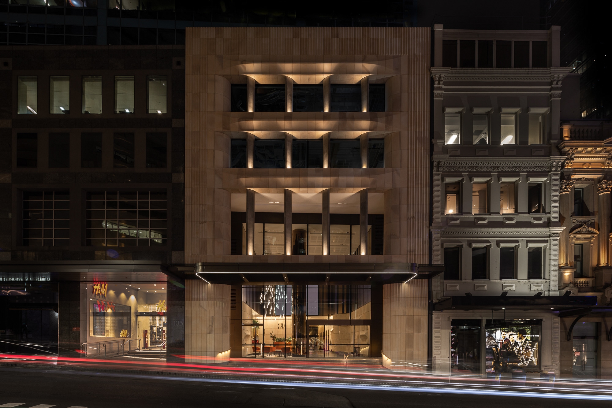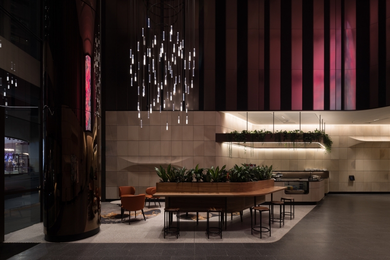 Among others, three hero elements contributed to the impact of 135 King Street, highlighting the internal sandstone through wall grazing lighting of the lift core and adjacent lift lobby sandstone. These elements serve as a focusing point within the building.