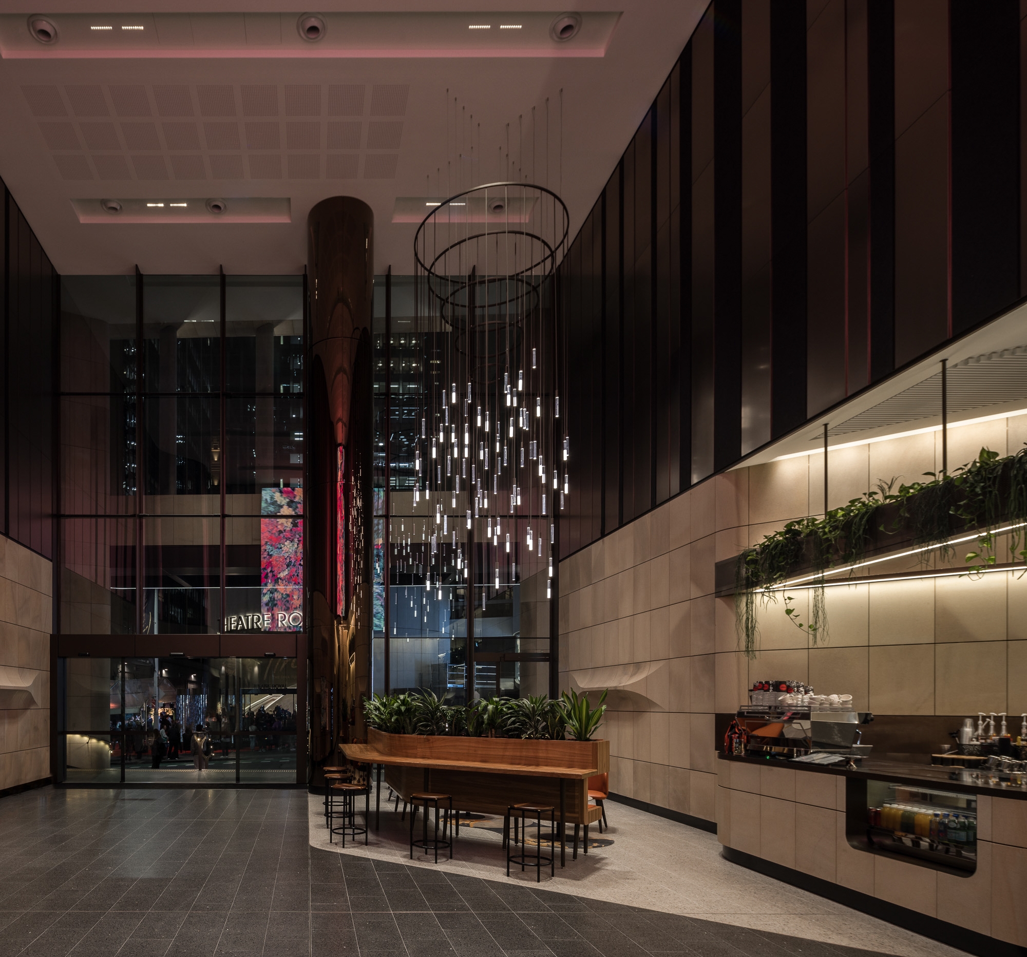 Additionally, the external façade lighting contributes a crucial role in enhancing the presence of this premium lobby at night. The façade lighting adds to its visibility and presence along King St by strategically illuminating the building's exterior.