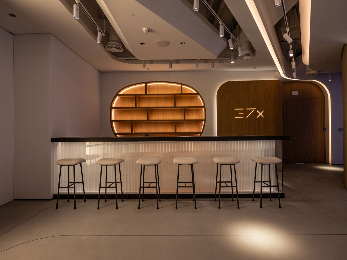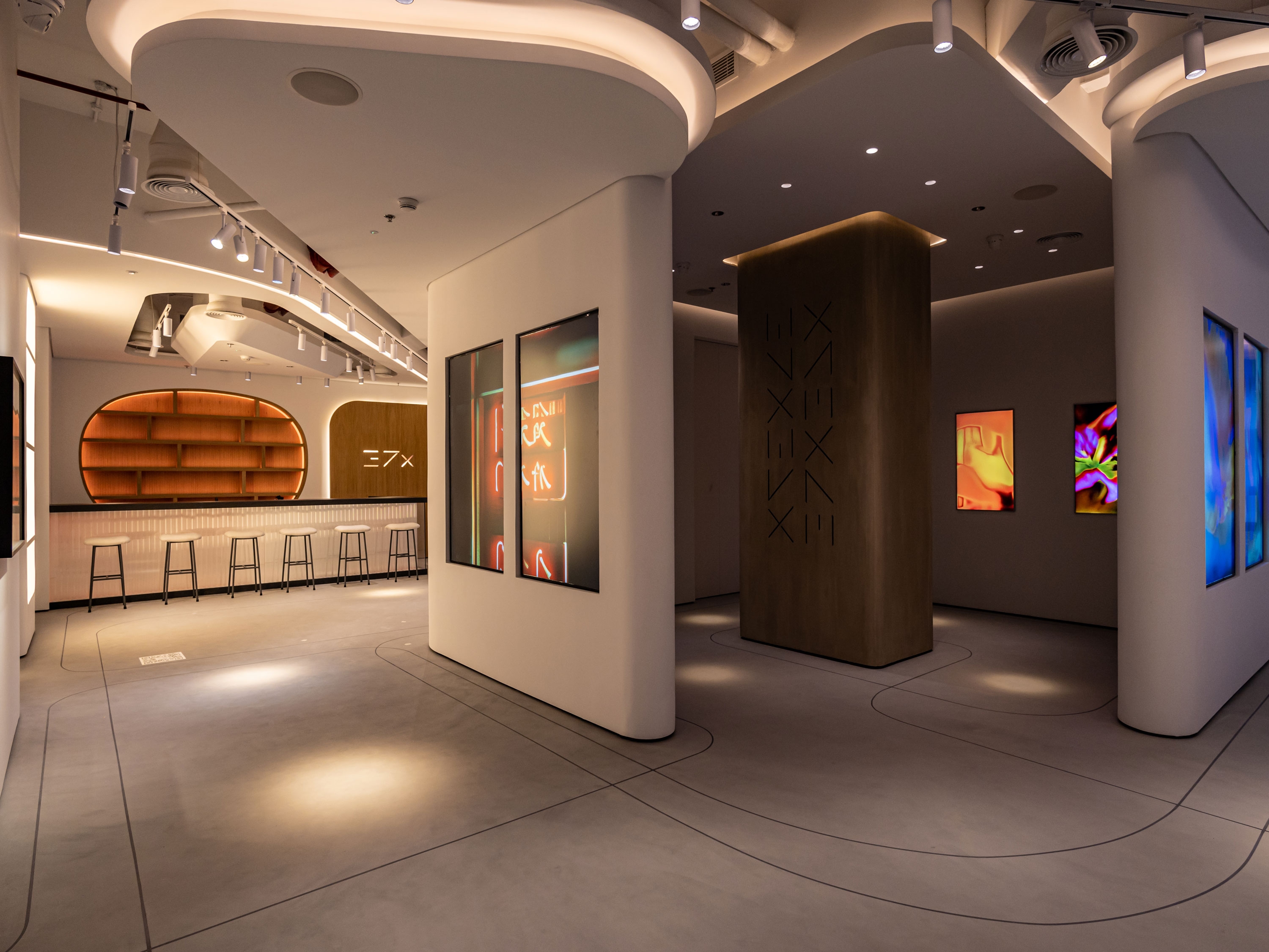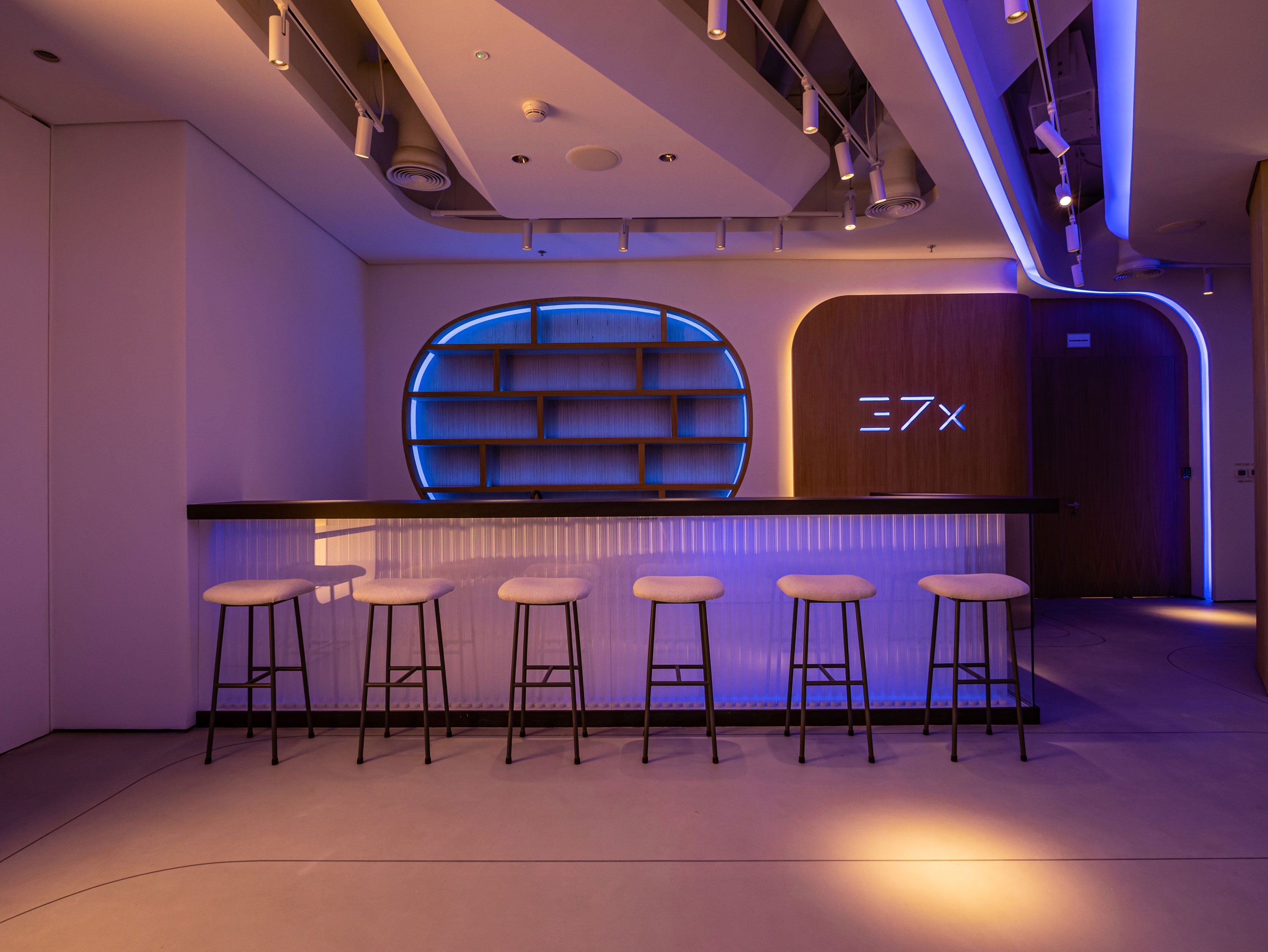 The general light is individually adjusted for each zone and function of the space: gallery, art exhibitions, presentations, and events. An additional function has also been installed - you can choose the necessary backlight color, and the ceiling, recursion, and bar are repainted synchronously in this color.