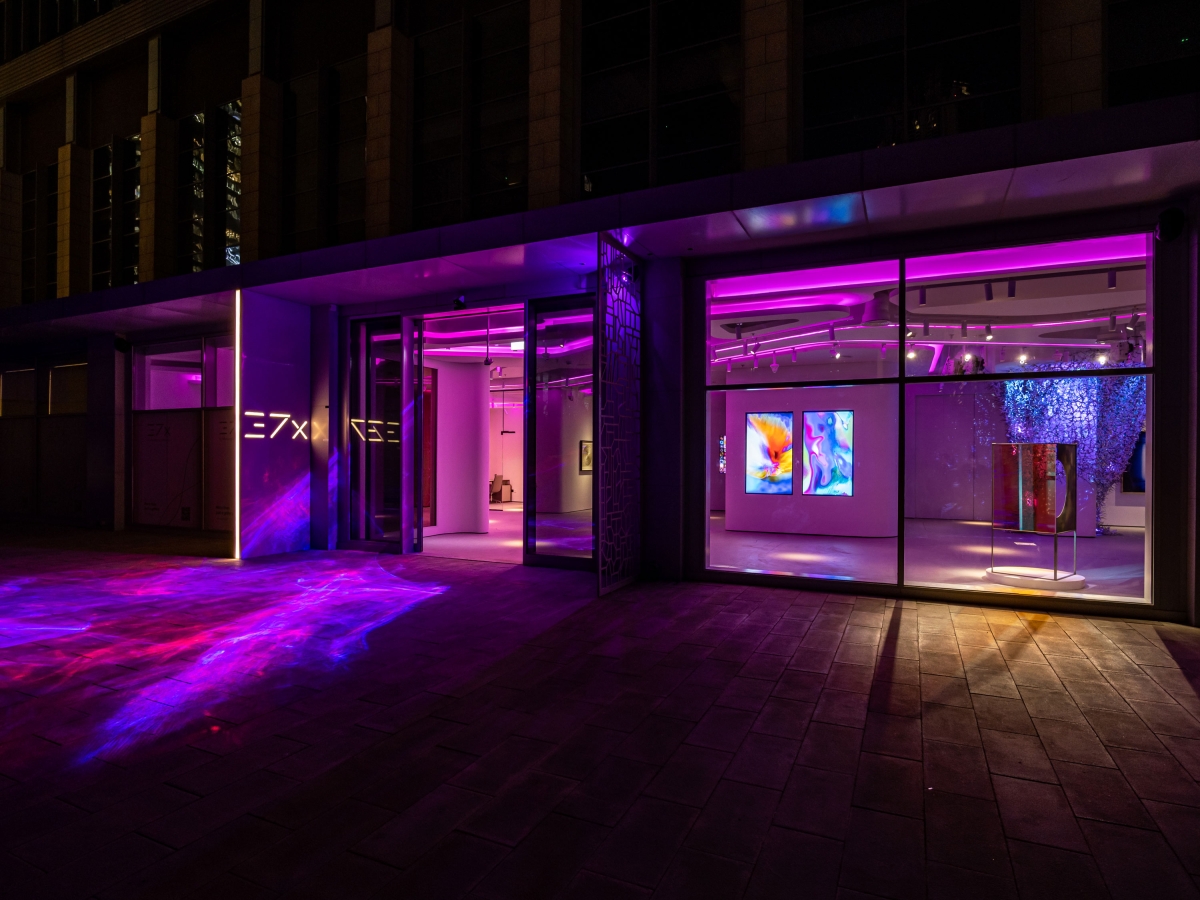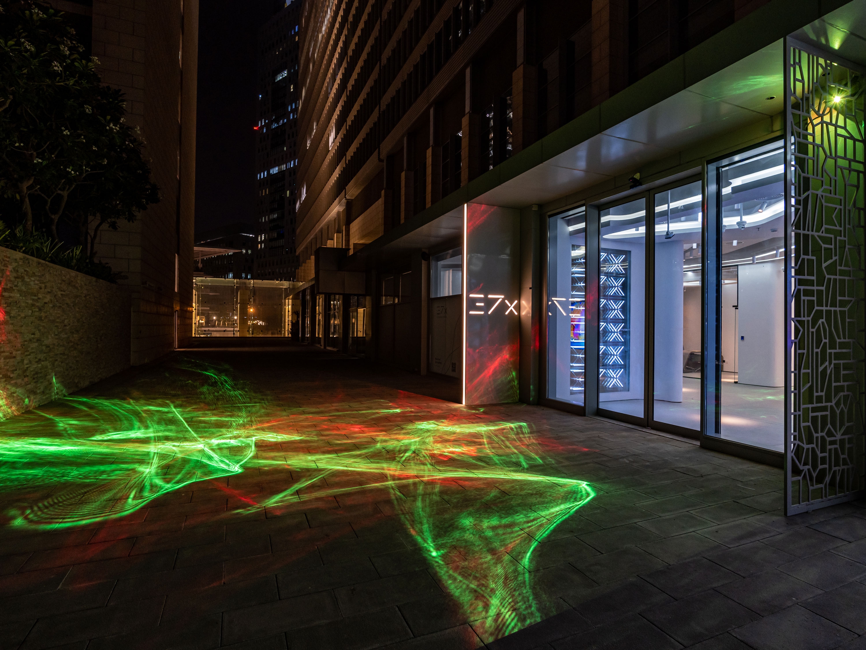 In front of the entrance to the gallery, we installed a unique RGB laser manufactured by Expolight with elements of dynamic caustics.