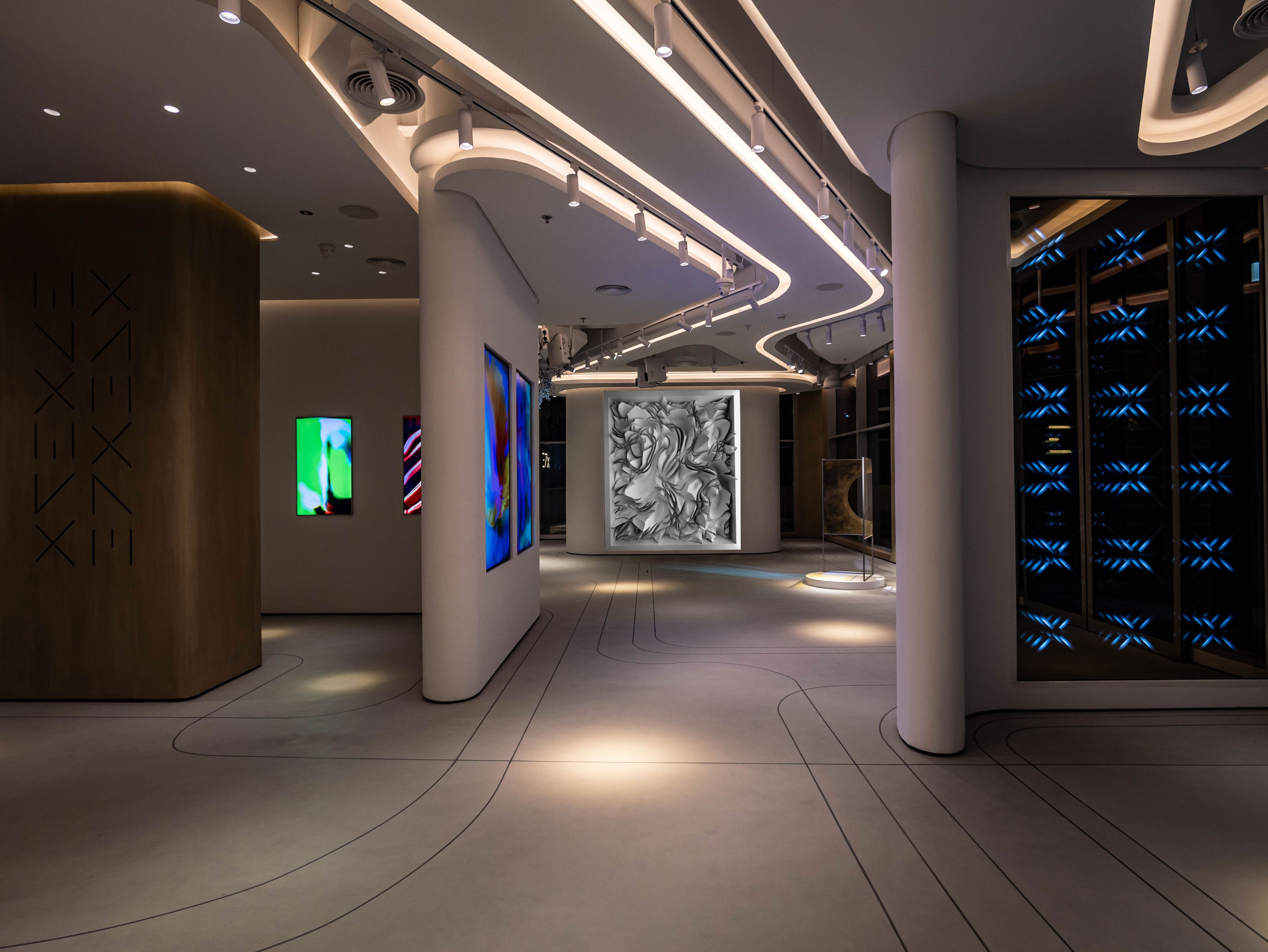 With light, we focused on painting art objects according to their configuration and size. And we also emphasized the textures and surfaces of the space. All lamps are synchronized and controlled, connected to one control system, and can be adjusted remotely.
