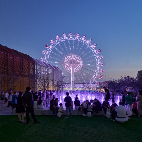 The Ferris wheel is an expressive graphic canvas., Luminaires were carefully integrated to its spokes to minimize visual impact to riders, enabling the enjoyment of the city nightscape from within the capsules.
