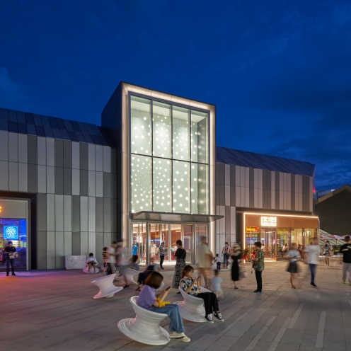 The façade lighting at the two main entrances expresses the contrast of the architecture –the rounded west entrance is dynamic and energetic, with integrated lighting creating a sense of flow and rhythm, while the east entrances are calm and inviting, with indirect lighting to accentuate impressive giant roof forms inspired by Ningbo’s historical architecture to welcome visitors.