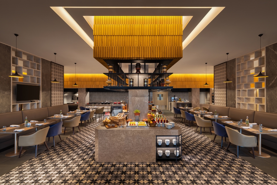 Entry DescriptionThis renovated hotel demanded a graceful facade illumination that would complement the its own history. The main facade was naturally illuminated with interior lighting from windows and required minimal external treatment such as the narrow bands below windows illuminated with sleek linear grazers. Temple gopuram-inspired design of the reception back drop wall was illuminated using special linear power grazer luminaires. Custom-designed decorative chandelier in the lobby is another interpretation of an inverted gopuram. Adjustable pull-out spotlights neatly concealed within ceiling slots illuminate the lounge area. Indirect lighting using coves is the primary source of illumination supplemented by decorative pendants with LED filament lamps that provide a retro look for the all-day dining. Magnetic track-mounted mini-spotlights illuminate buffet counters. Artwork on banquet pre-function walls are illuminated with same linear power grazer luminaires used in lobby. Diffuse and indirect lighting in the form of custom linear profiles and cove lighting respectively is used wherever possible. The elaborate glass-metal chandelier is main focal point in large banquet hall. Smaller halls are all illuminated with a combination of ceiling coves and adjustable pull-out spotlights. Simple yet stylised lighting is used throughout the hotel provides a unified look of tradition and modernity.