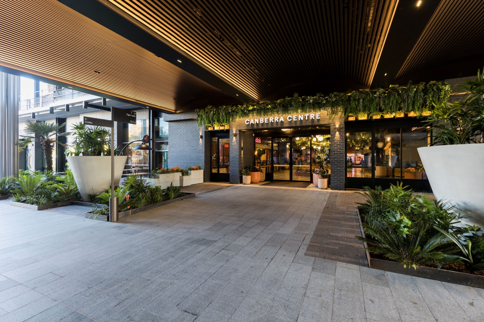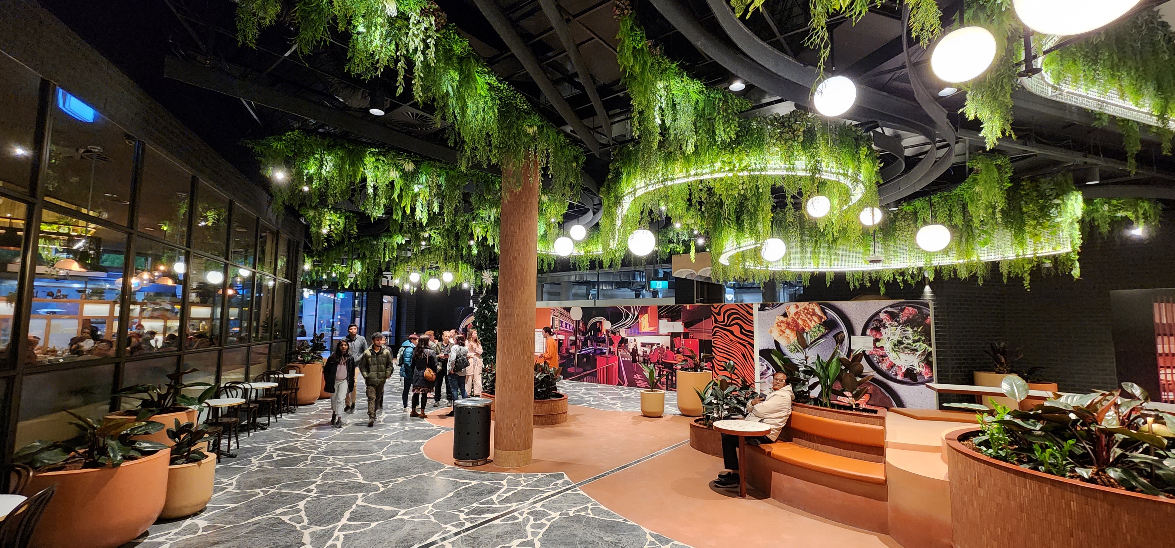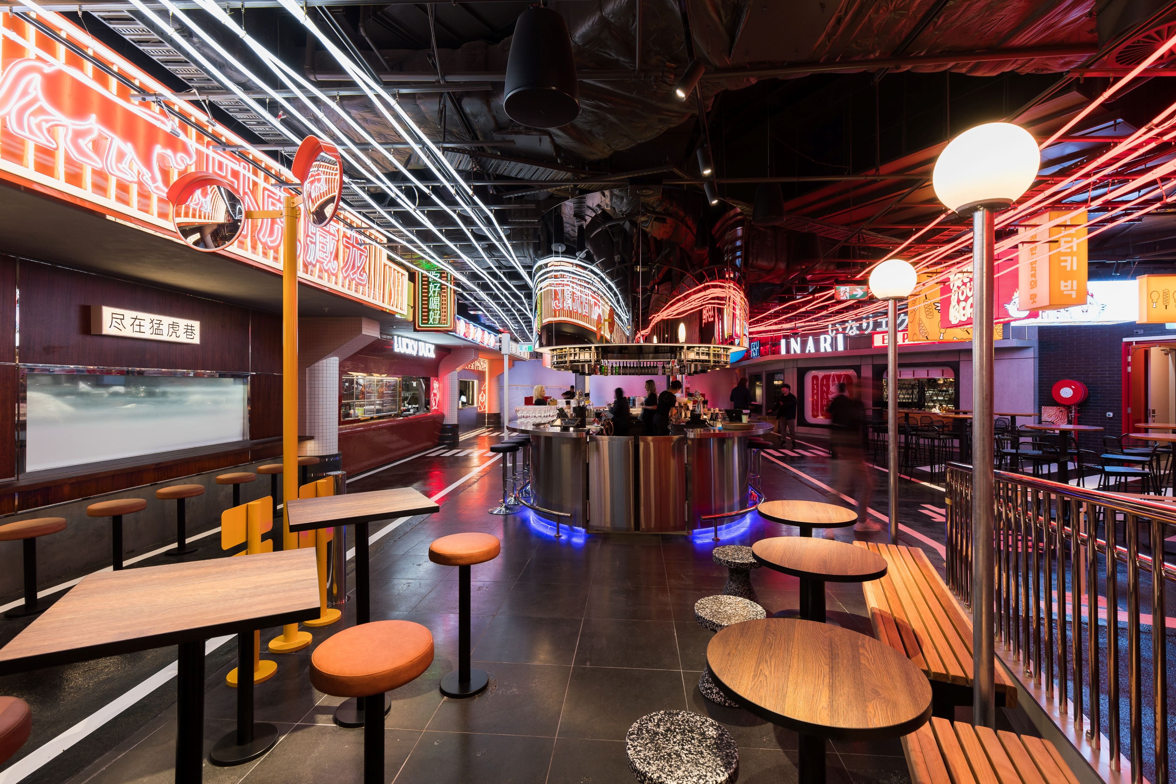 Tiger Lane is a bustling dining precinct. Our team designed the interior and exterior spaces of the common areas and two venues within this vibrant area. The ID intent was to create an authentic Asian street atmosphere in the dining area. We faced a few challenges such as developing a custom lighting installation resembling car light trails as well as limiting the bleaching effect due to the vast amount of backlit signages. The successful outcome was due to mock-ups, a careful luminaire selection to balance ambiance and accent lighting and a thoughtful commissioning process. In juxtaposition with the urban look of the Asian-themed precinct sits the commercial arcade where the ID aim was to create a magical outdoor landscape. Suspended gantries and creepers plants have been highlighted with close-range adjustable micro-spotlights and linear LED. Suspended Decorative Pendants provide ambiance lighting.To complement the outdoor look a few garden mushroom luminaires have been integrated within the low-level planters. The final touch to this precinct was the covered entrance to the arcade. A gentle wash of the batten ceiling and downlights along the spines provide both ambience and functional lighting.