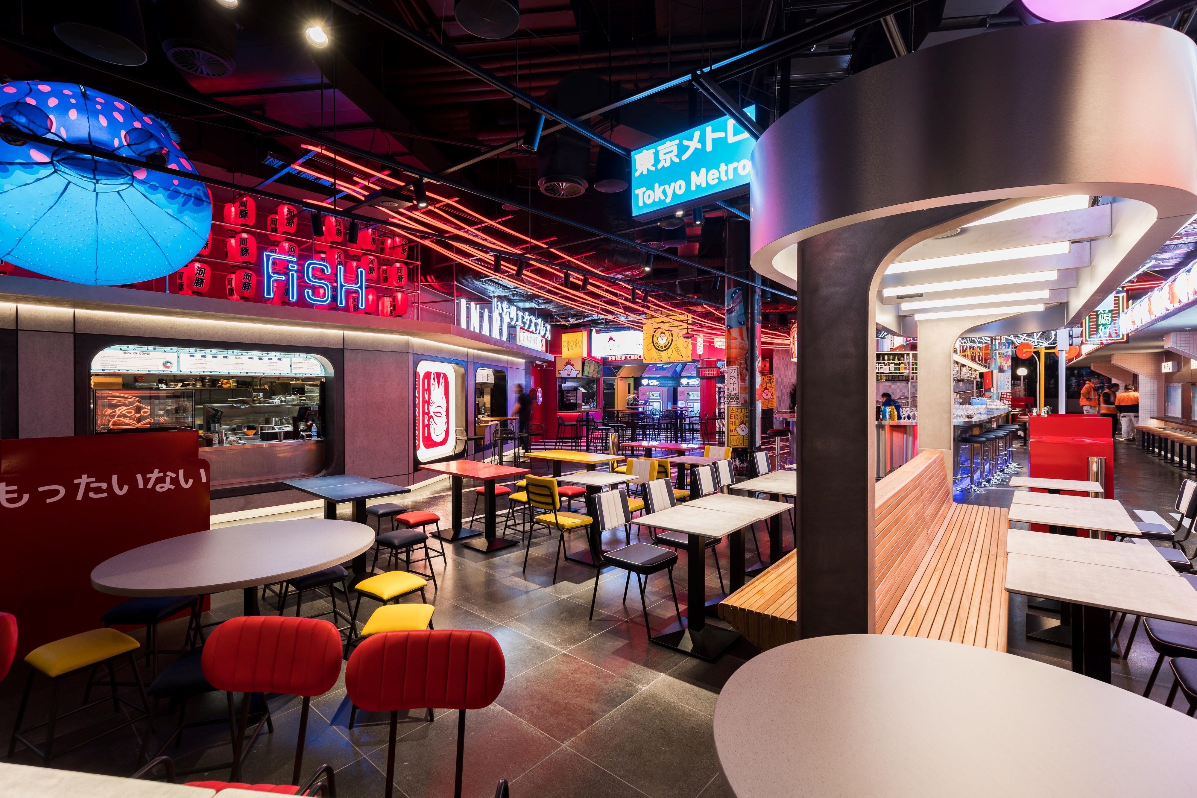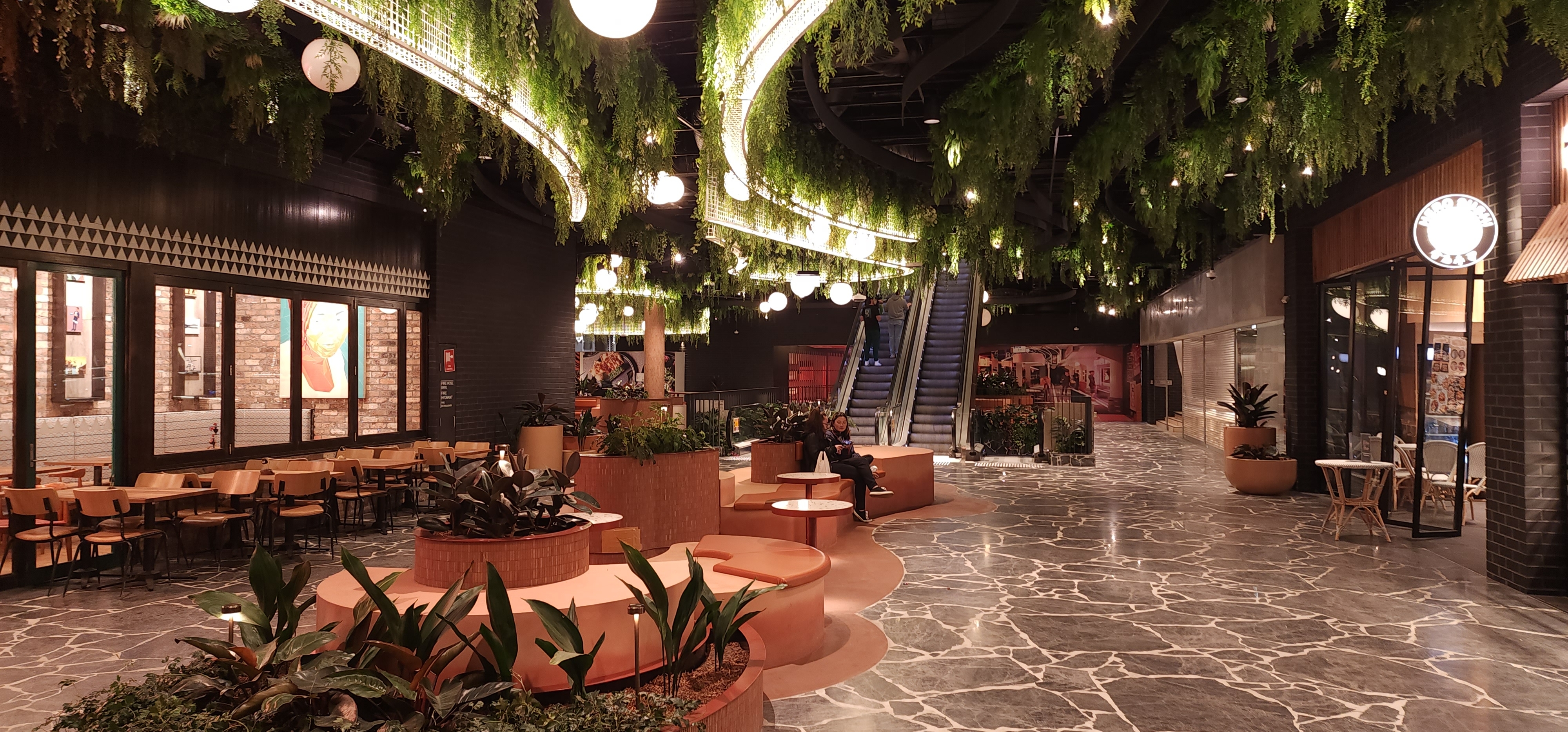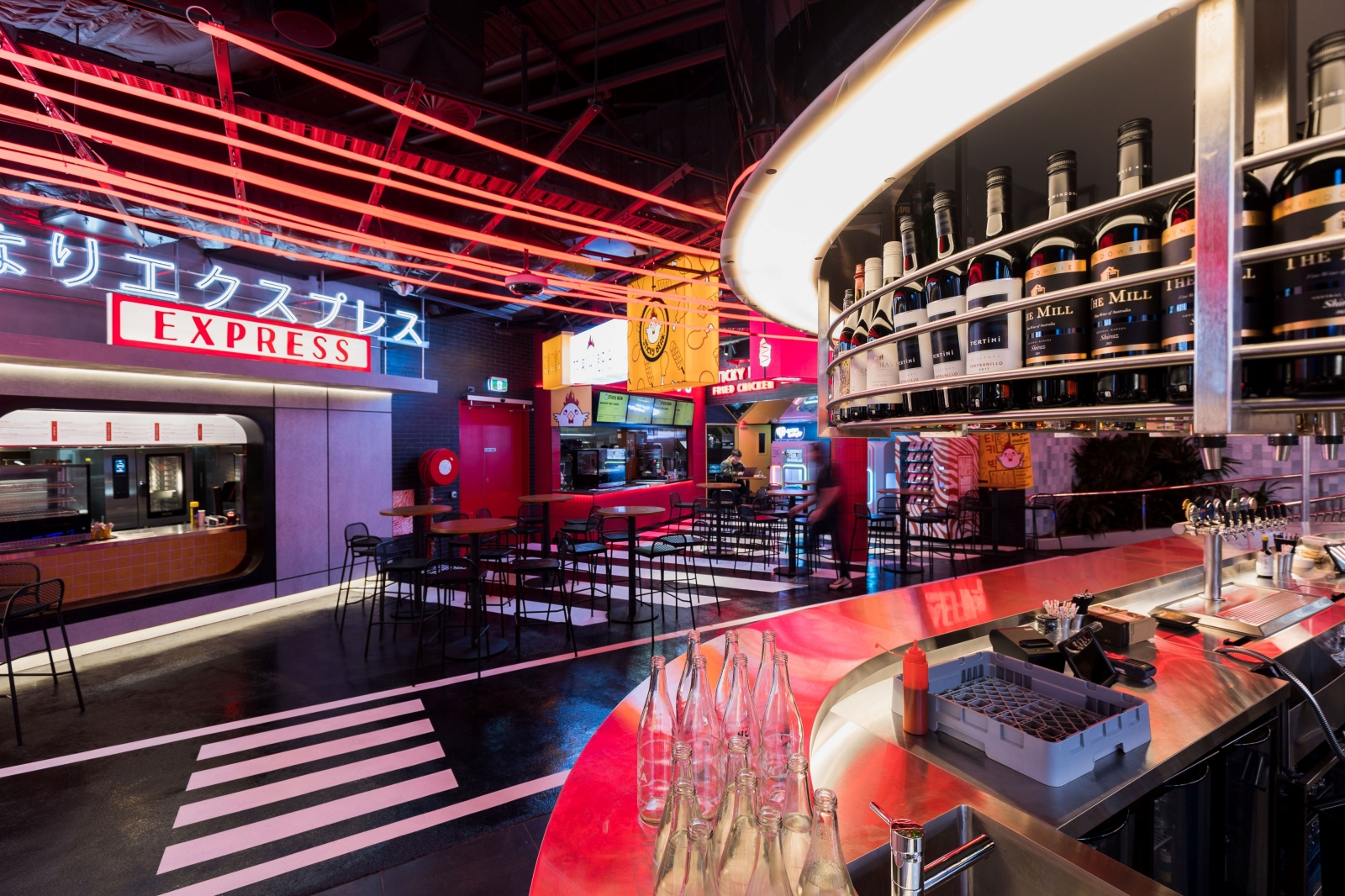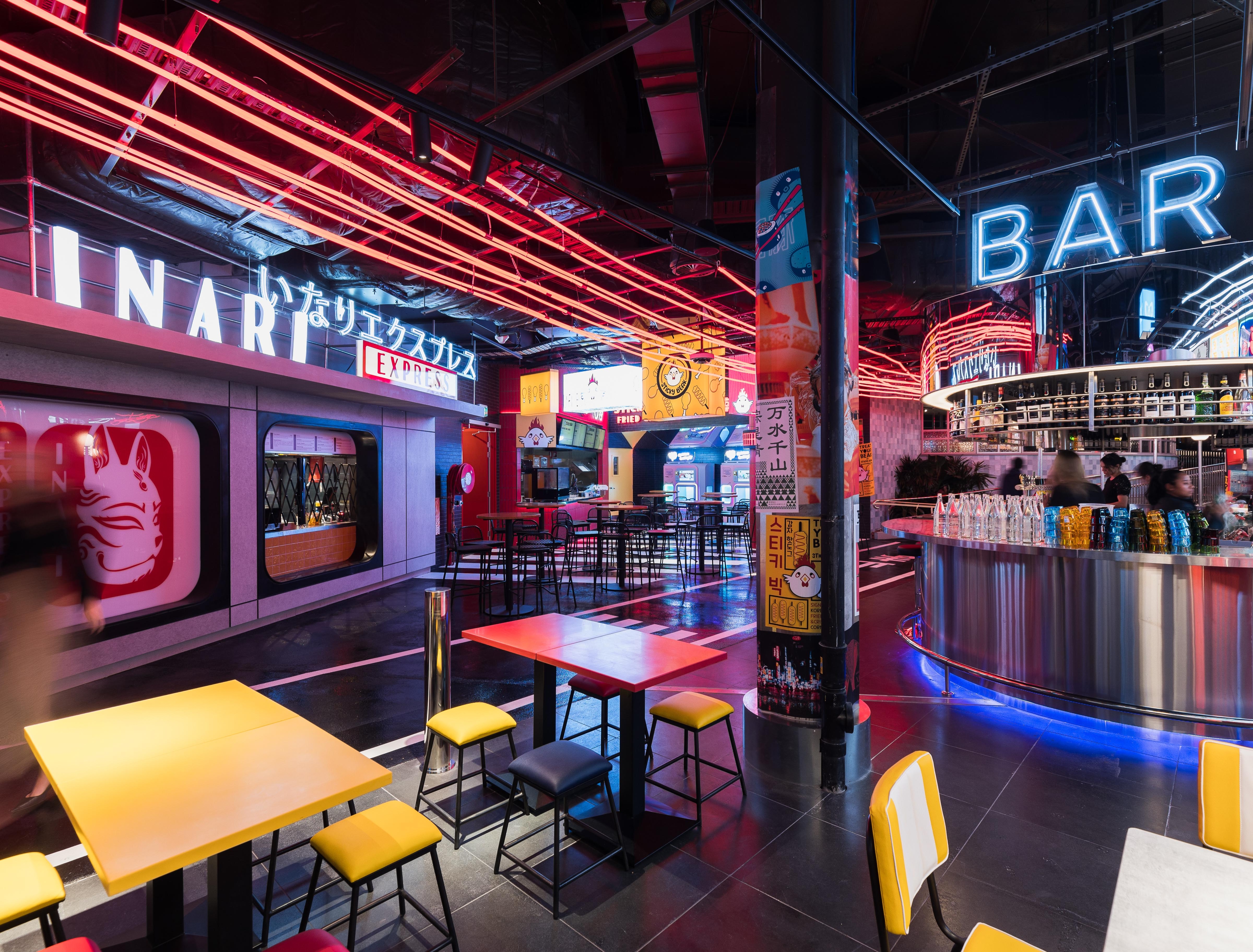 Tiger Lane is a bustling dining precinct. Our team designed the interior and exterior spaces of the common areas and two venues within this vibrant area. The ID intent was to create an authentic Asian street atmosphere in the dining area. We faced a few challenges such as developing a custom lighting installation resembling car light trails as well as limiting the bleaching effect due to the vast amount of backlit signages. The successful outcome was due to mock-ups, a careful luminaire selection to balance ambiance and accent lighting and a thoughtful commissioning process. In juxtaposition with the urban look of the Asian-themed precinct sits the commercial arcade where the ID aim was to create a magical outdoor landscape. Suspended gantries and creepers plants have been highlighted with close-range adjustable micro-spotlights and linear LED. Suspended Decorative Pendants provide ambiance lighting.To complement the outdoor look a few garden mushroom luminaires have been integrated within the low-level planters. The final touch to this precinct was the covered entrance to the arcade. A gentle wash of the batten ceiling and downlights along the spines provide both ambience and functional lighting.