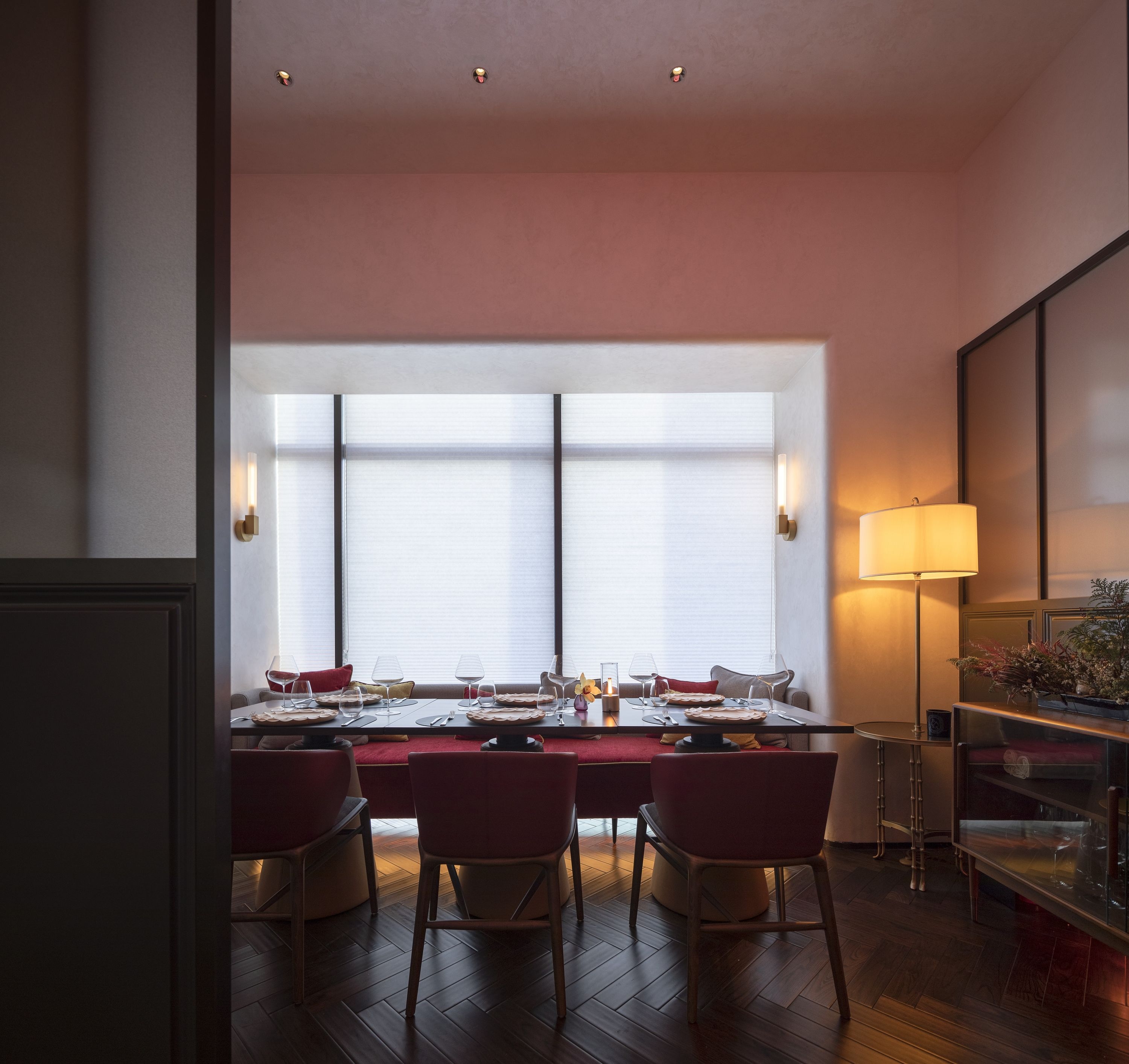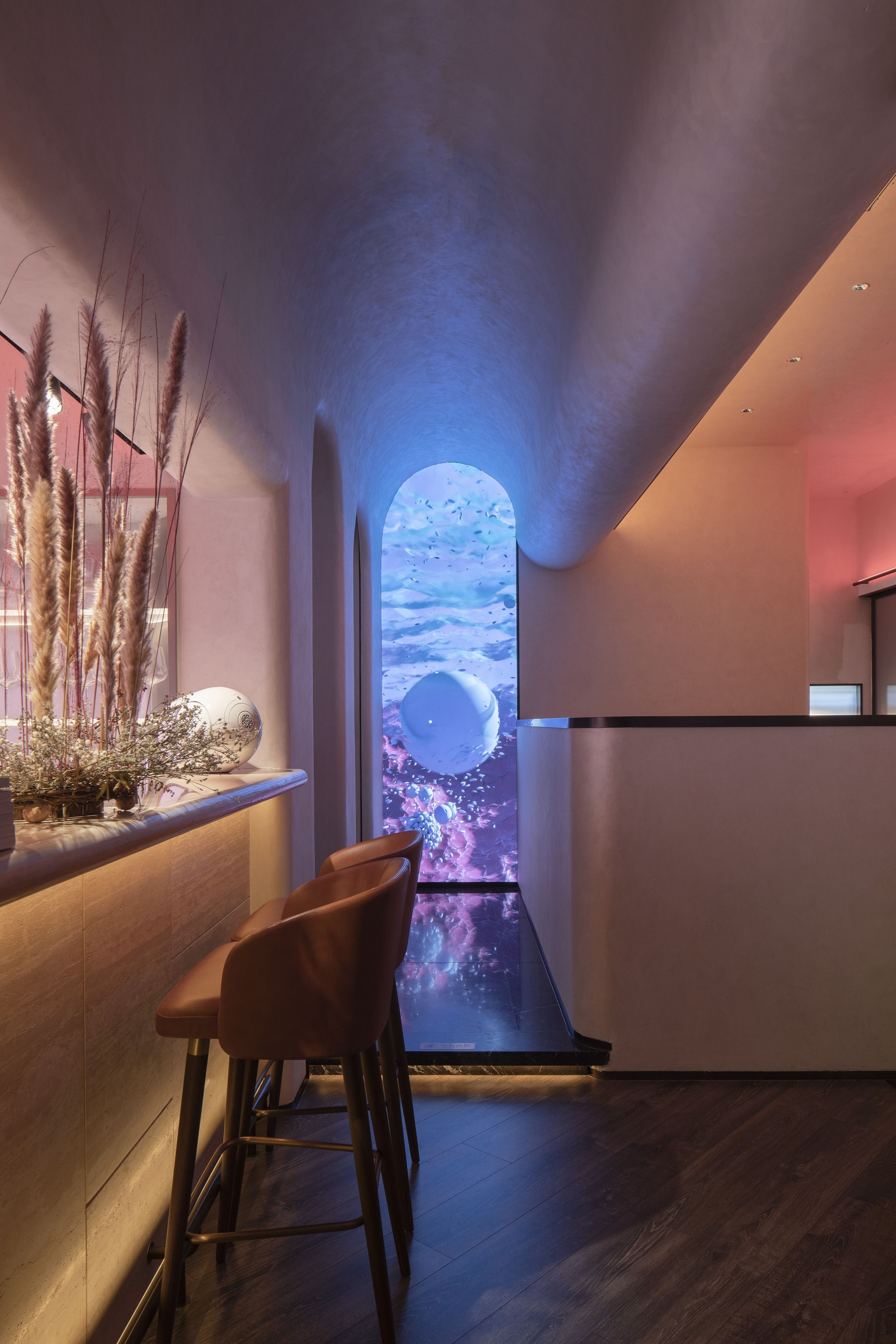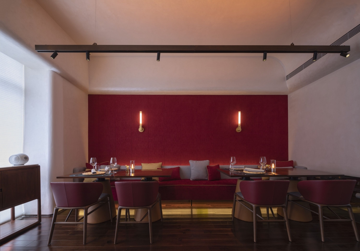 The restaurant only has one-way daylight on the west side. The facade and top of the east and west sides adopt a soothing curved surface. Under the curved surface, the full-color light source uses warm light with different saturation and hue. Combined with diffuse reflection of latex paint, like the sunset glow into the general natural, exudes the unique romantic temperament of French food.