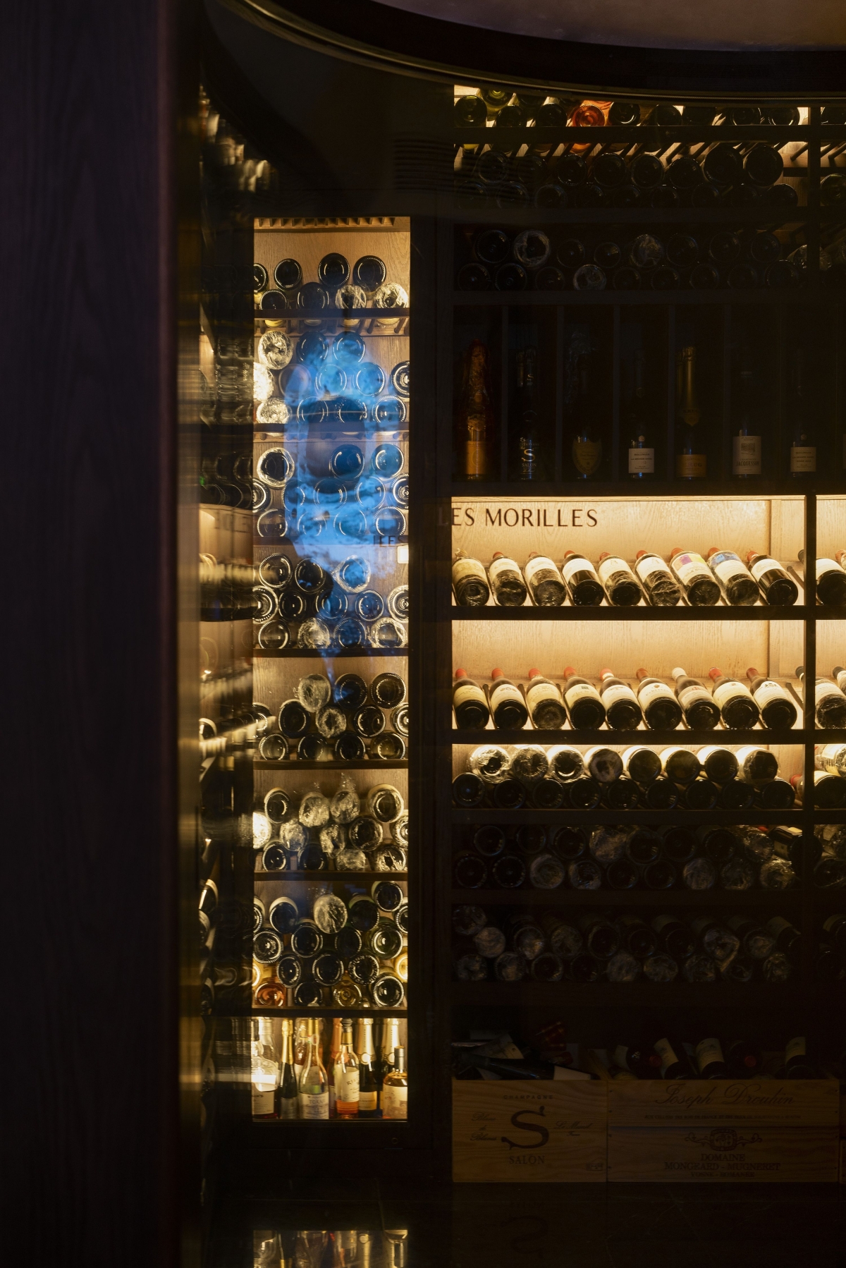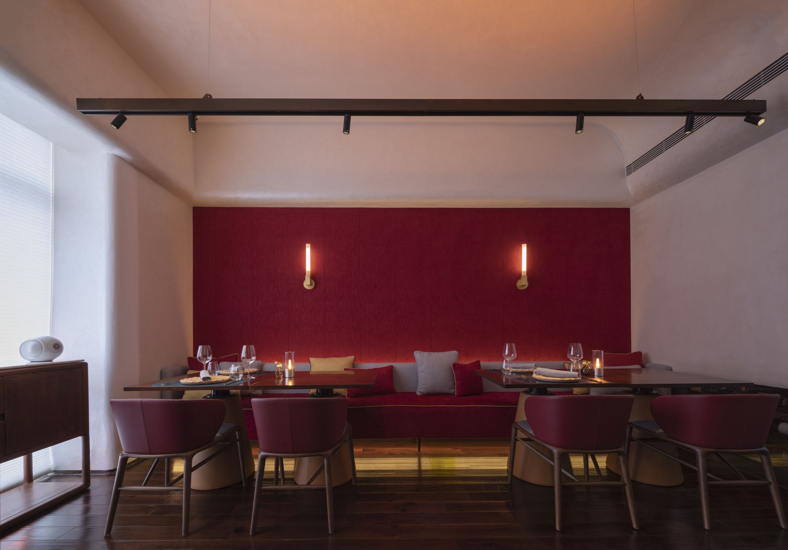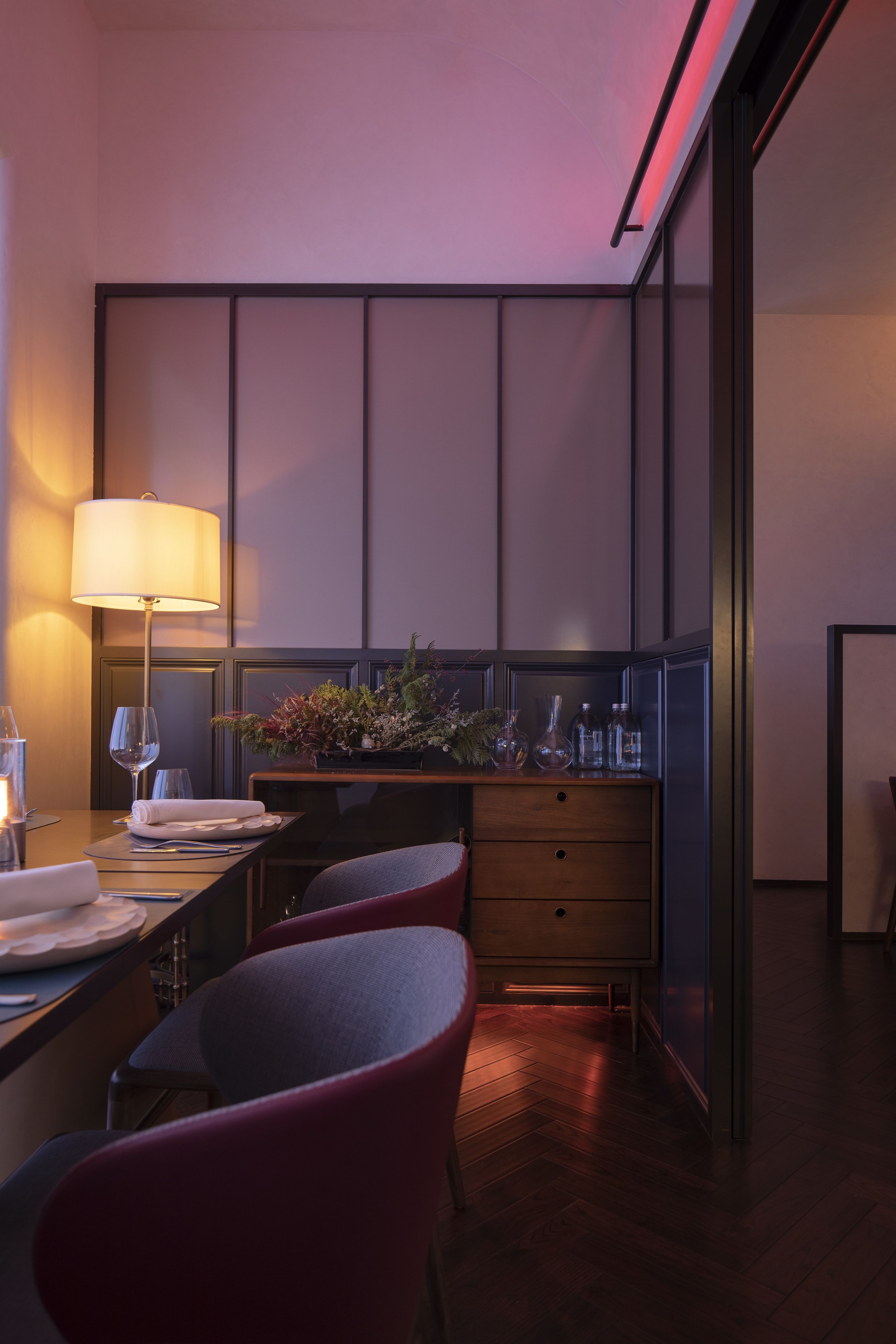 The private rooms use a lifting integrated lighting system, full color light that escapes upward, and track lighting embedded at the bottom, giving tabletop and ornaments.