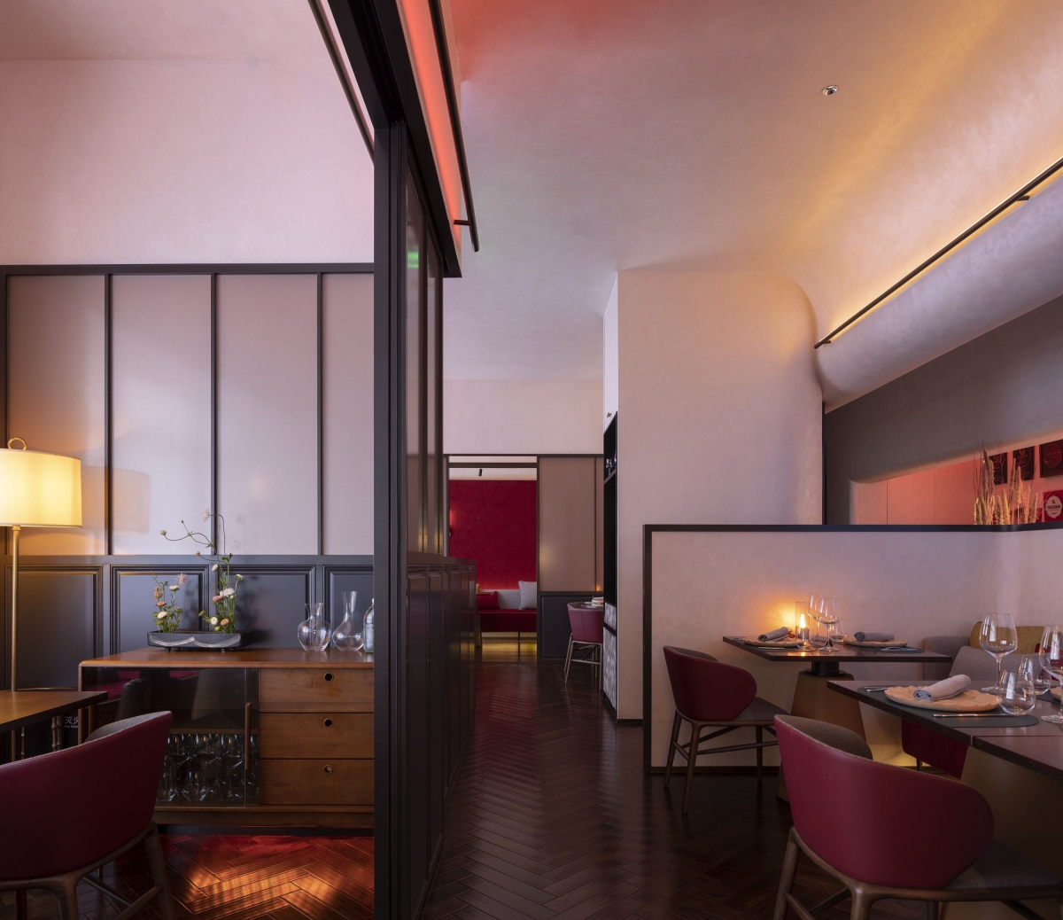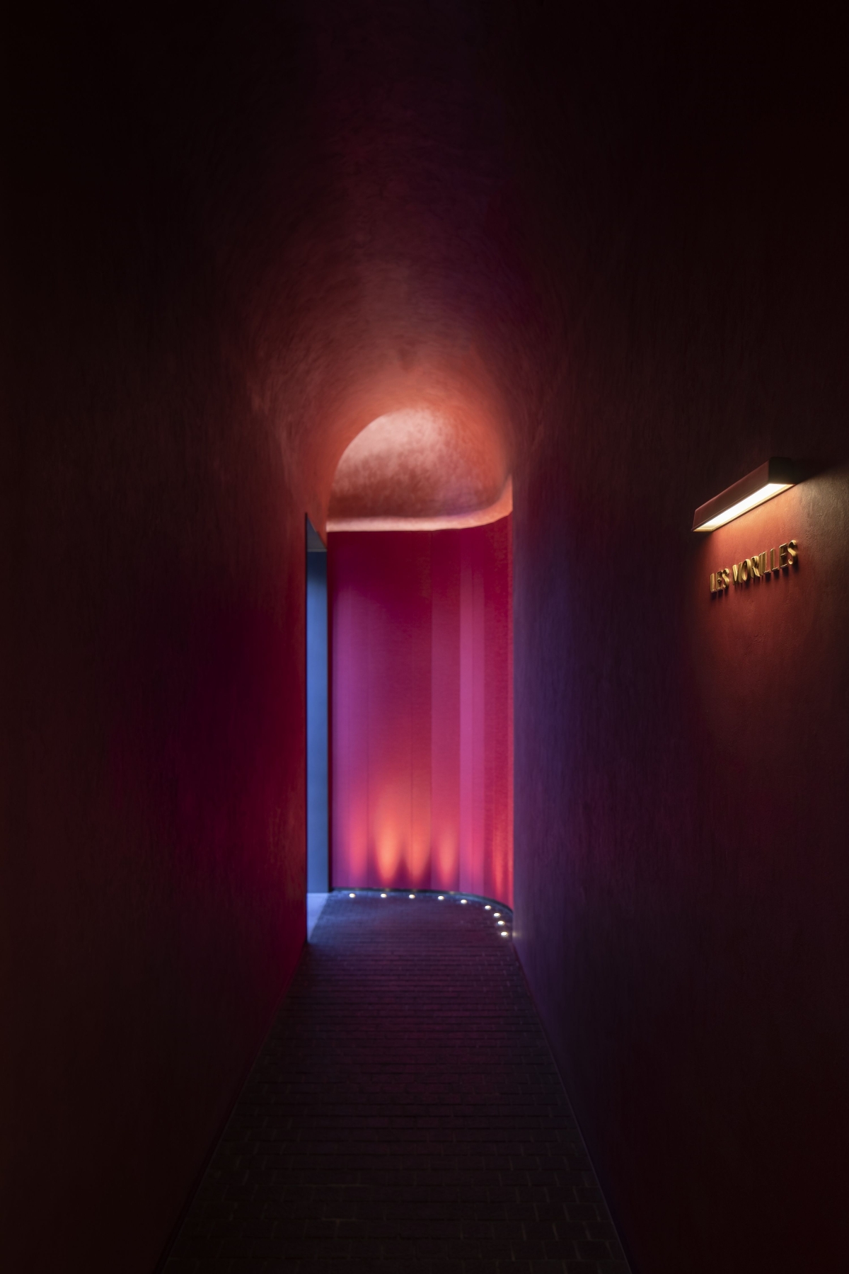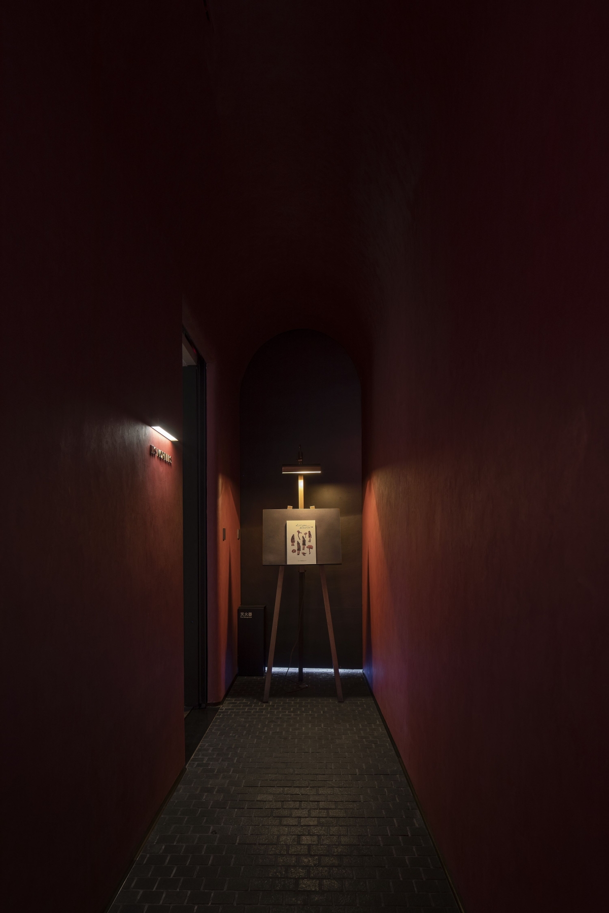 The entrance floor light illuminates the red wall and illuminates the vaulted top. The warm light of the wall lamp dye the LOGO, the shimmer of the stone floor and the dark red wall create the mystery of the deep alley.