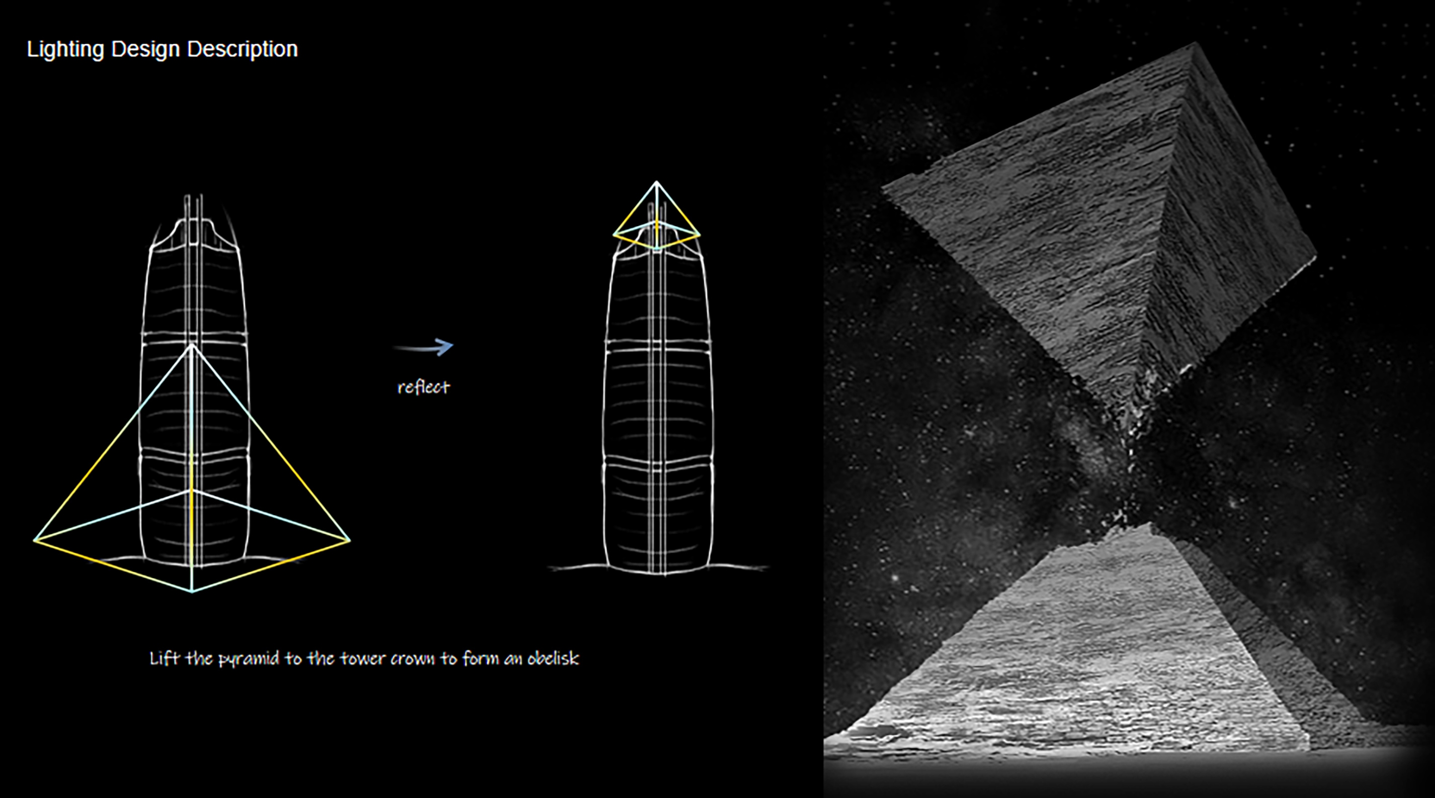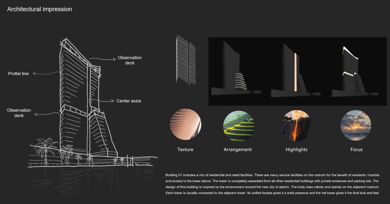 The design team hopes to conceive the night view lighting for the landmark buildings of Alamein based on the city’s cultural context. The design is meant to showcase the city’s local features through lighting and the interaction between light and color. The intention of the lighting design is to create iconic night views that will bring an upbeat spirit to Alamein, where the wounds left by war are blossoming into life and hope.