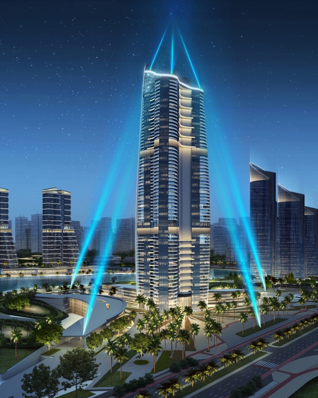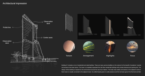 At the initial stage of the lighting design, the designers focus on analyzing the architectural concept that places a 300-meter-tall main building in the heart of the complex while arranging four apartment buildings across a lake. The lighting design respects the architectural expression in detail. It carefully incorporates the outline of the “Flower Of Life”, a natural symbol for the buildings, and underlines the architectural features through a delicate yet simplistic lighting approach to convey hopes for a beautiful future.