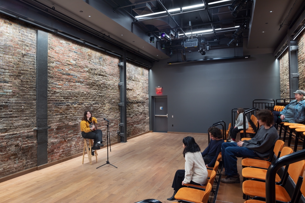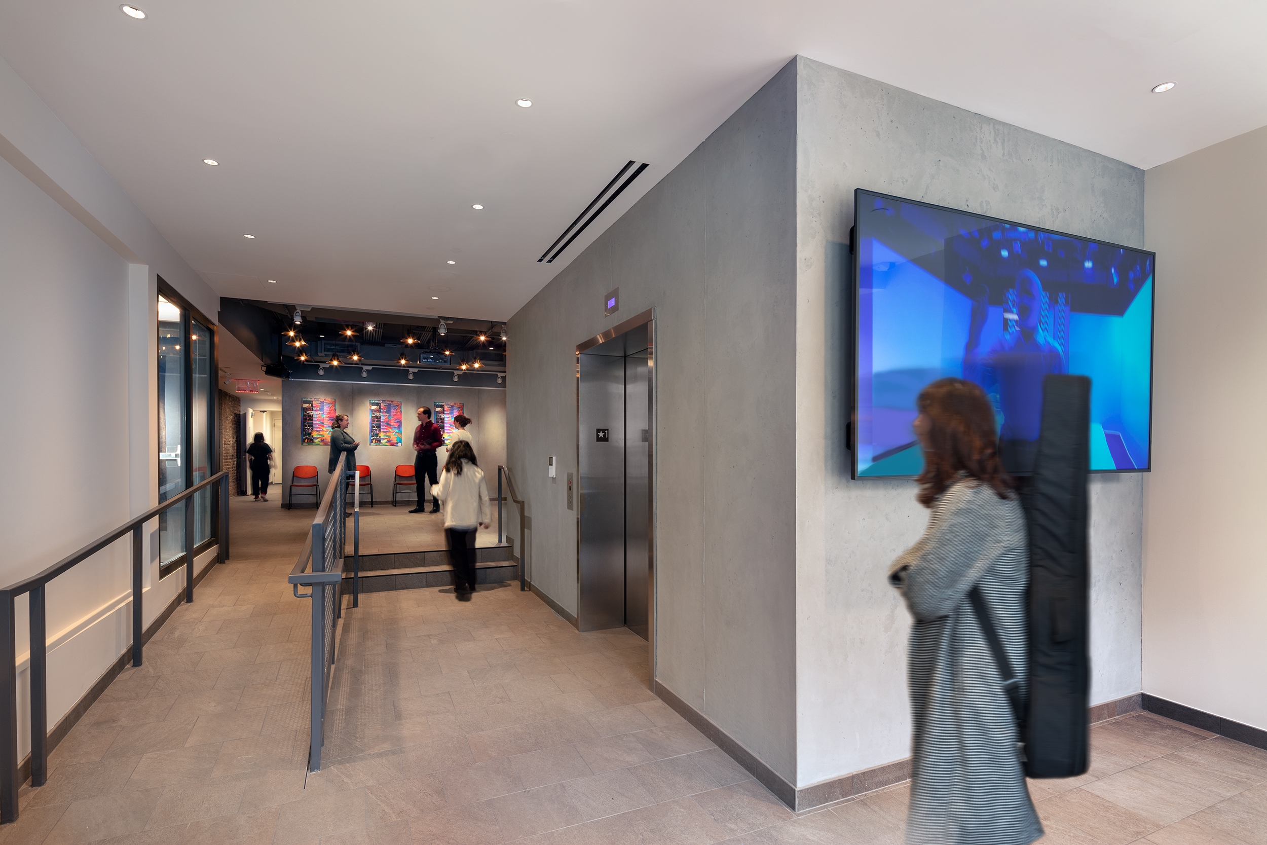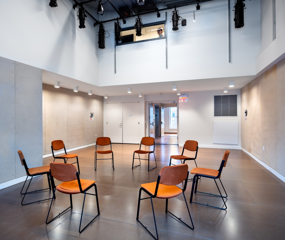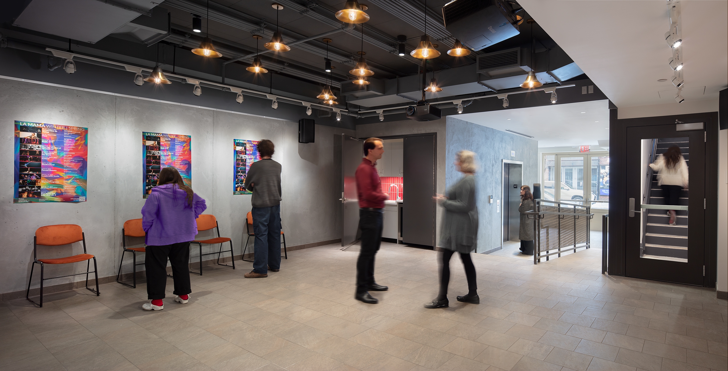 Simple yet elegant lighting overcomes design challenges that include exposed ceilings, a lack of recessing space as seen in the double-height multi-purpose studio on the third floor, the building’s landmark designation, and a limited budget. The lighting is a key element in a re-energized venue that reflects the theatre group’s mission: embracing its community and empowering all artists.